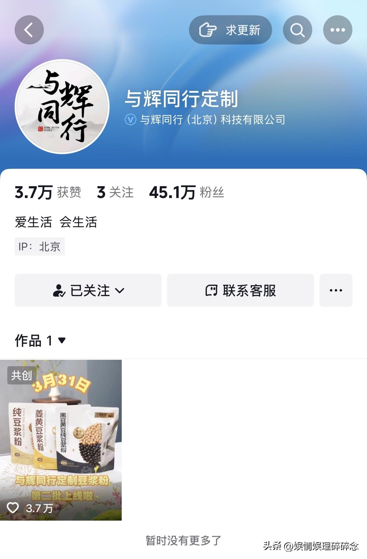 宇辉今天在直播间谈到了新账号“与辉同行定制”,是想把定制品验厂的过程,整改的项目等,展示给大家看。 宇辉团队对定制品验厂过程实行百分制评分制,对于达到85分及以上的,可以整改,如果85分以下的,连整改的机会都没有了。 宇辉坦言,几乎没有得到满分的。整改完成后,才能投入运营,宇辉团队也会派工作人员在现场盯紧整个生产过程。 设立新账号的目的,也是为了把这些幕后故事讲给大家听,同时听取大家对产品的诉求。但是,大家一定要认准蓝V认证的账号。 目前,“与辉同行定制”仅发布了一个定制豆浆的视频,粉丝已经达到45.1万,点赞达到3.7万。 懂行的人都知道,做定制难在品控,而宇辉选择把供应链最脆弱、最容易被忽视的环节摊在阳光下,接受大家的审视,这是对消费者的极致信任。