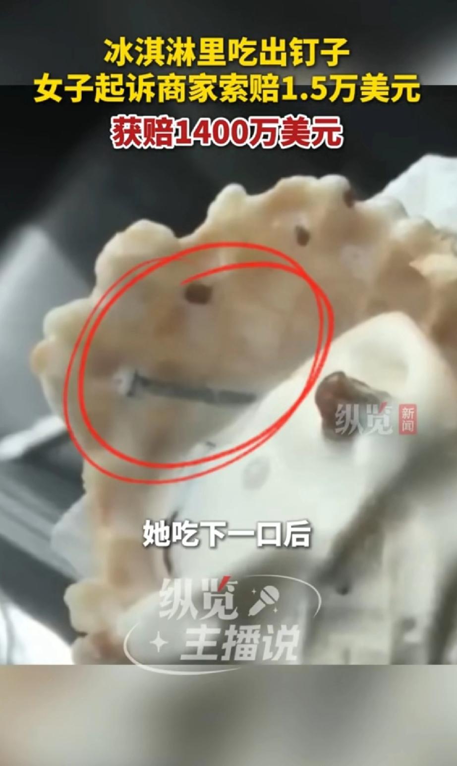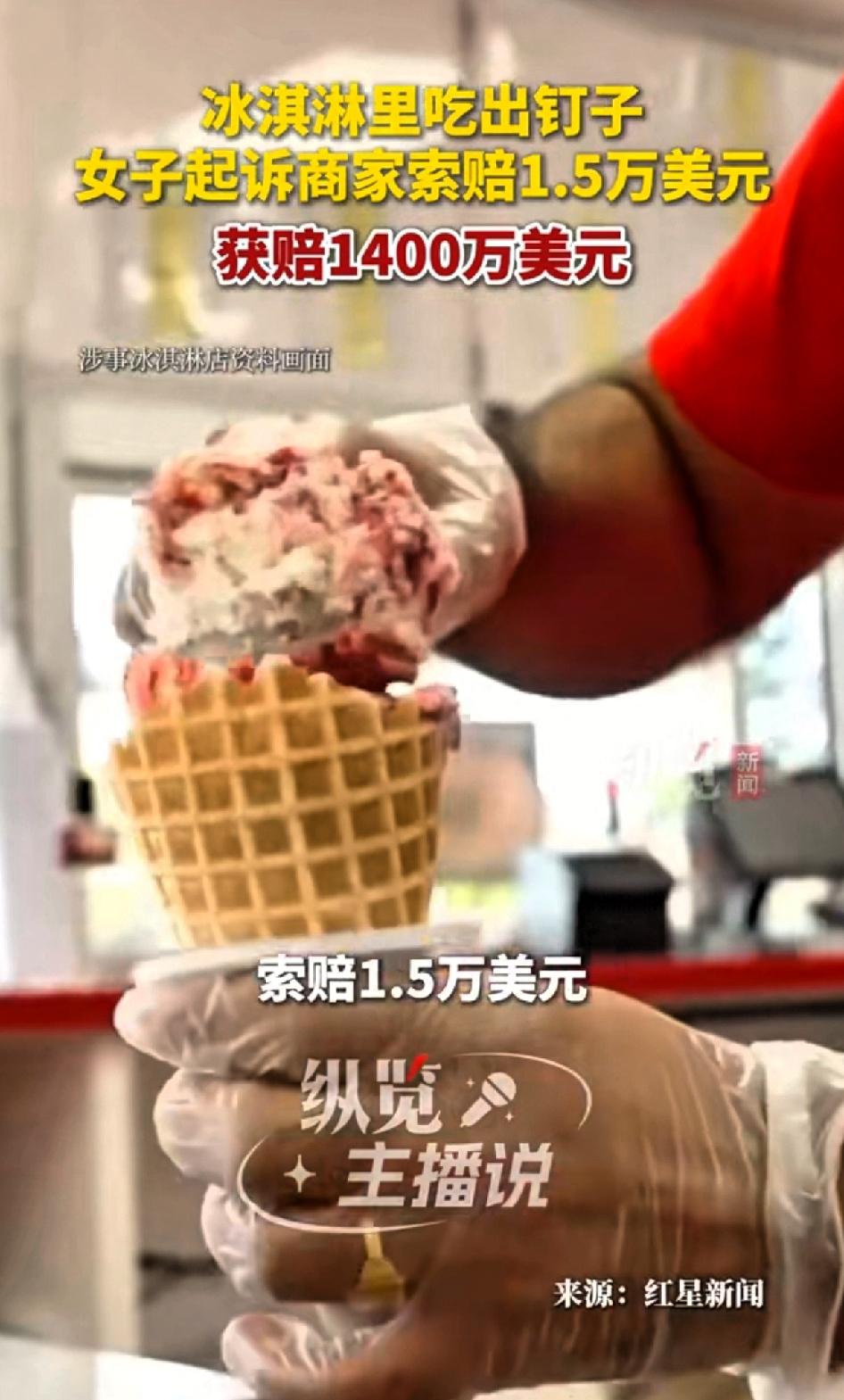 冰淇淋里吃出钉子,女子索赔商家赔偿1.5万美元,最终获赔1400万美元。 美国佛罗里达州女子布兰迪·巴克利可太倒霉了。2018年9月11日,她在一家连锁冰淇淋店买了份黄油山核桃冰淇淋。她先咬一口,感觉有硬物以为是坚果就吞了。后来在光线下才发现里面有金属钉。 去医院一查,她已吞下钉子,手术取出一根钉子和多块碎片。但这钉子让她头部、颈部等遭受严重且永久性损伤,还内出血、有静脉血栓,甚至失去生育能力。 2019年她起诉索赔1.5万美元,2026年3月28日,她最终获赔1400万美元。这食品卫生问题太可怕,商家可得长点心啊!