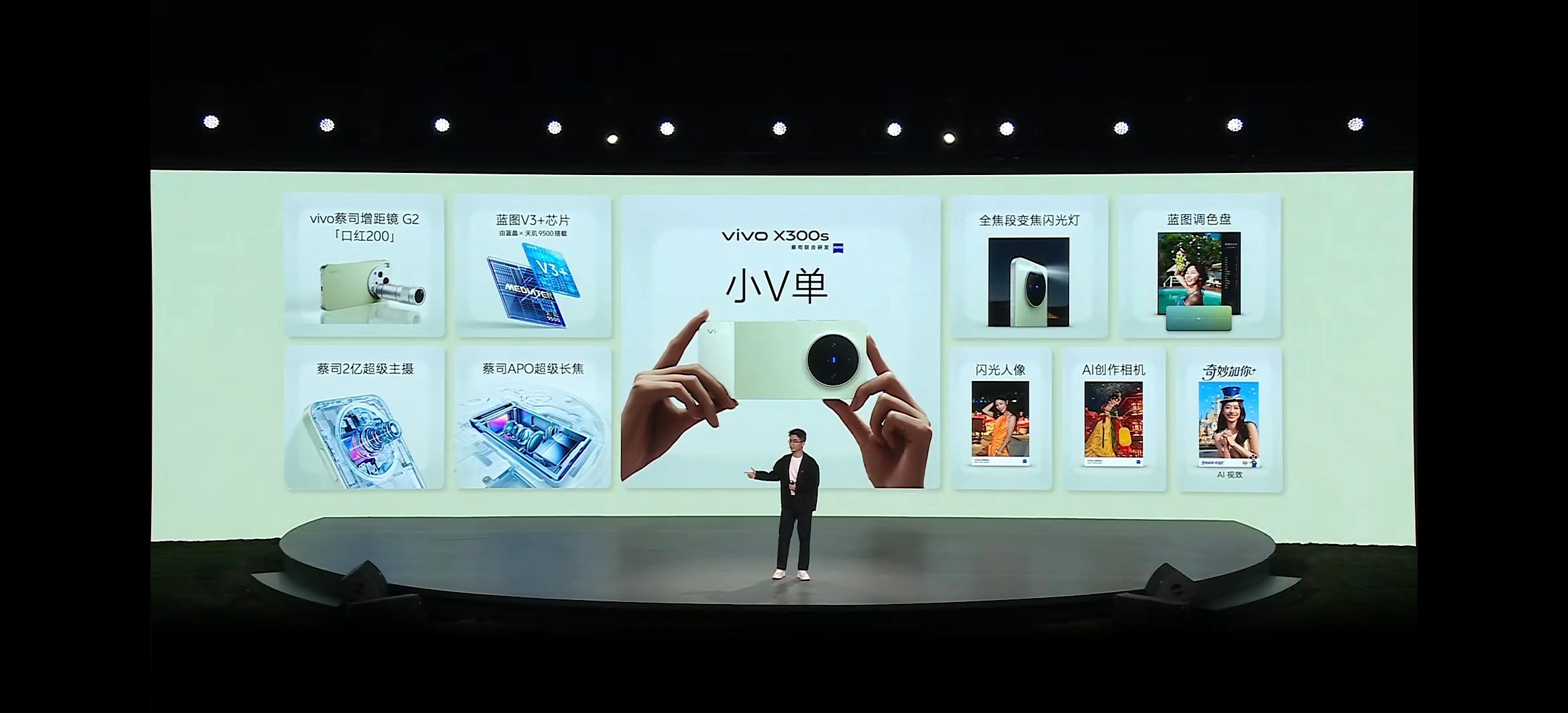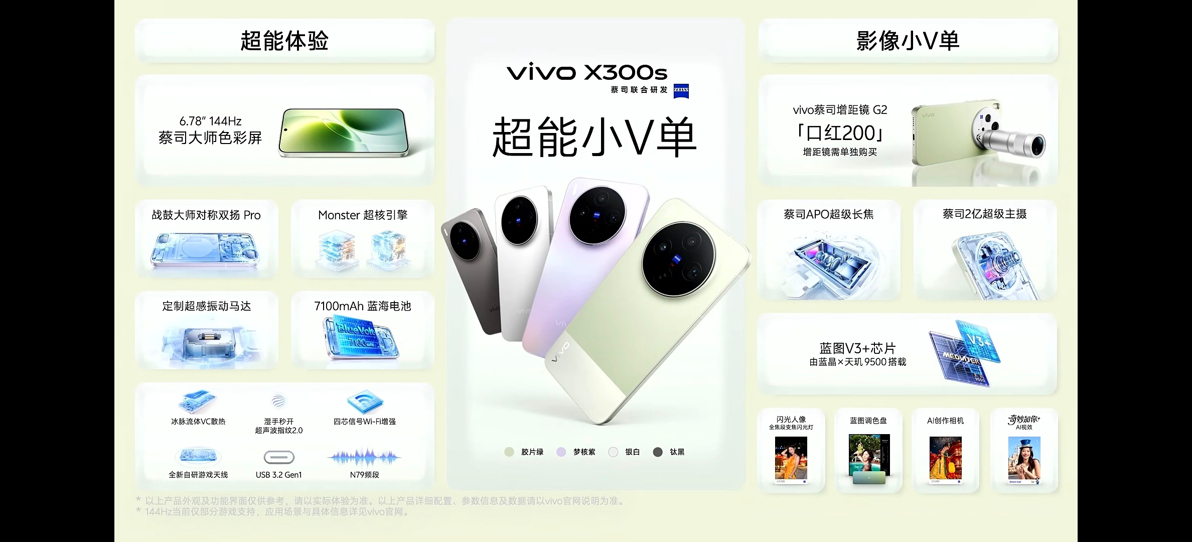 vivo X300s 超能小V单影像蔡司2亿主摄+蔡司APO超级长焦+蓝图影像芯片V3+,旗舰硬件稳稳出片X300 Ultra同款全焦段变焦闪光灯,闪光人像远近均匀十余种胶片风格,新增追光/浓郁,蓝图调色自由创作首发AI创作相机,4K高清直出,迪士尼AI视效趣味拉满支持口红200蔡司增距镜G2,更小更强,平时Super周末Ultra
