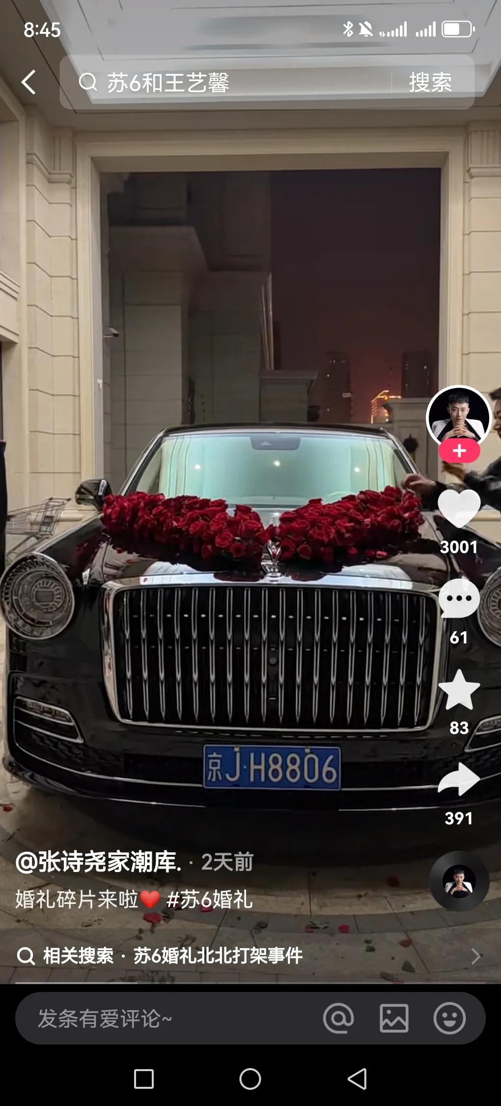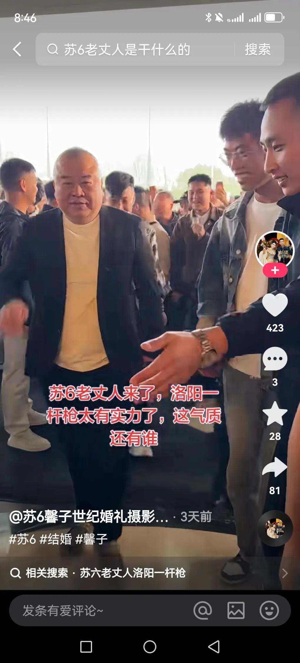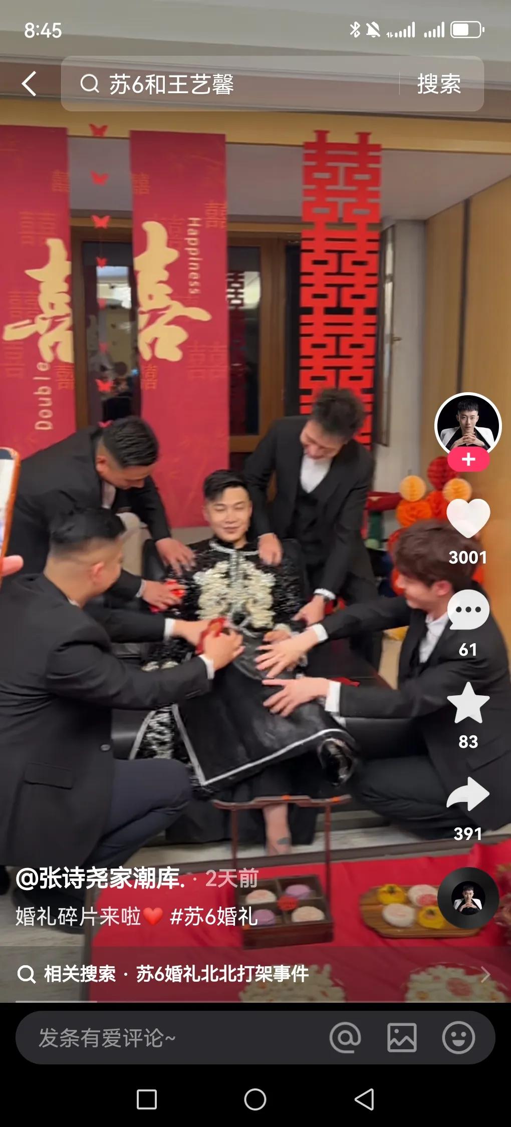 近日,知名网红苏6结婚张诗尧做伴郎,婚礼上居然还有人下跪拜苏6为师,气派十足,近千万红旗国礼做头车,后面跟着各种各款的劳斯莱斯,听说光这些车价值3个亿!各路网红都齐聚石家庄,这些网红大多数都是精神小伙,终是苏6动了情,轰动石家庄每座城,网上传一句话“一代强,二代磊,三代防”,这句话意思一代强,指刘华强,二代磊指狗磊,三代防之苏6,可见苏6在石家庄有画面的,但婚礼中出现了一场冲突,精神小伙北北和狗磊手下二驴产生矛盾,两方人马差点没控制住,后来被拉开,现在这社会可像以前,打架肯定是要惩罚的,所以两方没打起来,苏6婚礼也圆满结束了。