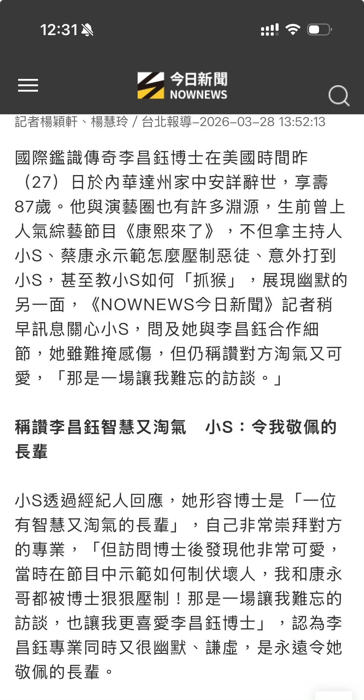 小S悼念李昌鈺,回忆康熙录影时光,S感性地说,那是一场让她难忘的访谈。 她形容博士是「一位有智慧又淘气的长辈」,自己非常崇拜对方的专业,「但访问博士后发现他非常可爱,当时在节目中示范如何制伏坏人,我和康永哥都被博士狠狠压制!那是一场让我难忘的访谈,也让我更喜爱李昌钰博士」,认为李昌钰专业同时又很幽默、谦虚,是永远令她敬佩的长辈。