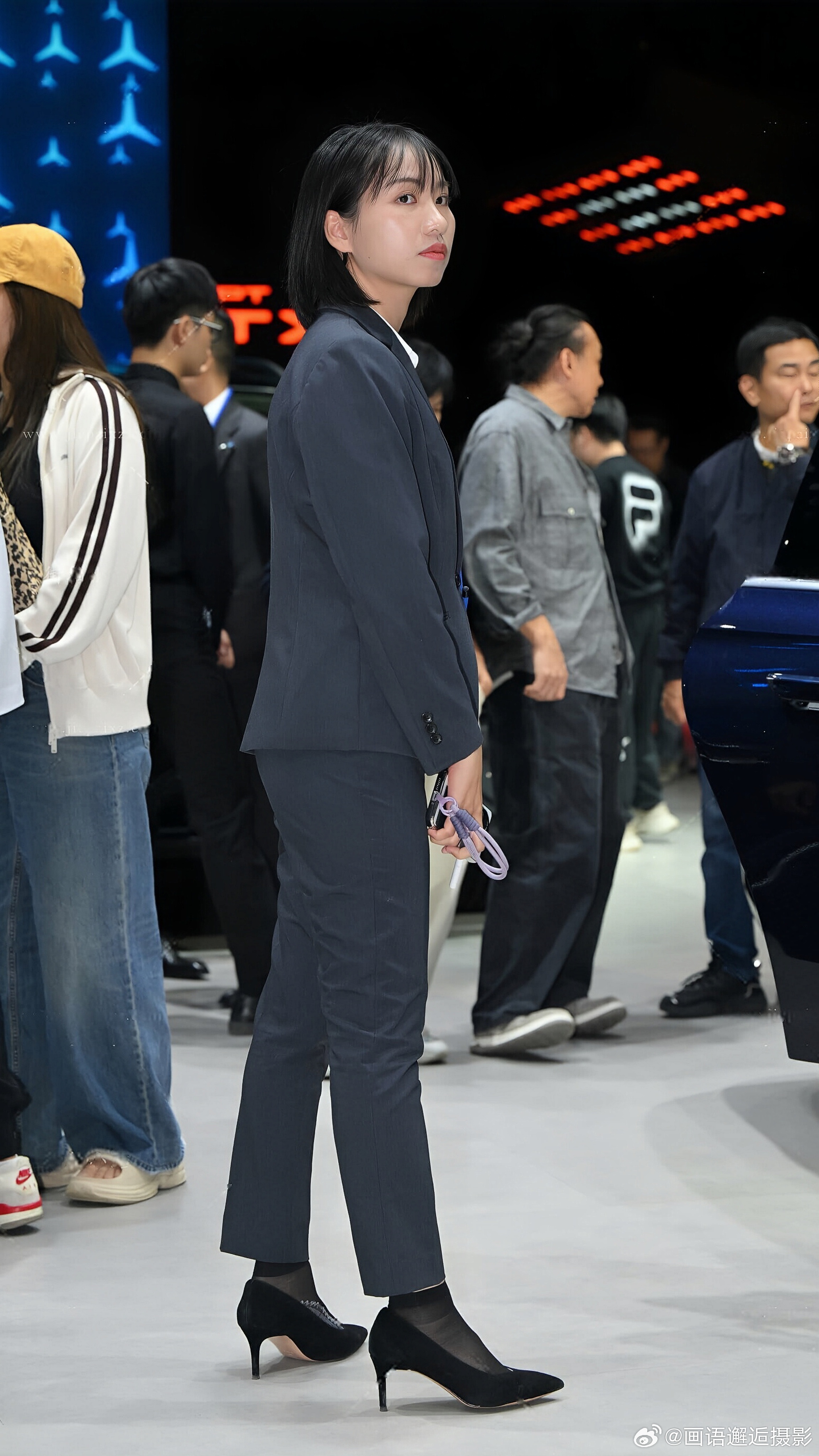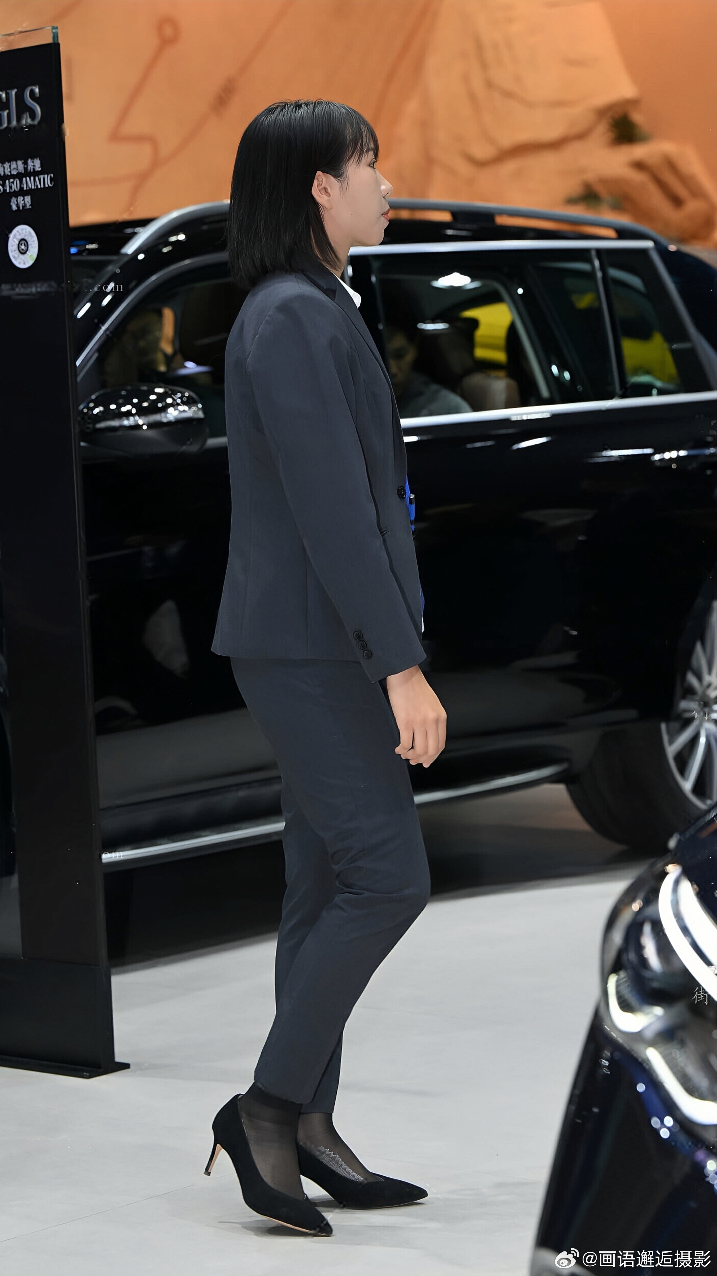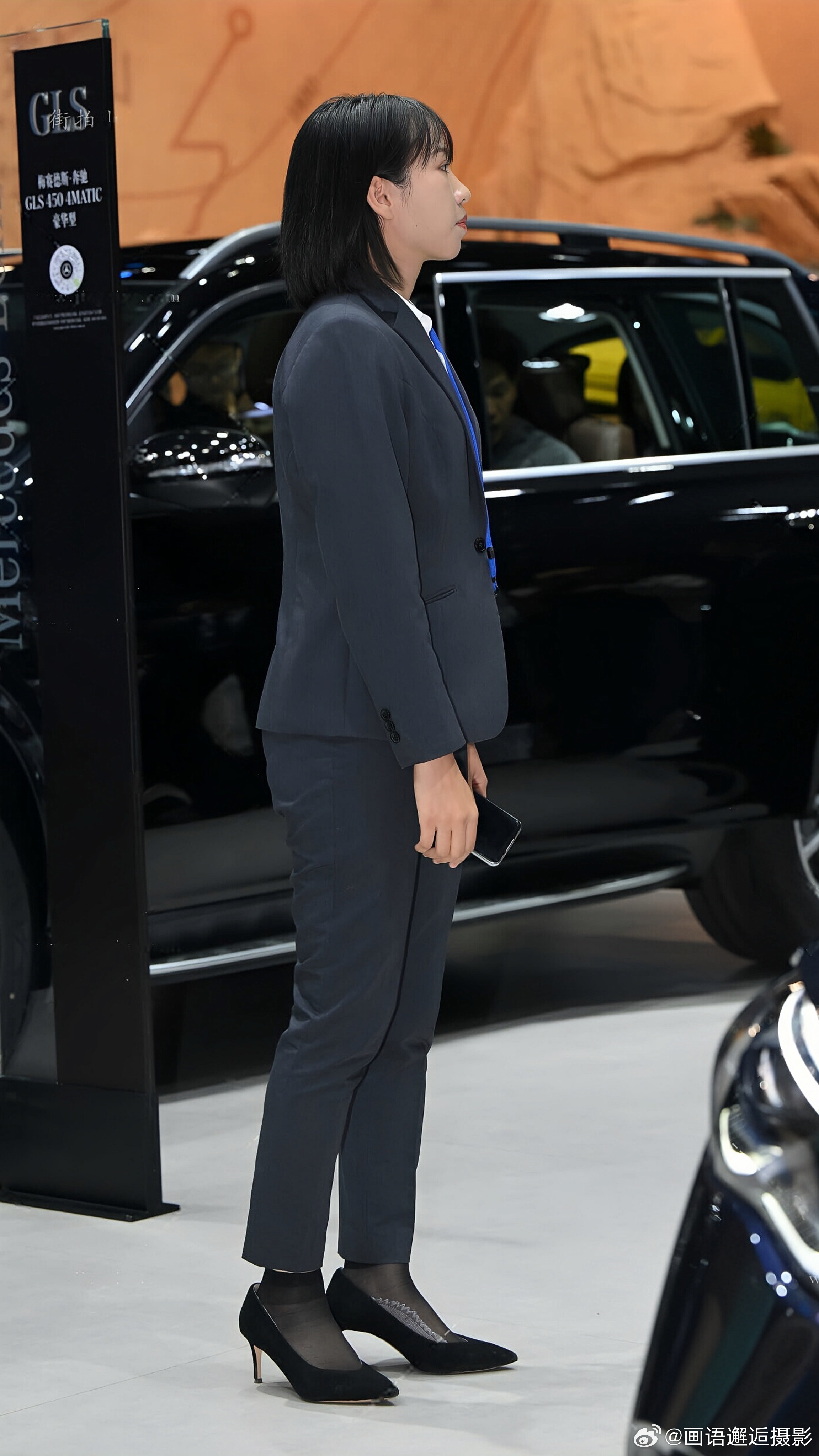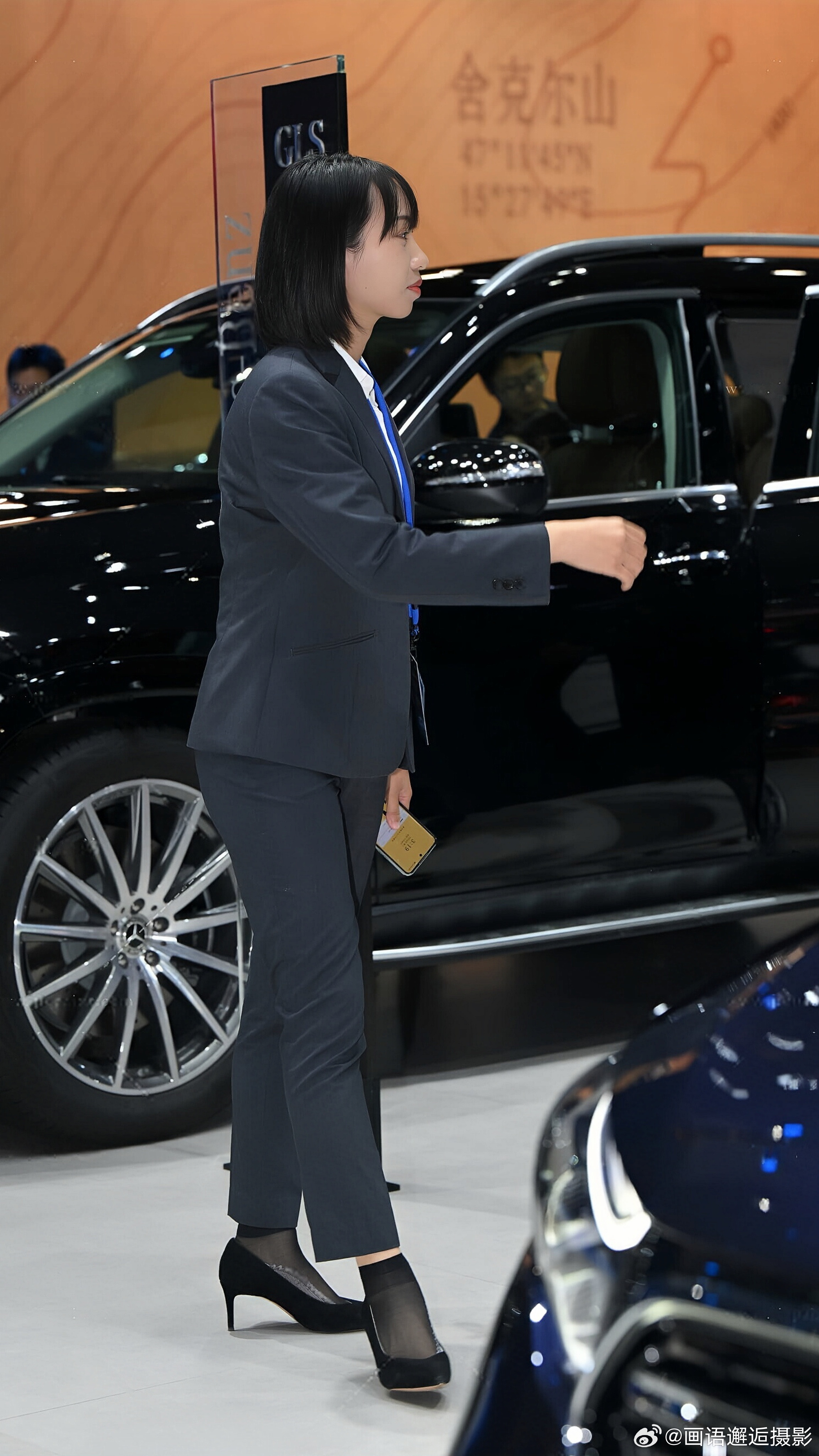 发现你的魅力 藏青色西装套装内搭白衬衫,佩戴蓝色挂绳,搭配黑色高跟鞋与丝袜,尽显专业干练。