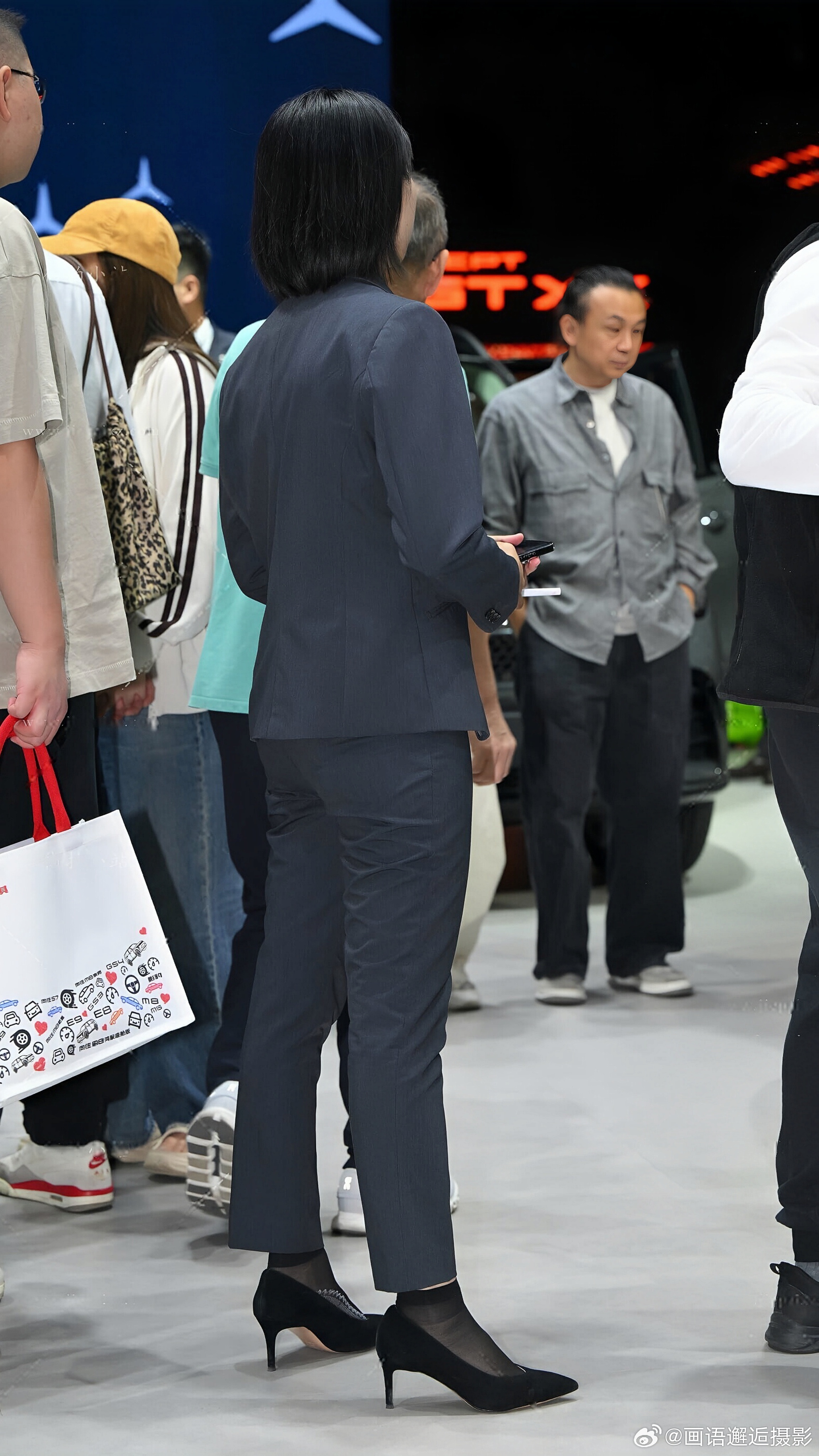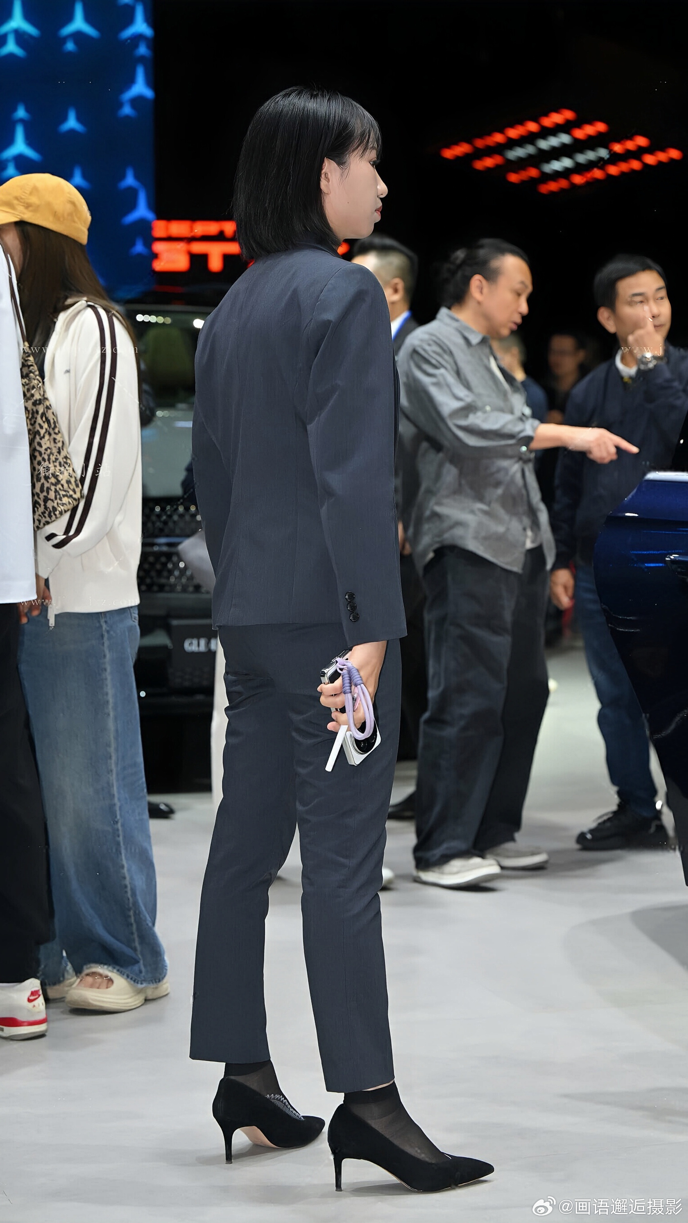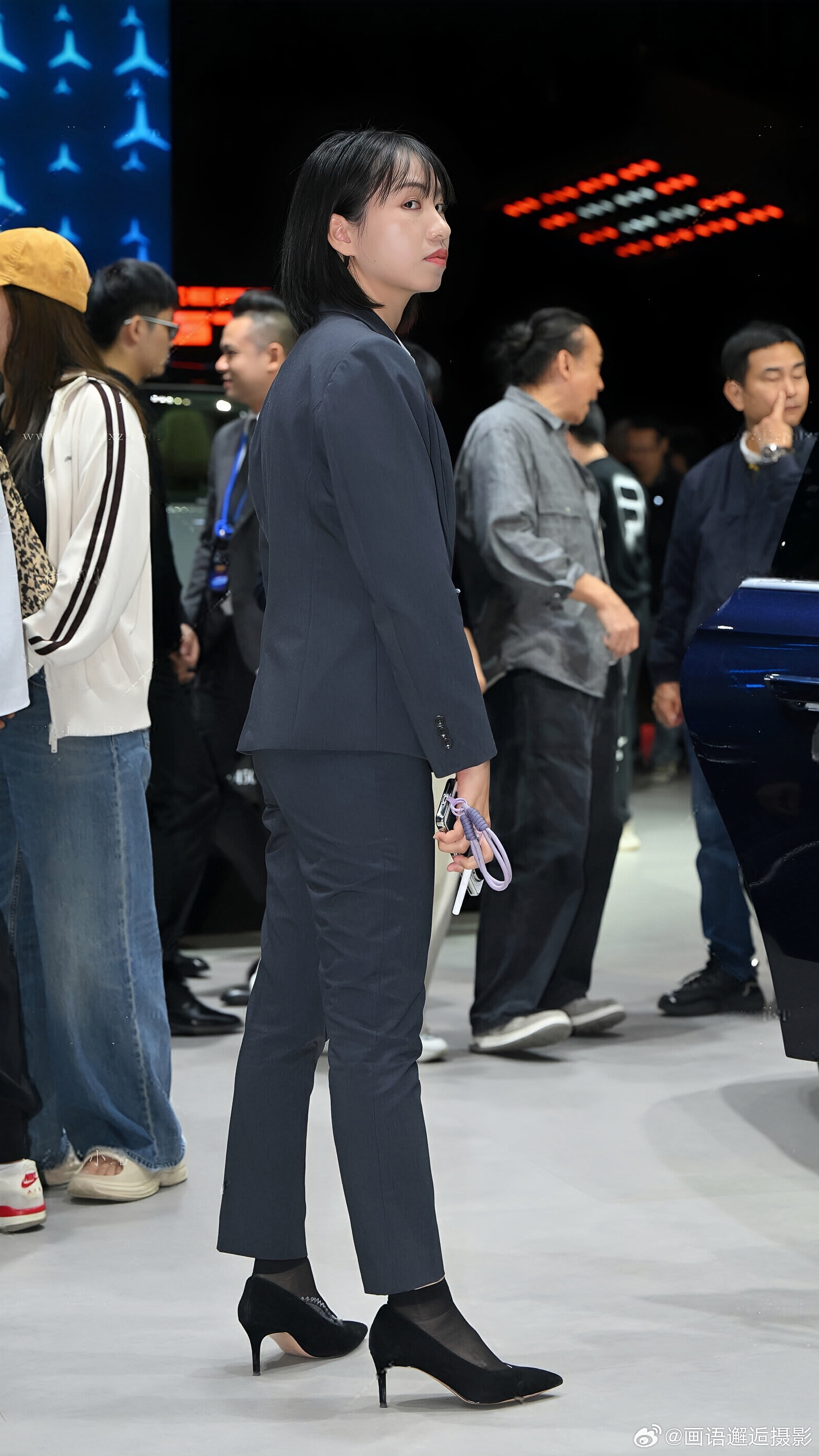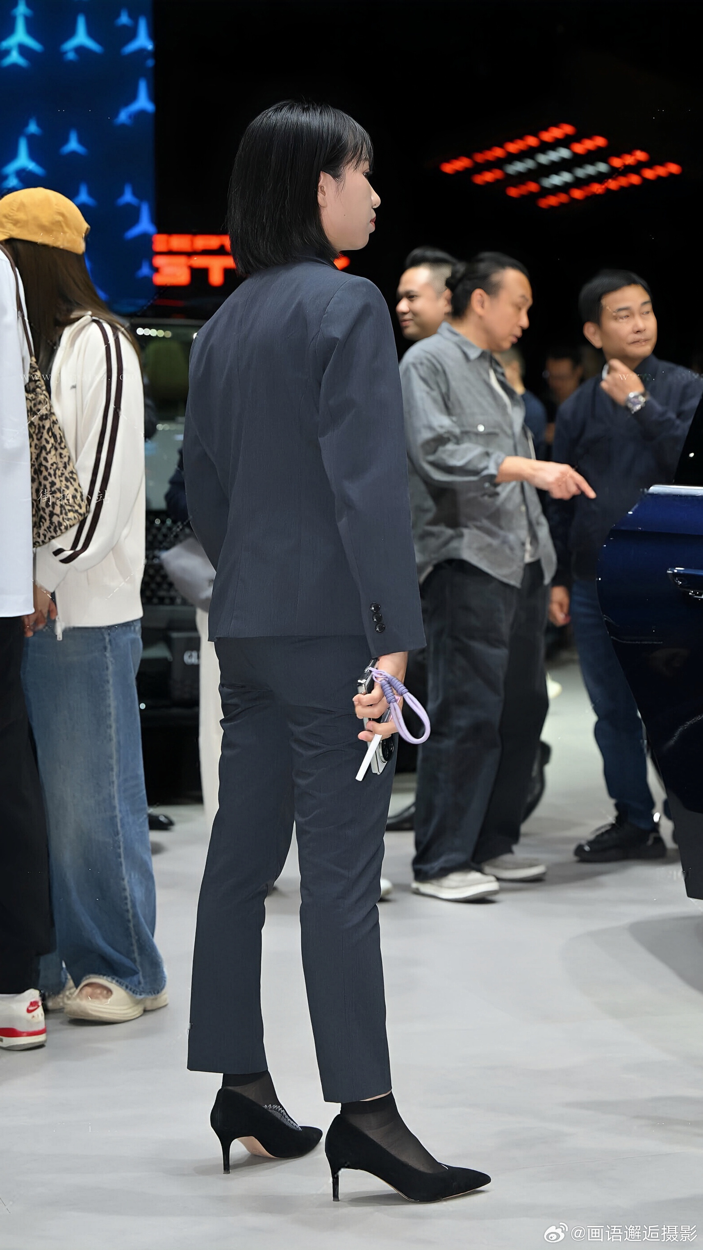 发现你的魅力 藏青色西装套装内搭白衬衫,佩戴蓝色挂绳,搭配黑色高跟鞋与丝袜,尽显专业干练。