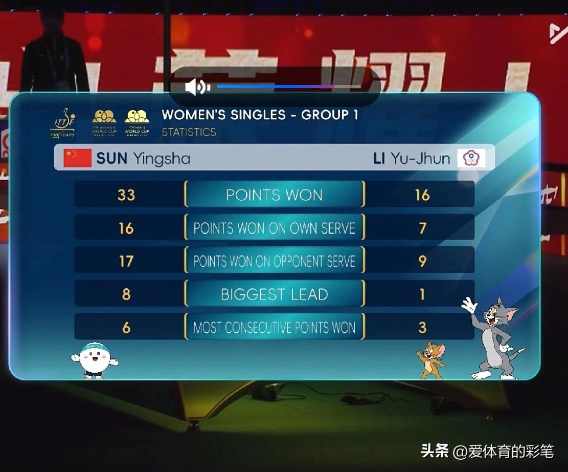 澳门世界杯首轮,孙颖莎抬起手臂,抹去湿漉漉的汗珠,这一刻像盛夏奋力冲刺的马拉松冠军选手,每一滴汗水都代表了专注、坚持、耐力。 面对世界排名49的李昱谆,整场她接发球时很主动,单单此项得分17分几乎是对手的2倍;在进攻上,她曾打出一波连得6分的小高潮,表现得很专注;在总得分方面,她以33:16绝对优势,完全碾压对手,真不愧为世界第一的顶级高手。继续为她加油,期待下场战胜埃及选手梅谢芙[呲牙]孙颖莎