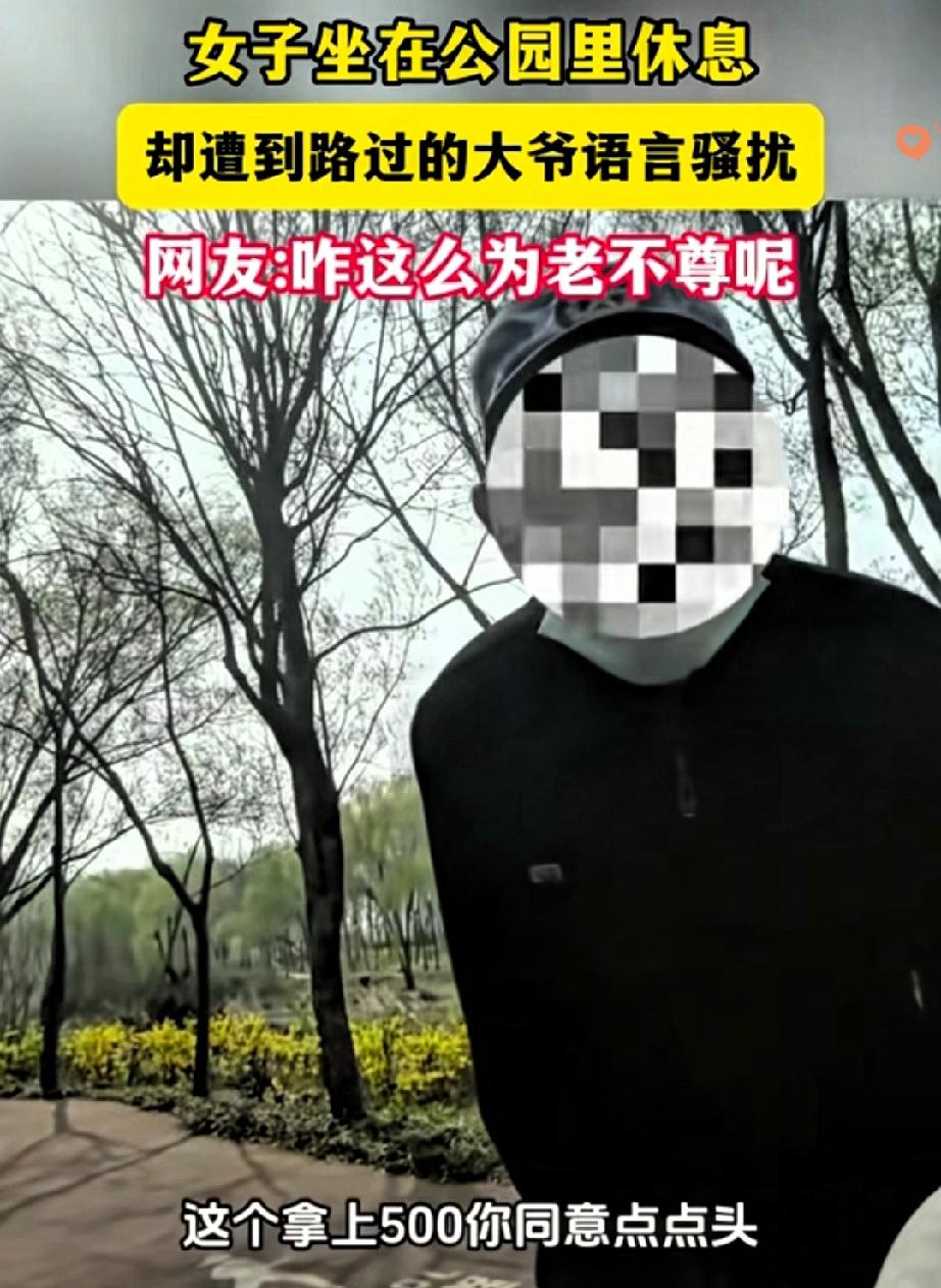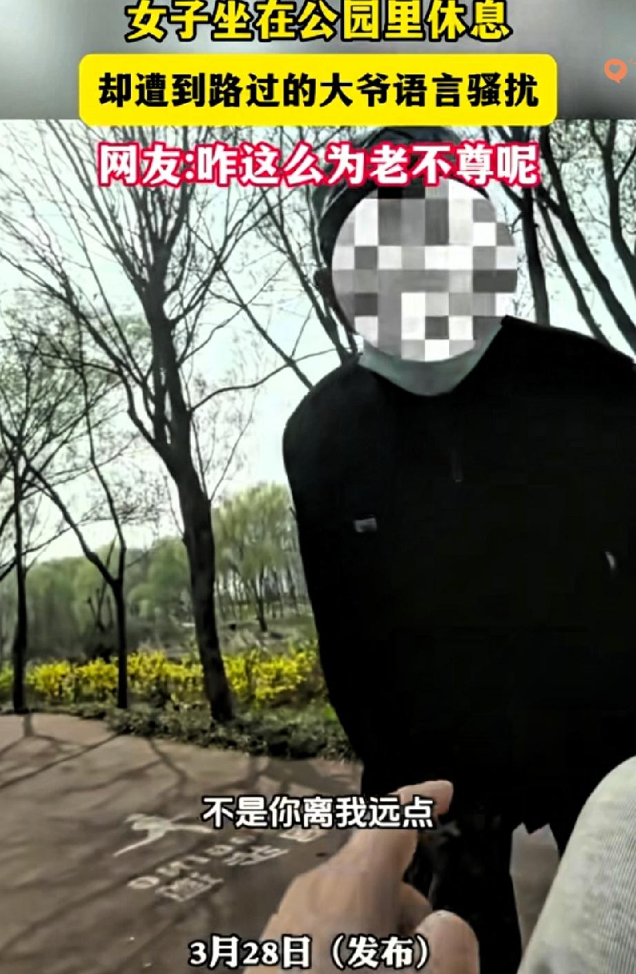 谁能想到安稳逛公园也会遇到糟心事! 一位女生坐在公园长椅休息,周围人来人往本很安全,却被一位老大爷突然上前搭讪。 对方张口就拿钱试探,言语轻浮又越界,让女生当场愣住又无比不适。 见女生沉默回避,老人还得寸进尺压低话语继续纠缠,尺度越来越过分。 真的不是年轻人偏见,而是有些人从来不是老了才变坏,只是年纪增长,坏心思一直藏在骨子里。 仗着长辈身份肆意越界,以为年纪大就能肆意冒犯他人,拿捏别人不好意思反驳的心理。 尊重从来和年龄无关,倚老卖老、没有边界感的行为,根本不配得到体谅。 公园是公共休闲场所,绝不是肆意轻浮试探别人的地方。 守住分寸和体面,才是做人最基本的底线。 遇到这种冒犯行为,你觉得该勇敢制止还是远离躲开?