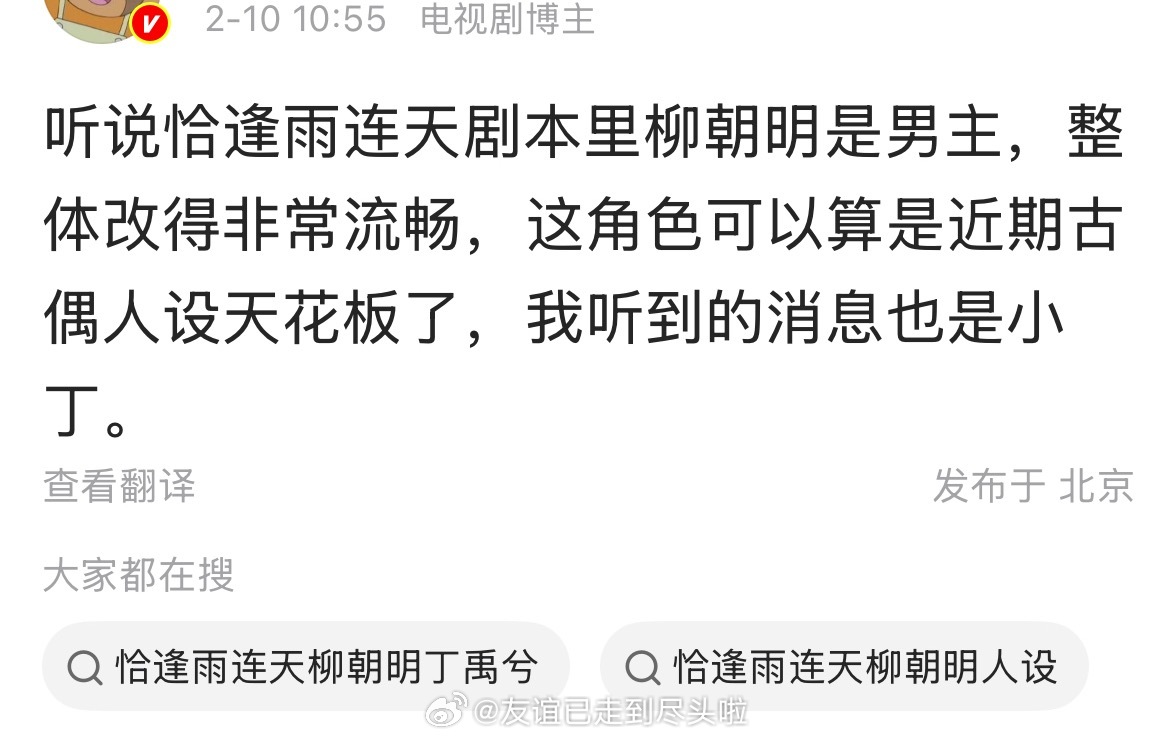 《恰逢雨连天》女主,从白鹿、卢昱晓传到了陈都灵,男主一直是丁禹兮,定男选女