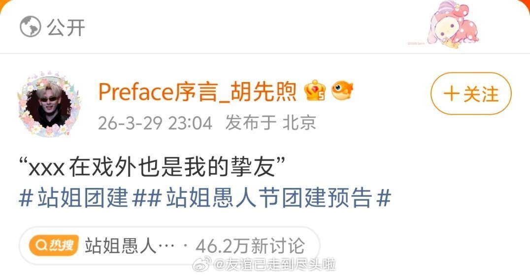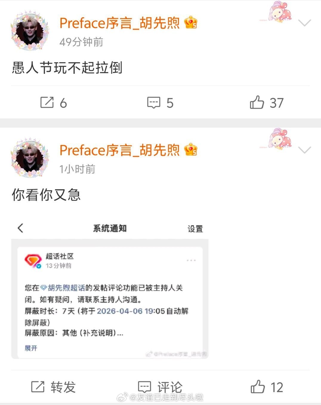 胡先煦站姐愚人节团建发了胡先煦和郝富申的cp图,胡先煦粉丝表示一点都不好笑,已拉黑 胡先煦站姐 胡先煦站姐发了郝富申王安宇
