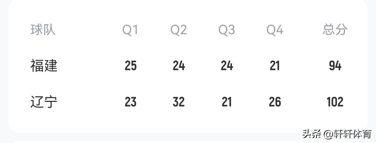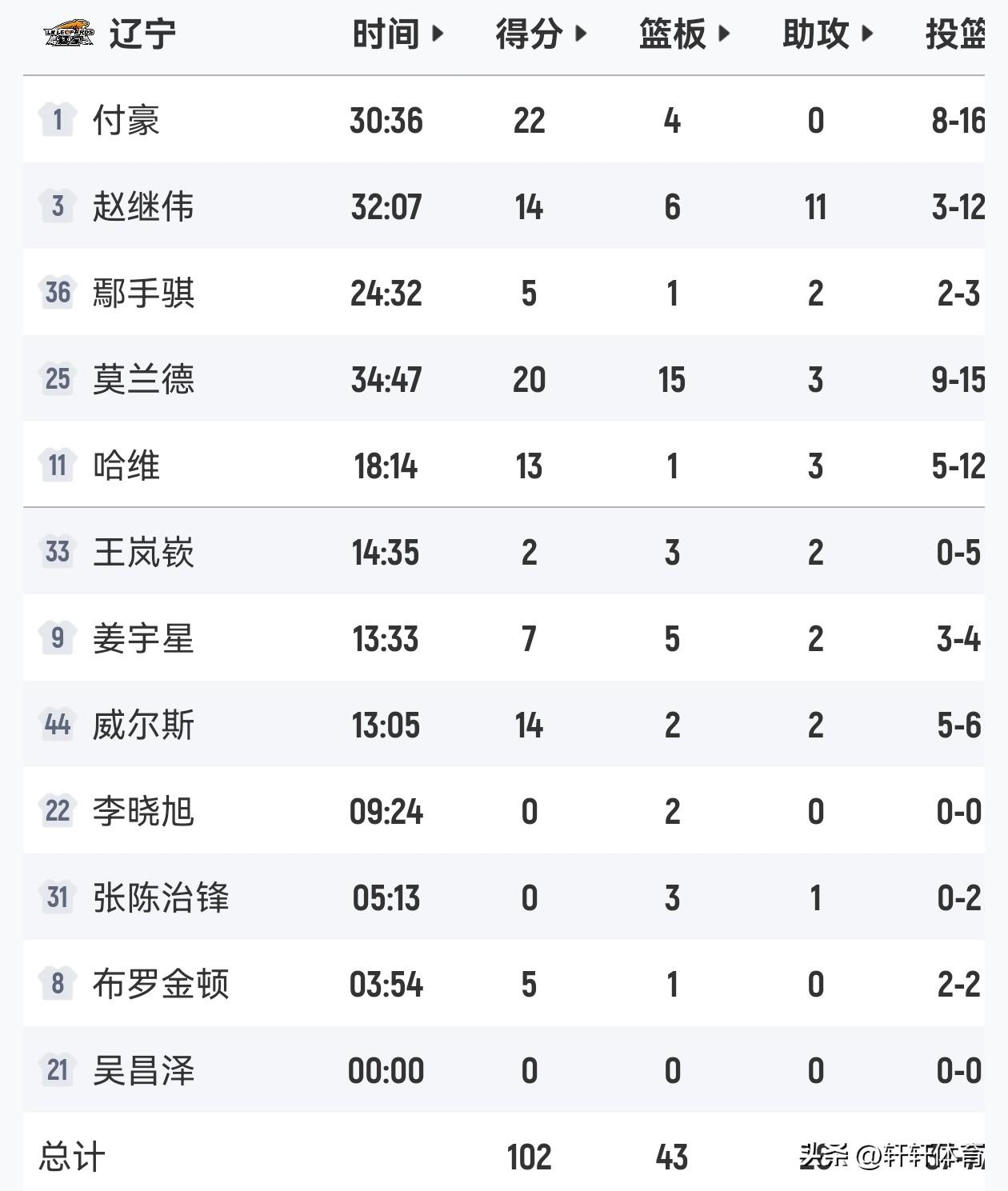 今天看了辽宁男篮客场挑战福建男篮的比赛,真心话就是辽宁男篮现在想赢一场比赛是真的难啊,但是好在结果是好的,最后经过全场激烈的比赛最终,客场作战的辽宁男篮以112-94战胜了福建男篮,本场比赛可以说打的跌宕起伏,四节比分分别是,辽宁男篮23-25、32-24、21-24、26-21,可以说今天辽宁男篮能够取得客场胜利就是两个方面做的比较好,第一就是篮板球控制的非常好全场辽宁男篮抢下了48个篮板球,而福建男篮只有34个篮板球,前场篮板辽宁男篮更是20比14比福建多了6个前场篮板,第二就是本场比赛辽宁男篮失误控制的比前几场要好,本场对阵福建仅有10次受迫性失误。 本场比赛辽宁男篮在首节前半段还是老问题,进入状态慢热特别严重,福建男篮率先进入状态,同时比分取得领先,但是辽宁男篮首节后半段及时调整,付豪以及莫兰德的内线组合首节就拿到了16分,在首节结束前将比分追至仅差2分,次节辽宁男篮延续了首节后半段的手感,以一波13-0的小高潮将分差拉大到了两位数,半场结束时福建将分差追近到仅有6分,下半场易边再战福建男篮,邹阳加黎伊扬联手以一波11-2的小高潮,迅速将比分反超,不够后续福建男篮手感还是出现了一些停滞,让辽宁男篮咬紧了比分,比赛最后一节虽然福建紧咬比分,但是比赛最后时刻辽宁男篮,凭借赵继伟的1个3分球,1个3分造犯规并3罚全中,以及两个助攻最终帮助辽宁男篮以102-94锁定比赛胜利,辽宁男篮也凭借本场比赛的胜利在积分榜上以17胜15负,稳定排名在第10位,同时辽宁男篮也结束了连续的三个客场之旅,下一场辽宁男篮将回到主场4月1日迎战新疆男篮。 本场比赛辽宁男篮数据,本场比赛辽宁男篮5人得分上双,其中付豪拿到了全队最高的22分4篮板,莫兰德20分15篮板,赵继伟14分6篮板11个助攻,威尔斯14分,哈维13分,姜宇星7分5篮板,鄢手骐与布罗金顿各有5分入账,王岚嵚2分。