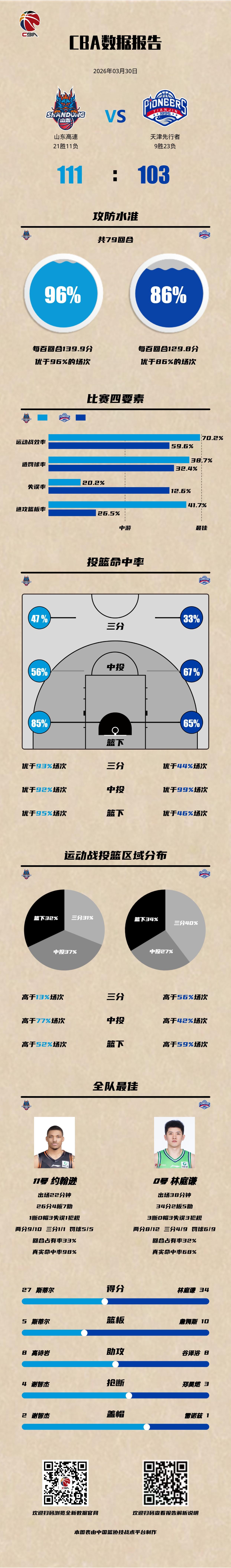 山东高速 111-103 天津先行者山东男篮vs天津男篮 山东高速:斯蒂尔27分5篮板,约翰逊26分4篮板7助攻,郭凯16分5篮板; 天津先行者:林庭谦34分5助攻3抢断,詹姆斯18分10篮板5助攻,克罗斯14分4篮板。