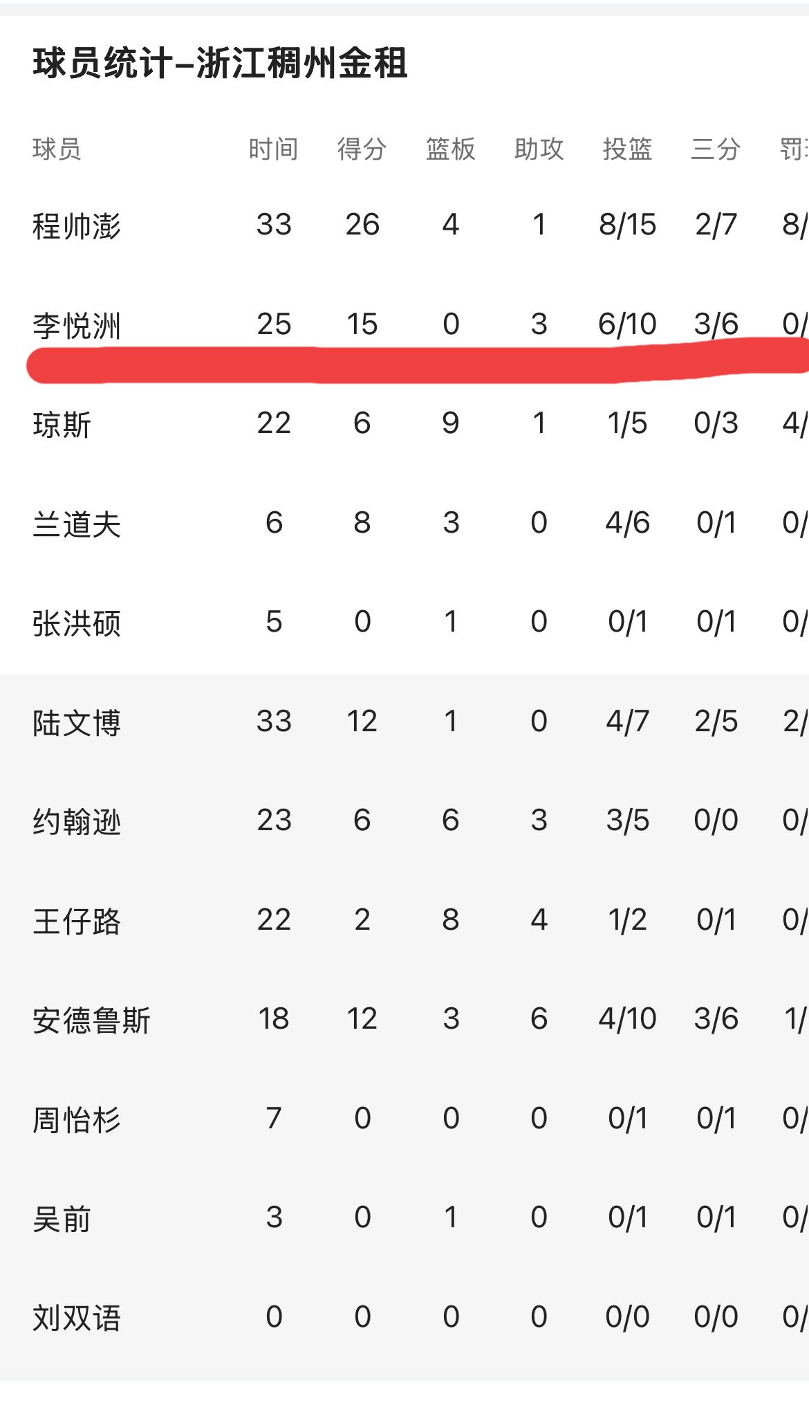稠州今晚赢球不只靠程帅澎26分,更靠他这单节10分! 今天上午我还在说,李悦洲真该学学廖三宁,休赛期好好补补对抗、把稳定性练出来,不然天赋再好,也打不出来。 结果晚上打广州,球打得特别胶着:半场就领先2分,第三节打完也才赢7分。 第四节一上来,广州追得很凶,眼看就要把比分翻过来,局势一下就紧了。 这时候站出来的,正是李悦洲,两个三分再加突破,单节拿了10分,一波流直接把分差拉开,才算把比赛拿稳。 程帅澎26分是球队的基本盘,但真正在关键时刻顶住、把比赛打花的,是李悦洲。 今晚他能打出来,说白了就是信心上来了,敢出手、敢担事,整个人的精气神都不一样。 球场上,信心本来就比啥都重要。 希望这不是昙花一现,能借着这场球,越打越好。 一场高光说明不了太多,能把状态稳住才是真本事。 但我还是那个观点: 能打出这样的好球,证明他有这个潜力。想在CBA真正站稳脚跟,休赛期还是得出去好好特训,把对抗和基本功练扎实,天赋才能变成真东西。 浙江稠州男篮 李悦洲 程帅澎