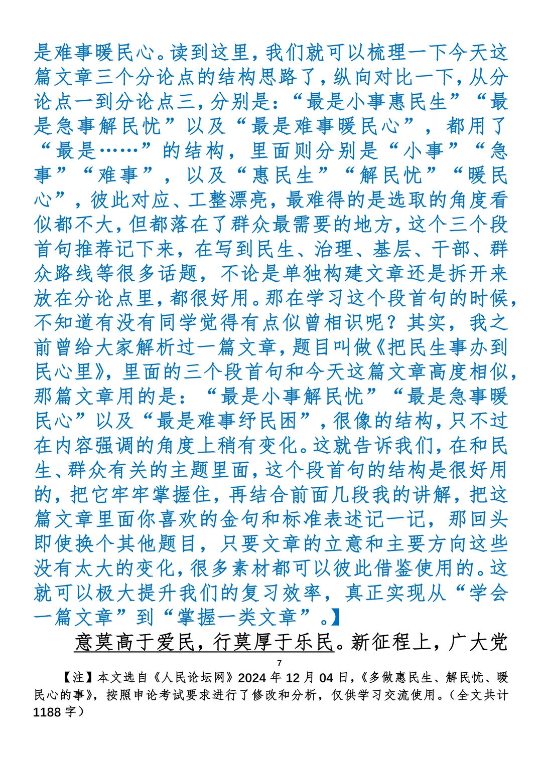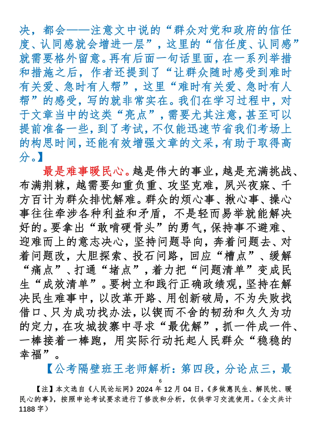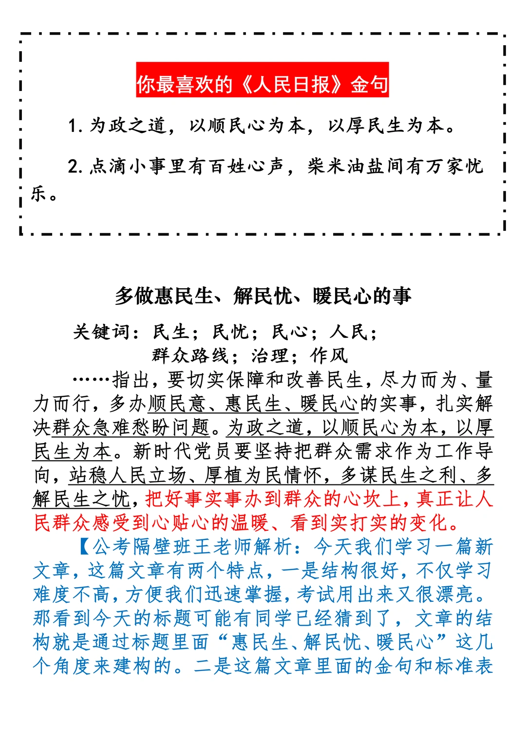 如何抄写:每日抄写文章发在“公考隔壁班王老师”账号,红色字是重点句和结构句,黑色字是正文,蓝色字是解析,大家抄写时不必抄蓝色字。建议先通读全文,做到心中有数再开始抄写,效果会更好。 关于文章:抄写文章来源于人民日报,但每篇文章我都根据申论考试要求进行了修改:一是重写或修改开头、结尾;二是统一段首句句式结构;三是调整段落字数,使文章结构更均衡;四是简化复杂长难句,使之更具可模仿性。每篇文章无论修改多少,都是基于申论考试要求,毫无对人民日报文章品评之意。(此处致敬人民日报)