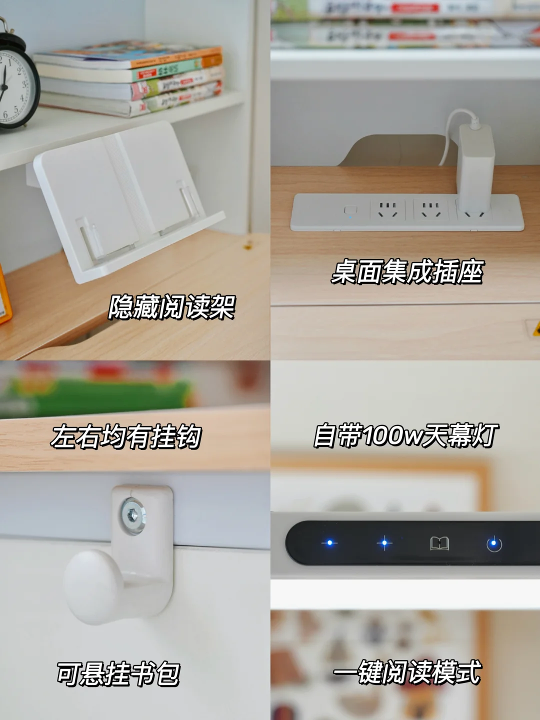 桌子还自带了L型独立吊柜,分类收纳,书本可以根据使用频率分区收纳,隐藏式阅读架一拉即用,拉出来放iPad上网课,用完推回去。还有个插座,充电不用拖线板,省得地上乱七八糟。不用时推回,不占桌面。