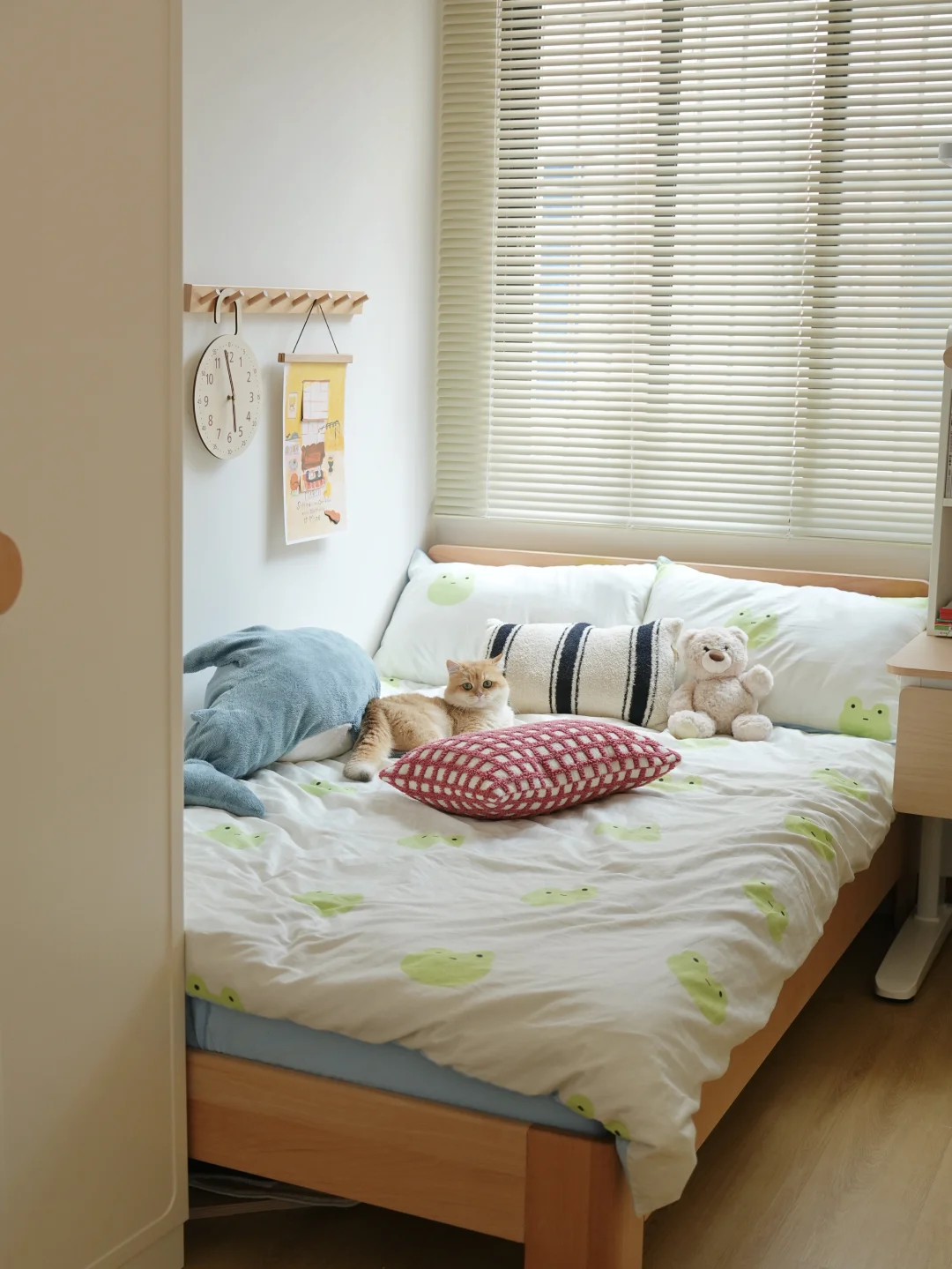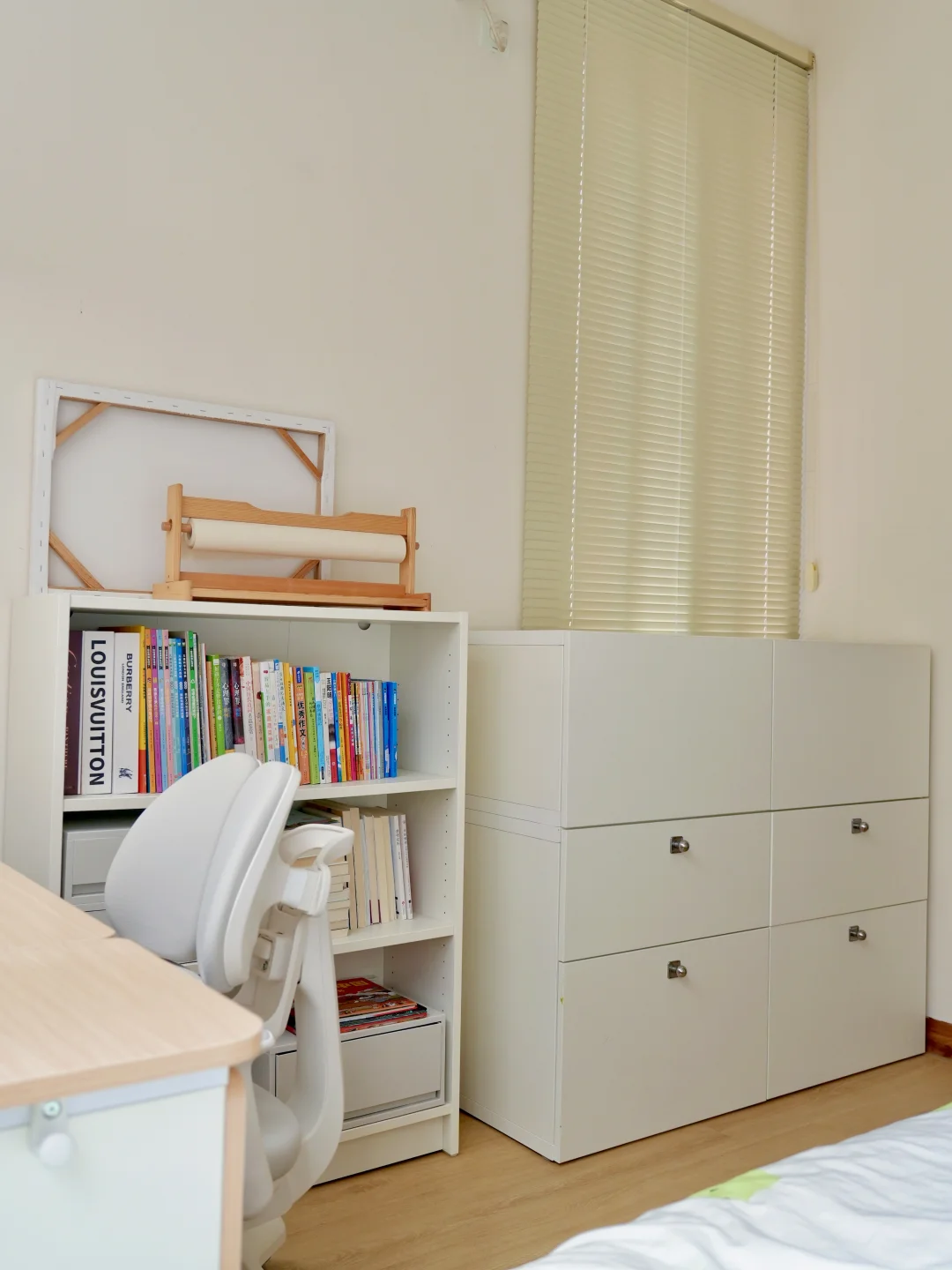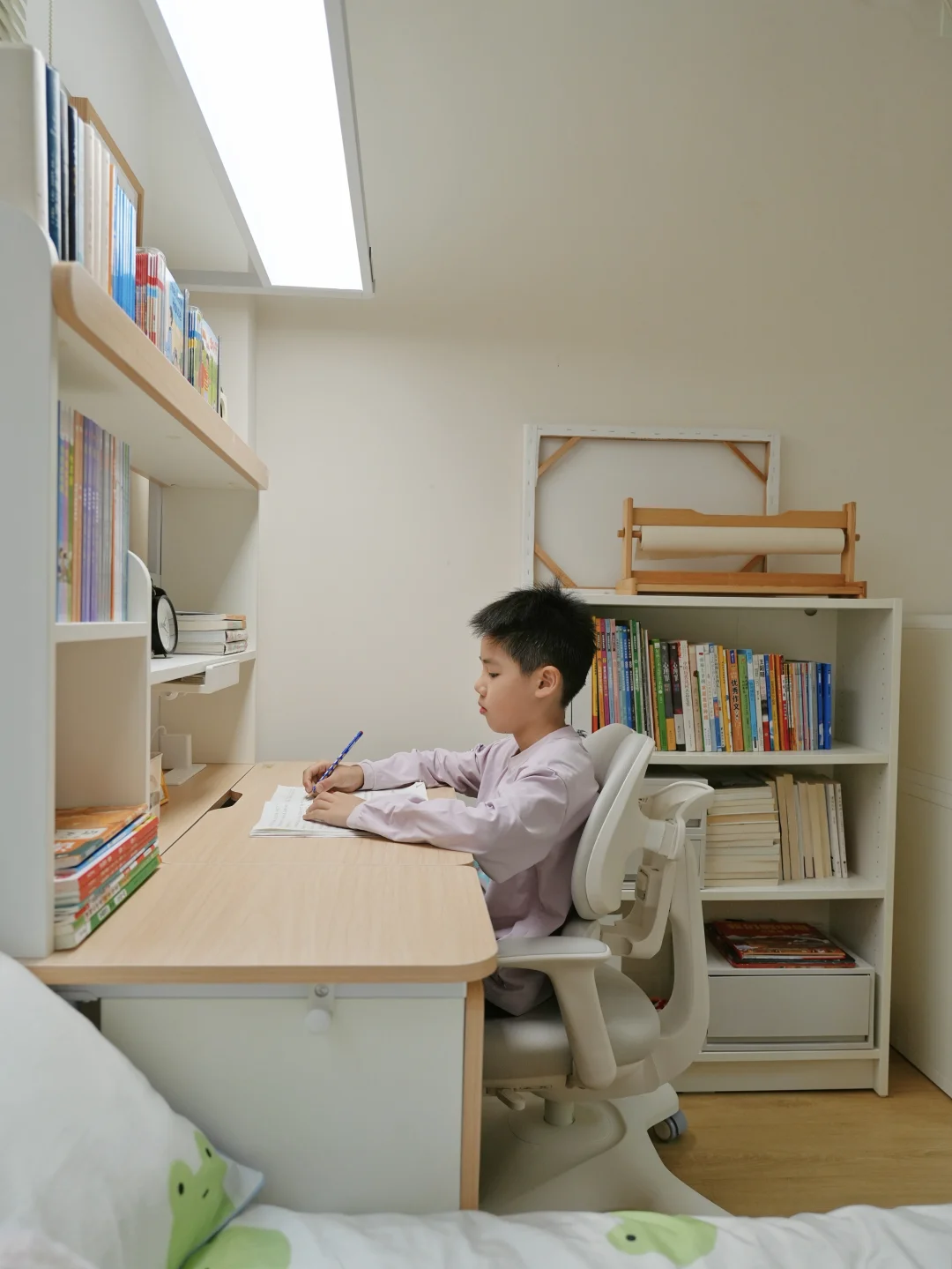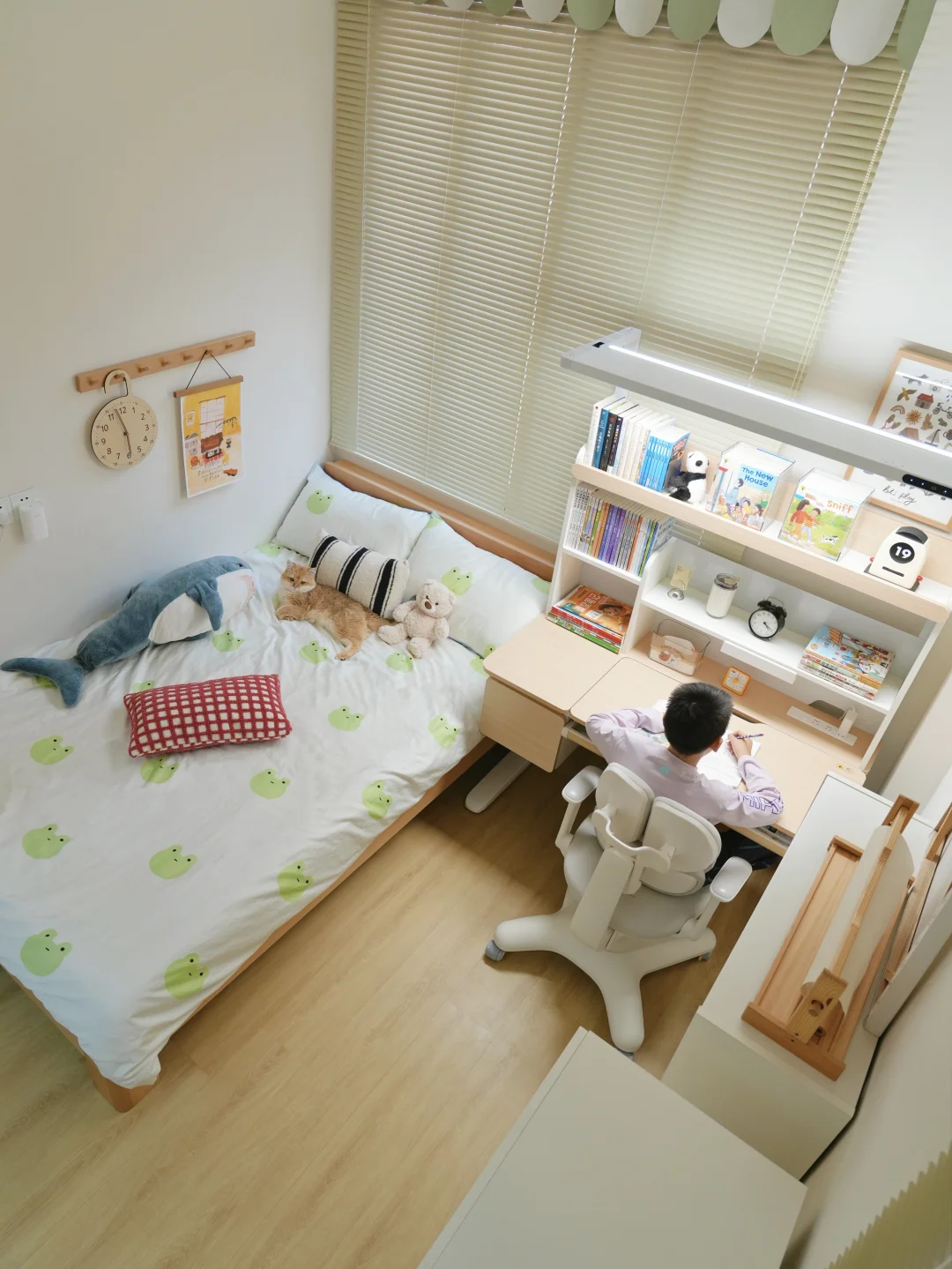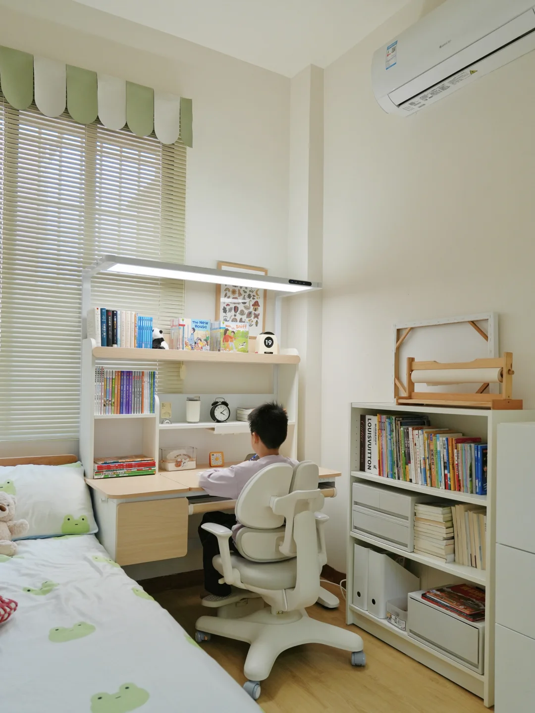 孩子现在每天放学,自己走到那个靠窗的小角落,开灯、写作业、拿书、放书,全套流程自己来。这才是实用的儿童房设计!