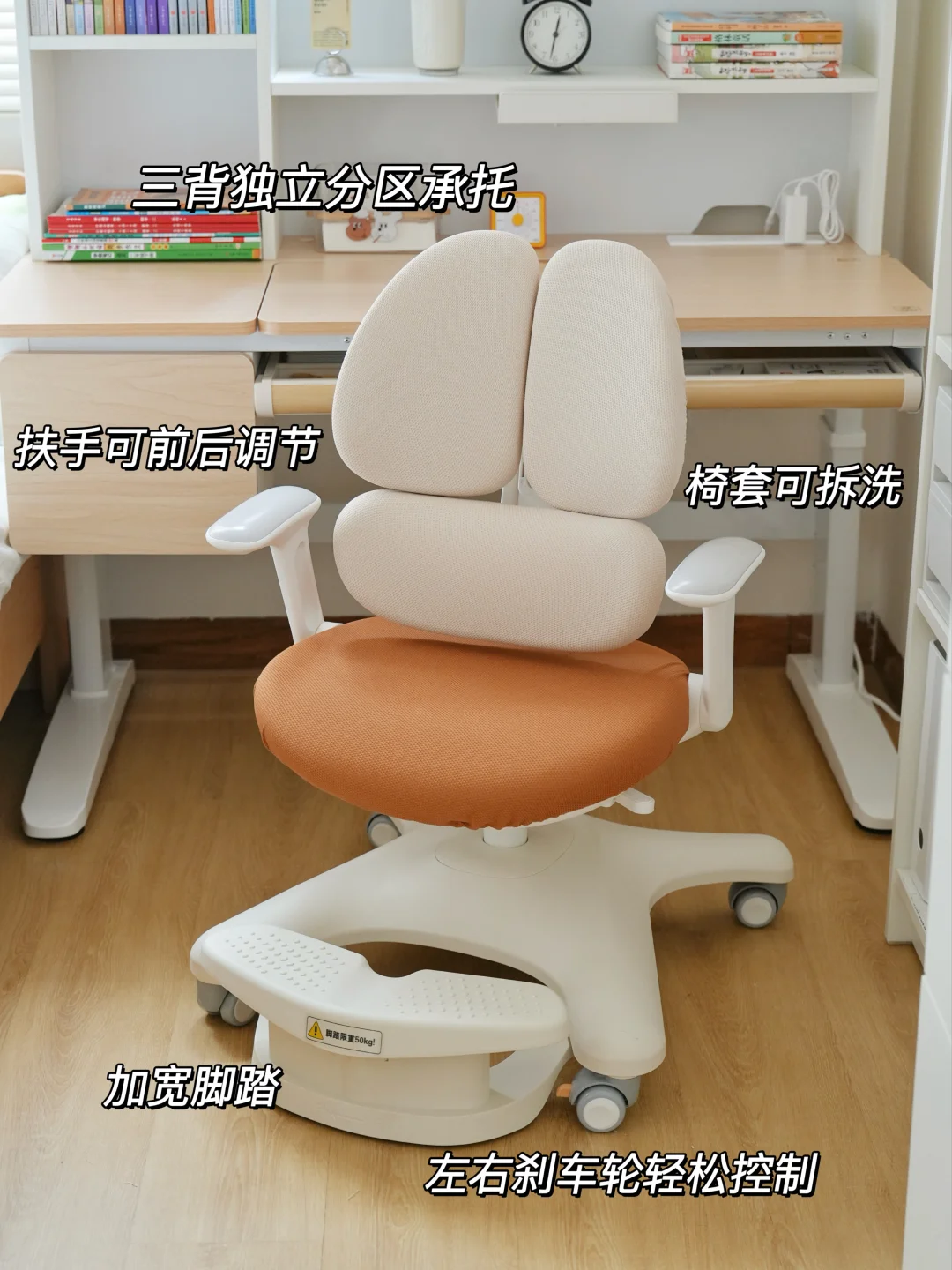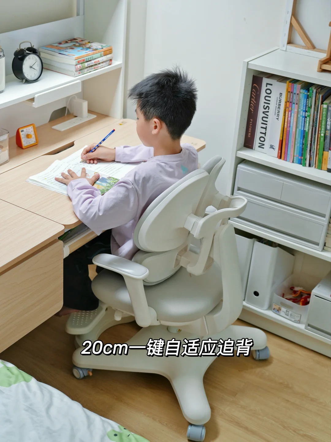 配套的椅子也是让我很省心,20cm一键自适应追背,坐下瞬间椅背自动贴合脊柱;三背独立分区承托,腰托前后调节3.5cm,靠背升降5cm。无论孩子怎么长,背都有支撑。现在学习再也不用我盯着坐姿,他自己安静写作业,我在厨房做饭也很安心。