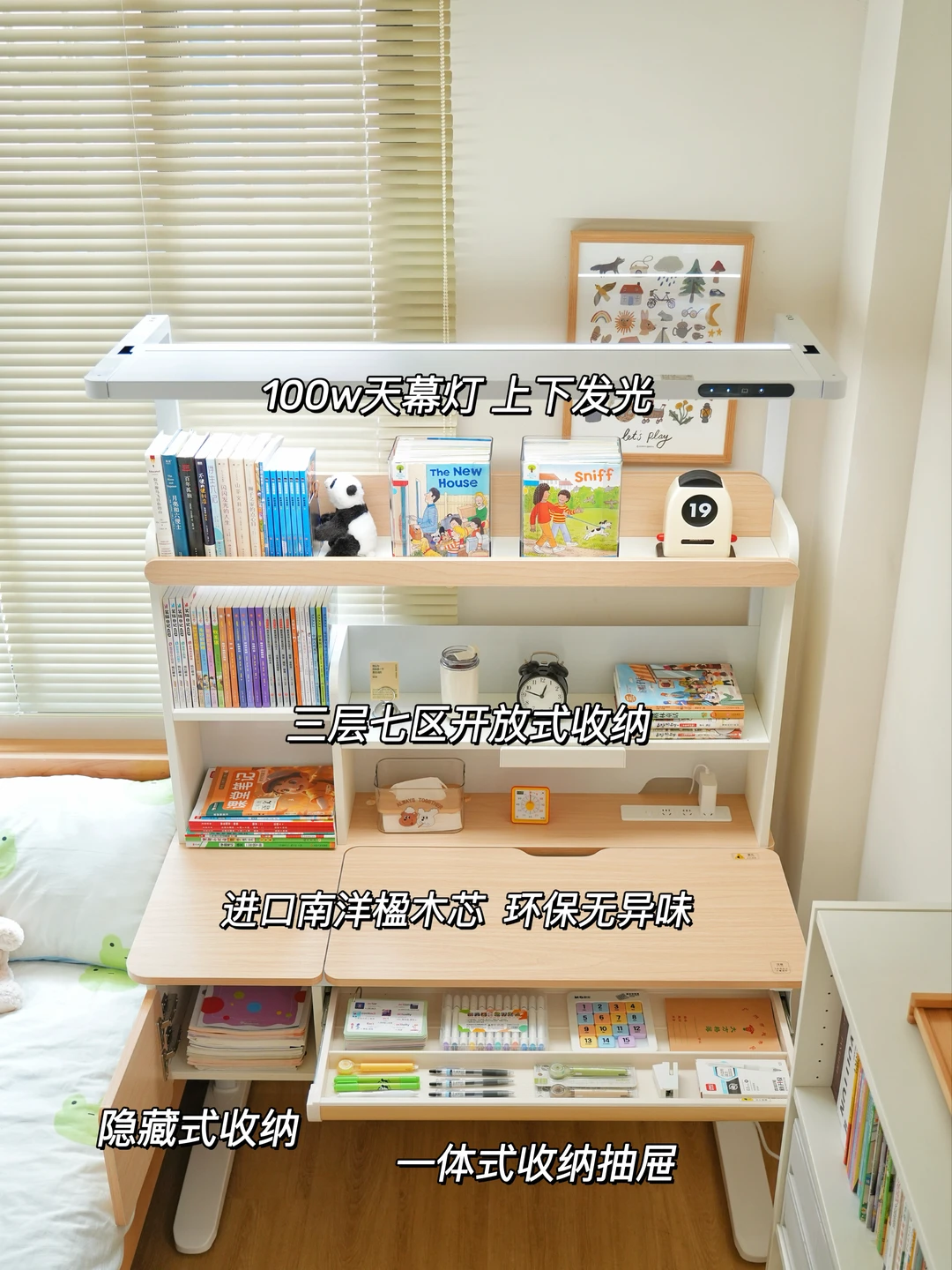 一桌实现了学习收纳灯光坐姿矫正四个功能,孩子学习专注好多,这学期老师都夸作业写的好。桌面采用进口南洋楹木实木芯,国标ENF级。无异味,他趴桌上睡着了我也放心。颜色是暖暖的浅木色,靠窗晒着也不怕