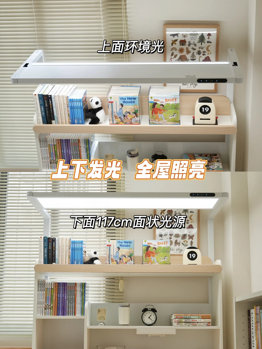 顶部还自带了100W天幕灯+117cm面状光源,上下发光设计,能照亮整张桌面,通过天花反射全屋均匀照亮。原装美国普瑞灯珠,RG0无蓝光危害,中心照度>1672lux,3.3倍优于欧洲教室照明标准。孩子说写字没有手影,亮度也舒服,学习眼睛也不喊累了,省下单独买台灯的钱和0.2㎡桌面空间,真的超值!