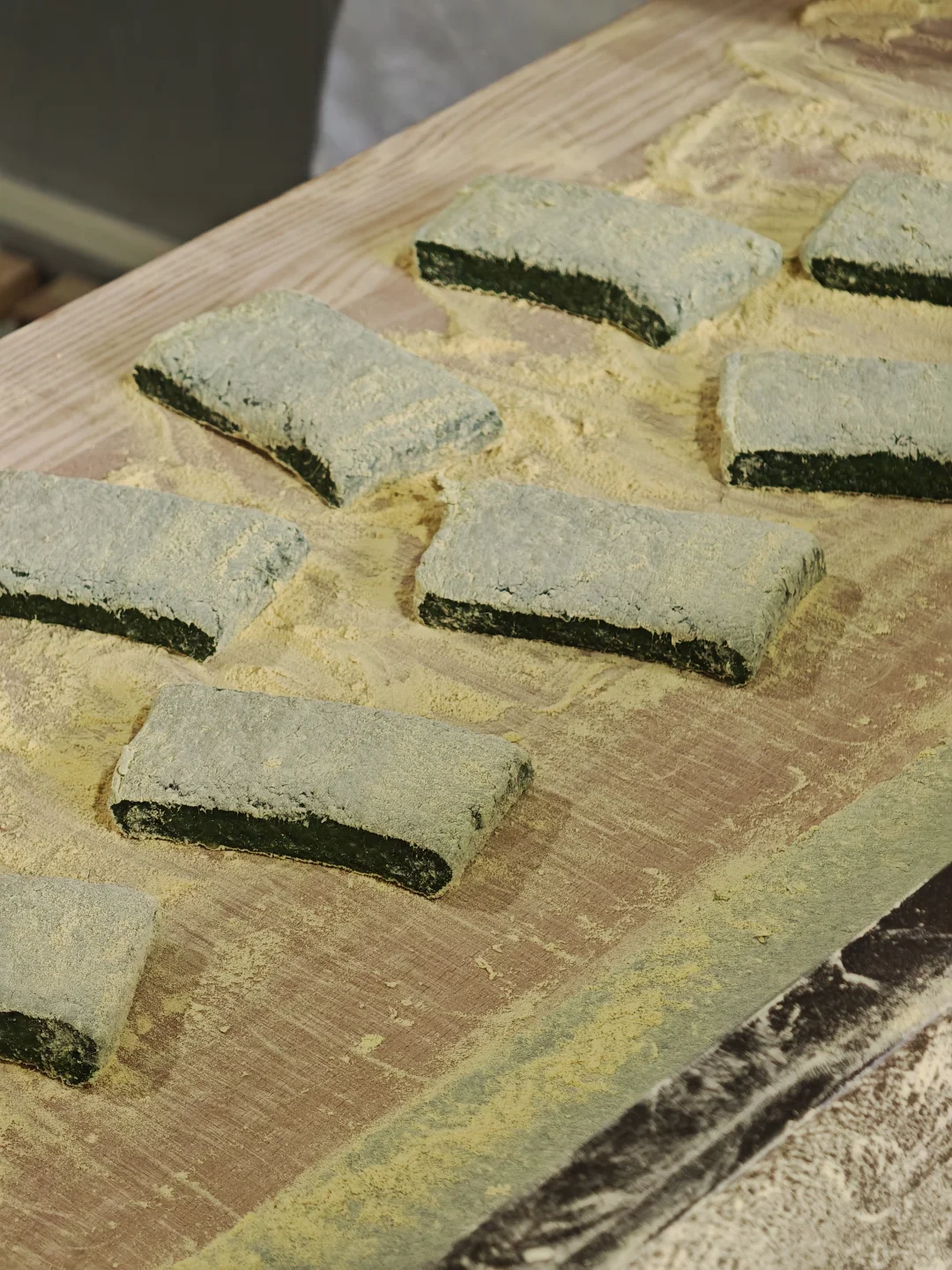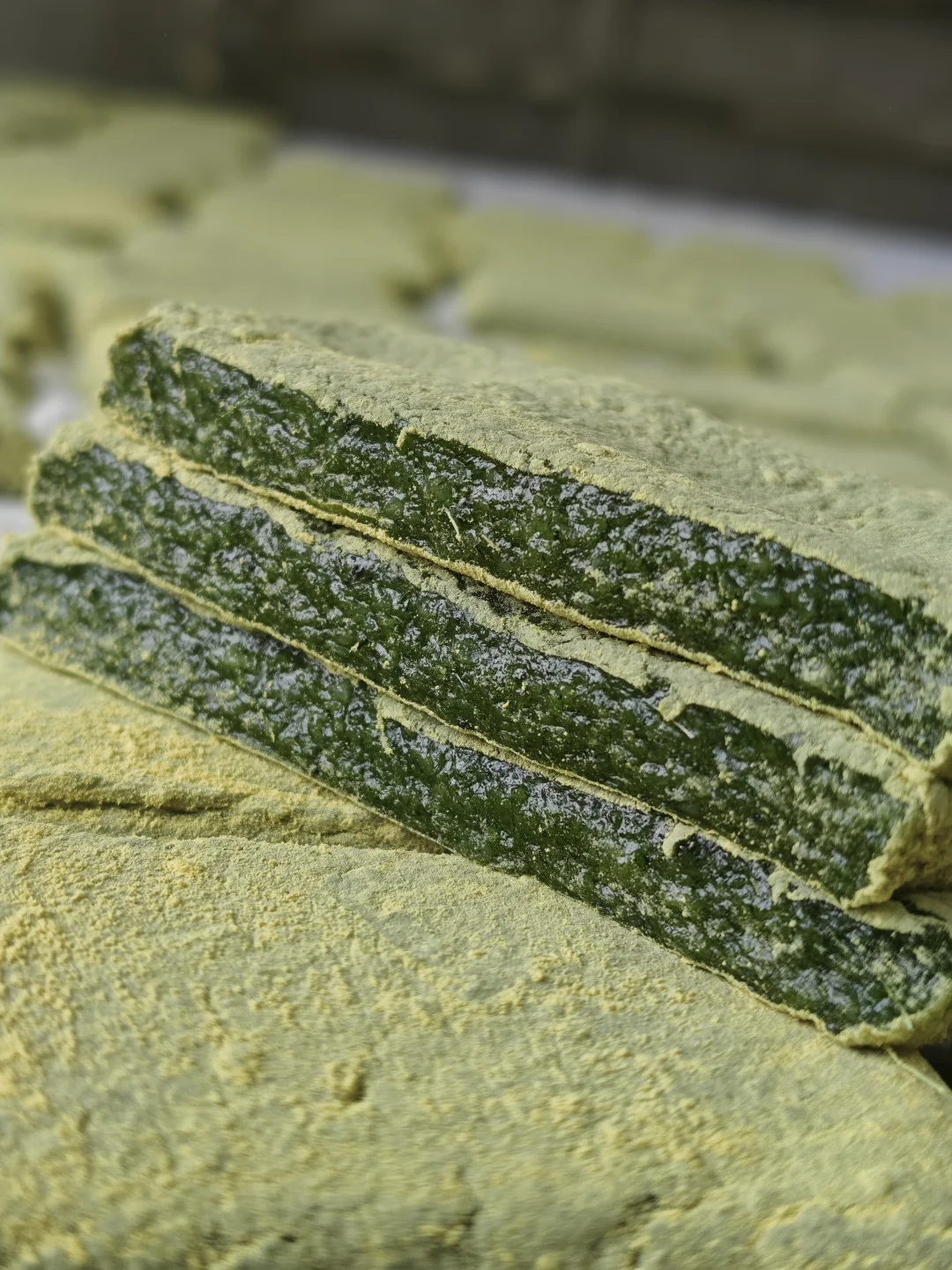 宁波春天的王—艾草麻糍 口感无敌!! 只要喜欢糯叽叽的朋友 吃了一次就还有下次!! 原料不是糯米粉 3个师傅用纯糯米粒生轮流打15分钟 才能造就软软糯糯的口感 没有色素和勾兑 配料只有糯米、艾草、水、白砂糖、红糖松花粉。 入口就有浓郁的艾草香气 口感有嚼劲 可以拉丝不黏牙 第一块结束还想吃第二块 减脂或者不爱吃甜的朋友 无脑选无糖款 去掉红糖和白糖 只剩下艾草清香和糯叽叽的口感 微微的艾草苦还很上头