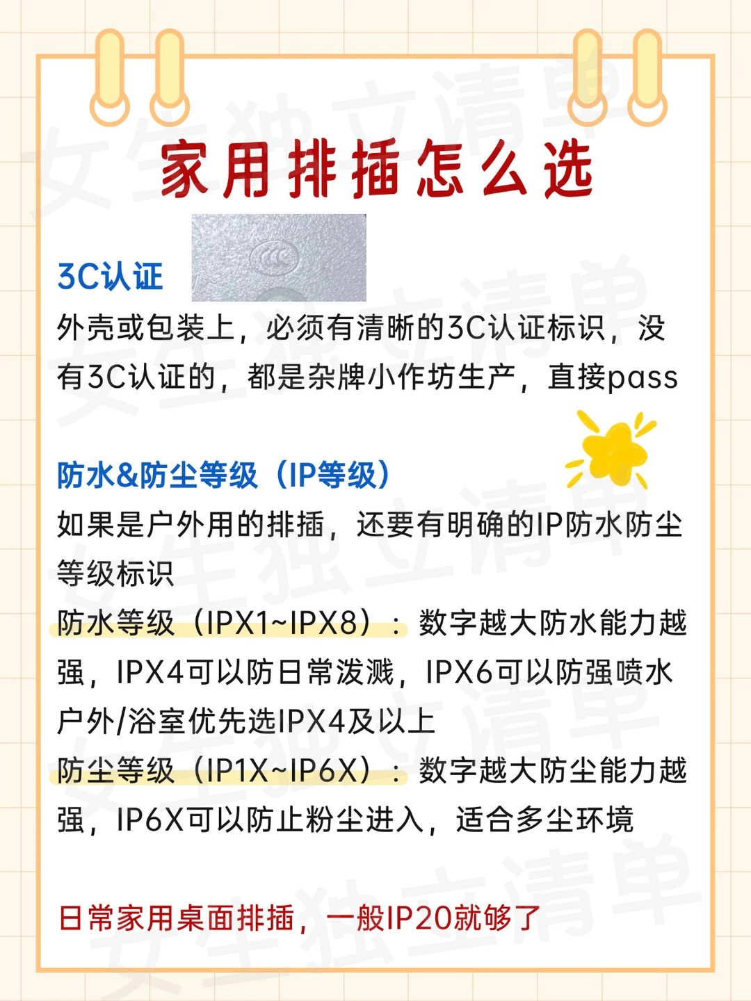 🔺安全标识:必须有3C认证,户外用排插要有IP等级,家用桌面IP20即可,户外优先IPX4及以上