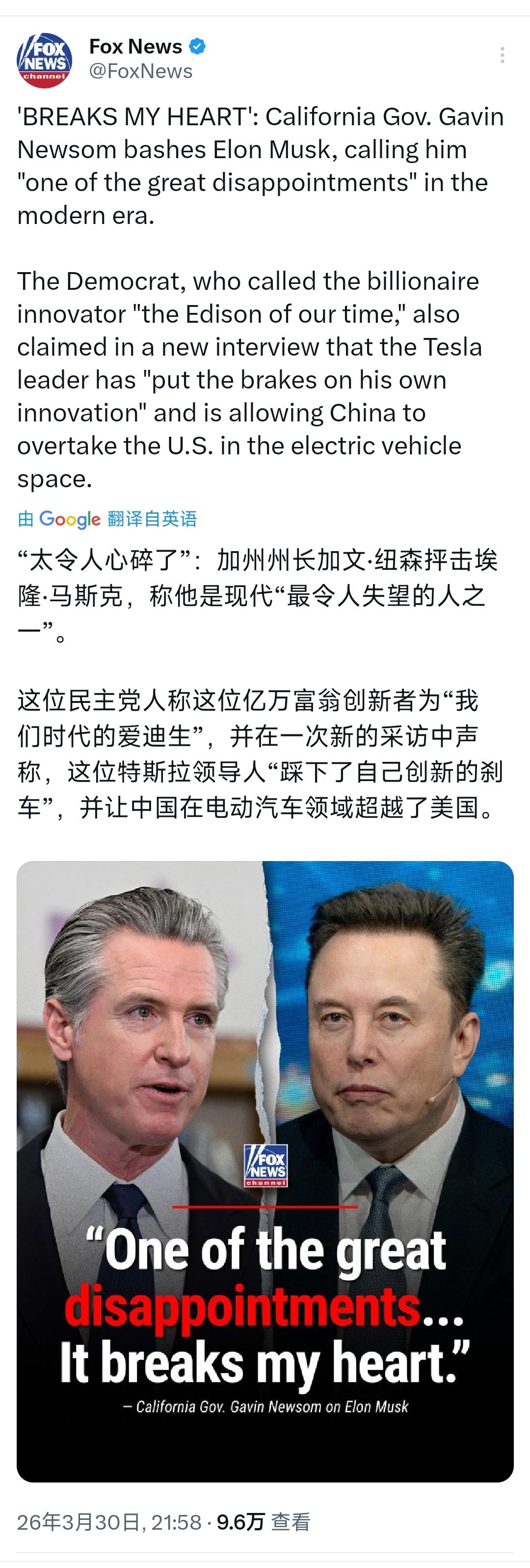 福克斯新闻今晚(3月30日晚)写道:“‘太令人心碎了’:加州州长加文·纽森抨击埃隆·马斯克,称他是现代‘最令人失望的人之一’。这位民主党人称这位亿万富翁创新者为‘我们时代的爱迪生’,并在一次新的采访中声称,这位特斯拉领导人‘踩下了自己创新的刹车’,并让中国在电动汽车领域超越了美国。” [机智]评几句:纽森对马斯克的指责并不公平。中国电动汽车超越美国,不是马斯克创新无力,而是中国踩准了产业节奏,用长期主义干翻了美国的短视与内耗。中国没有百年燃油车的既得利益包袱,从政策端稳扎稳打十余载,补贴、绿牌、基建配套步步落地,让车企敢投、百姓敢买;产业端打造出全球最完整的本土化供应链,比亚迪垂直整合降成本,宁德时代电池技术领跑,长三角珠三角的配套效率让美国望尘莫及。反观美国,联邦补贴说停就停,电车销量应声腰斩,传统车企集体注销530亿电动化投资,充电基建滞后到每29辆车抢一个充电桩,政客们只会将产业落后甩锅给企业,却不愿正视自身政策反复、利益博弈的硬伤。马斯克纵使有爱迪生的天赋,也扛不住美国产业环境的拉胯,纽森的指责不过是政客逃避责任的虚伪表演,把自己的无能归罪于别人的“刹车”,可笑又可悲。