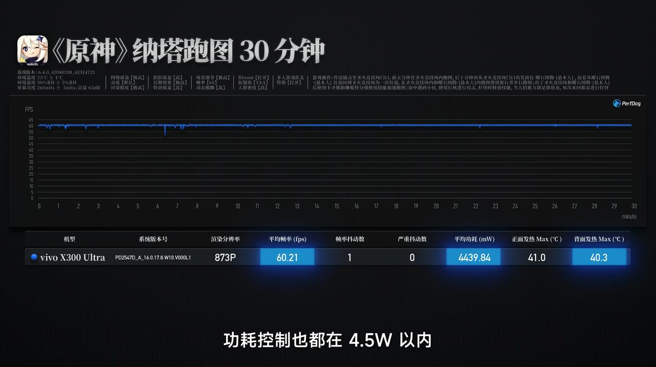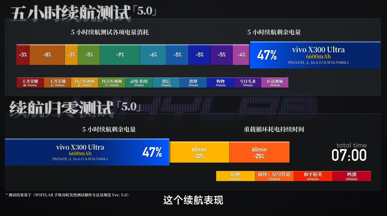 新增vivo X300 Ultra 测试数据,其相机详细参数可访问小程序「WHYLAB」查看。 ➢ 🎮 游戏:旗舰级性能释放,全负载流畅稳定,适配硬核玩家 - 轻负载场景:《王者荣耀》极致+极致设置,平均帧率144.14fps,平均功耗4156.03mW,正面最高温38.3℃、背面36.1℃,机身微热,操作跟手无延迟,高刷优势拉满。 - 中高负载场景:《原神》(纳塔)873P 分辨率测试,平均帧率 60.21fps,总抖动数 1 次、无严重抖动,平均功耗 4439.84mW,正/背面最高温 41℃/40.3℃,长时间游玩无降频,流畅度稳定。 - 高负载场景:《绝区零》810P 分辨率测试,平均帧率 59.69fps,总抖动数 24 次、严重抖动数 17 次,平均功耗 4359.14mW,正/背面最高温 40.9℃/40.6℃,核心竞技场景不受影响。 - 重载场景:《崩坏·星穹铁道》2160×982 分辨率测试,平均帧率 59.69fps,总抖动数 26 次、严重抖动数 12 次,平均功耗 6374.42mW,正/背面最高温 46.3℃/46.5℃,重载下仍稳定控帧,无明显卡顿。 全负载适配性拉满,从轻度高刷到重度开放世界均能胜任,完美匹配硬核玩家需求。 ➢ 📱 屏幕:京东方 Q10 plus,专业级色准+高亮度,适配多场景 - 亮度表现:依旧是京东方 Q10 plus 发光材料,实测手动最高亮度 787.61nits,激发亮度 1774.70nits,亮度均匀度 97.69%,正午强光下可视性优异,室内外适配性拉满。 - 色彩素质:自然模式 sRGB 124 色Avg ΔE2000 1.10(覆盖率 99.89%)、P3 124 色Avg ΔE2000 1.00(覆盖率 99.32%);专业模式色准更优(P3 Avg ΔE2000 0.96),均达专业水准,日常与创作场景均适配。 - 护眼性能:蓝光峰值波长 461nm,护眼蓝光占比可调节(最暖模式 10.58%,护眼效果最佳),SVM 平均值 0.26,长时间使用疲劳感低;不同亮度 SVM 联动合理,暗光场景体验友好。 ➢ 🔋 续航:6600mAh 蓝海电池,续航实力扎实,无续航焦虑 - 搭载 6600mAh 蓝海电池,5 小时综合使用,电量从 100% 降至 47%(消耗 53%)。 - 续航归零总时长 7 小时,覆盖全天重度使用需求;四小时重载测试(原神+星穹铁道),耗电控制合理,无异常高耗情况。 - 5 小时场景发热控制优异:正面最高温 42℃、背面 40.3℃,集中在游戏环节,日常场景(抖音、微信等)温度 31~38℃,全程无烫手情况。 ➢ ⚡️ 充电:100W 快充+稳定温控,补能效率高效 - 快充效率:支持 100W快充,0-100% 满电耗时 45 分钟,应急补能表现突出——10 分钟充至 25%,25 分钟充至59%,半程补能节奏满足日常需求。 - 温控表现:充电峰值温度——正面 37.6℃、背面 37.9℃,全程无明显烫手感;升温平稳,40 分钟后逐步降温,温控逻辑兼顾效率与安全性。 vivo X300 Ultra 凭借“全负载稳定游戏表现、专业级屏幕素质、6600mAh 大电池+ 7 小时续航、100W 高效快充”四大核心优势,契合高端旗舰定位,适配“追求全能体验的硬核玩家、日常重度使用用户”;支持卫星通信功能,户外实用性进一步提升,无明显短板,综合竞争力突出,适合对旗舰机型有高要求的用户直接选择。