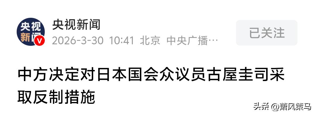 第三波对日反制重拳落地,这次直接拿捏日本首相高市早苗的核心幕僚古屋圭司,太解气! 他多次窜台勾连“台独”,公然叫嚣台海立场不让步,赤裸裸干涉中国内政,触碰一个中国原则红线,必须付出代价! 冻结全部在华资产、禁止入境、断绝所有交易合作,全方位制裁精准戳中要害。比起前两位被制裁的日本政客,古屋圭司身份更特殊,他的行径就是日本右翼政府涉台错误立场的缩影。 台海问题是中国内政,红线绝不容触碰!中国维护主权完整的决心坚如磐石,任何外部势力、“台独”分子敢挑衅,中方反制只会越来越强硬,玩火者必自焚!