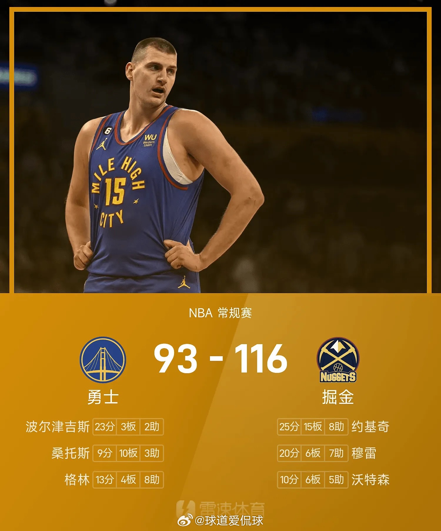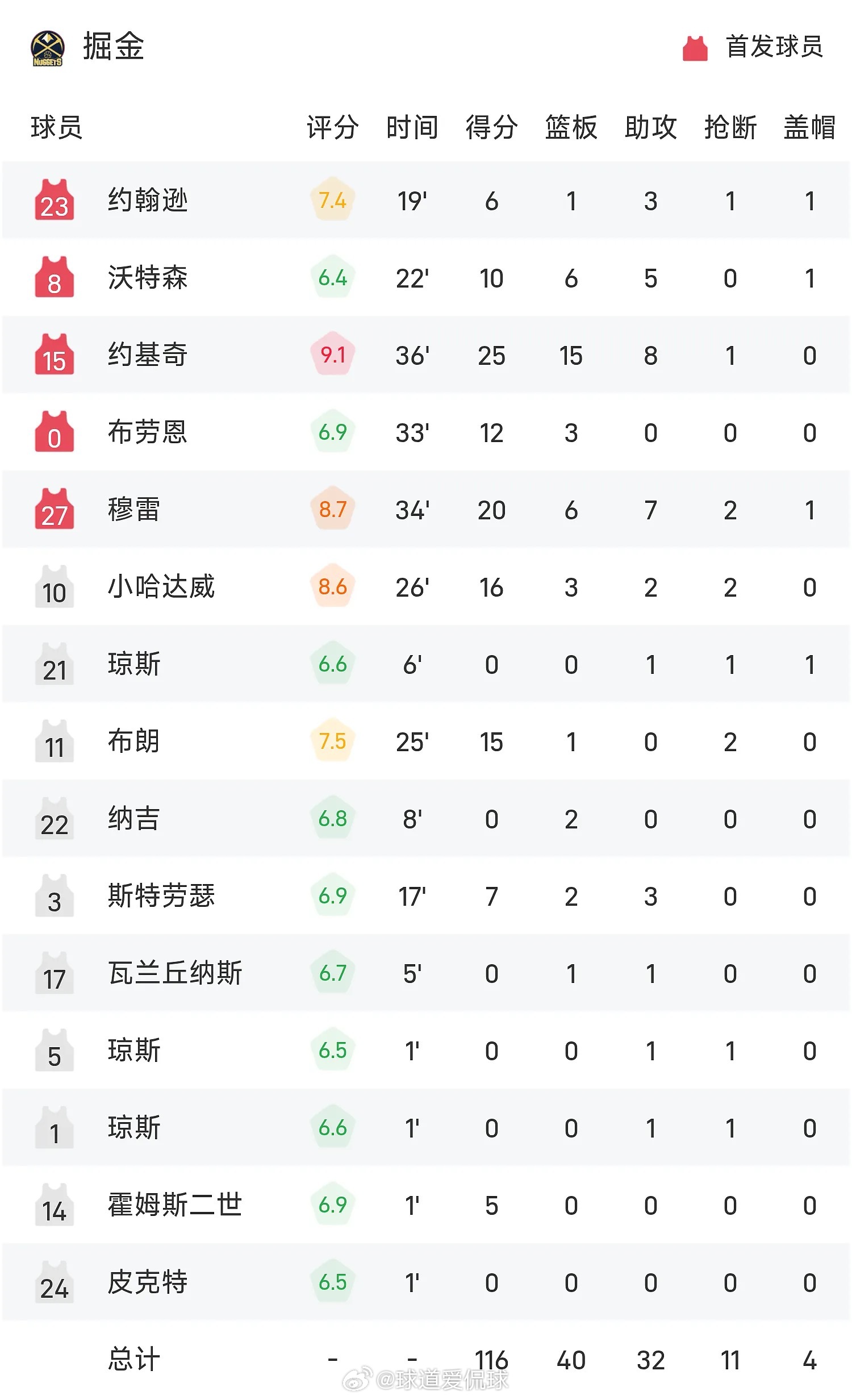 约基奇砍下全场最高的25分15板8助,率领掘金成功取胜。
