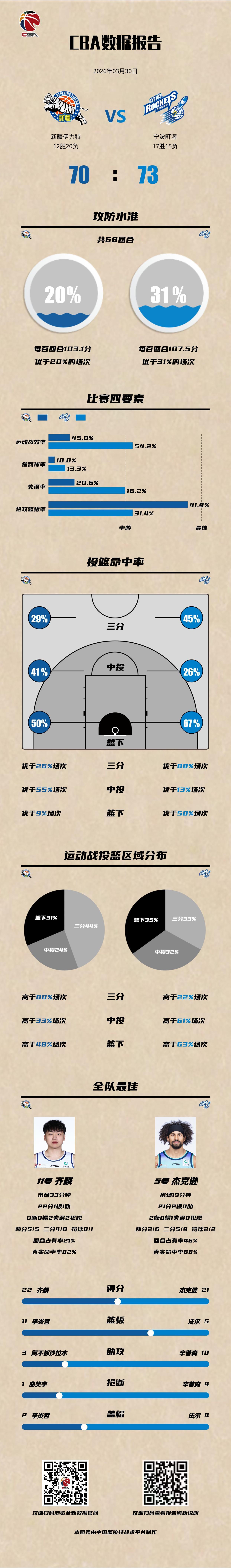 新疆伊力特 70-73 宁波町渥新疆男篮vs宁波男篮 新疆伊力特:齐麟22分,冯傲11分5篮板,李炎哲4分11篮板2盖帽; 宁波町渥:杰克逊21分2抢断,辛普森12分5篮板10助攻4抢断,罗凯文10分4篮板。以城之名