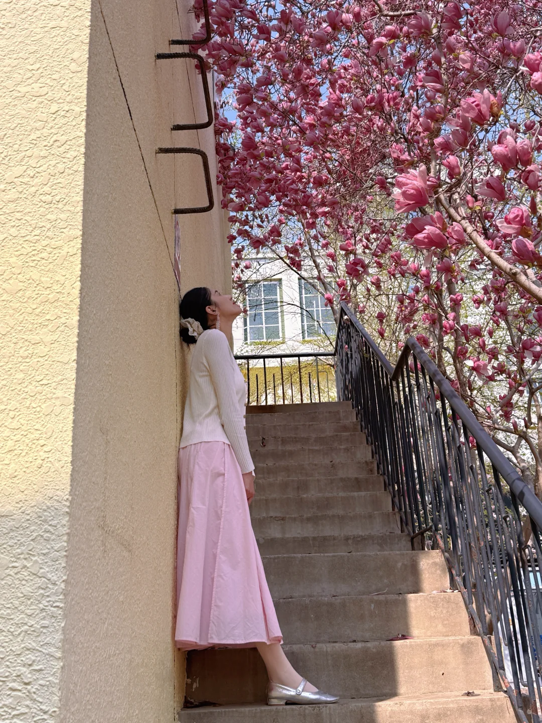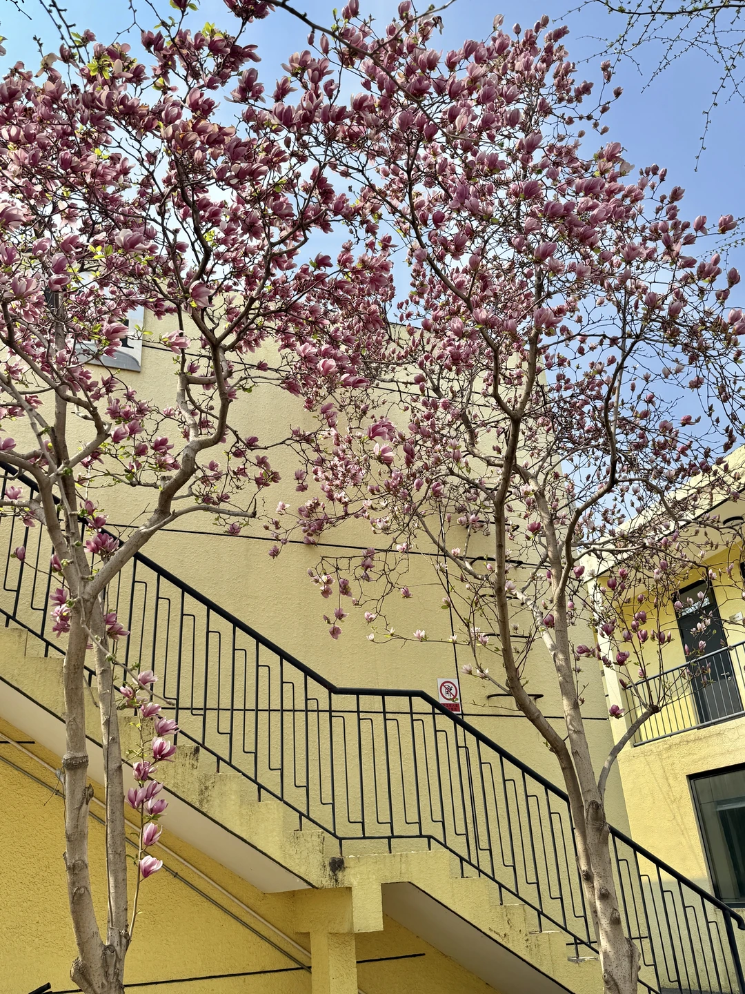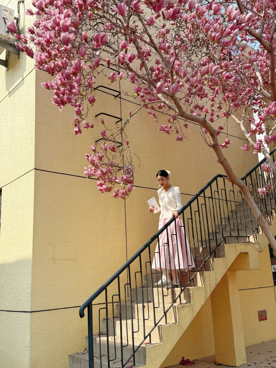 就是首图机位了,这里蕞好拍,黄色建筑,人物现在楼梯上,取玉兰为前景,2X拍照,角度🉑参考图片📷