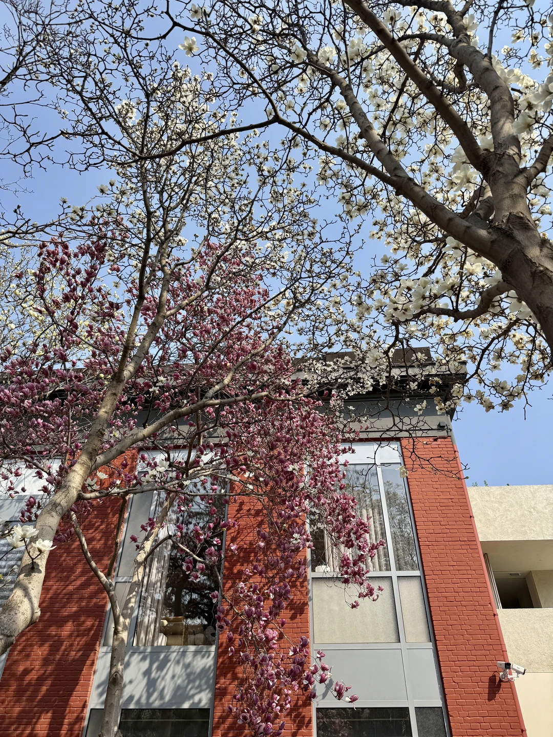 在院子穿过长廊的后面的院子里,前面有两颗白色玉兰,2X拍远景📷
