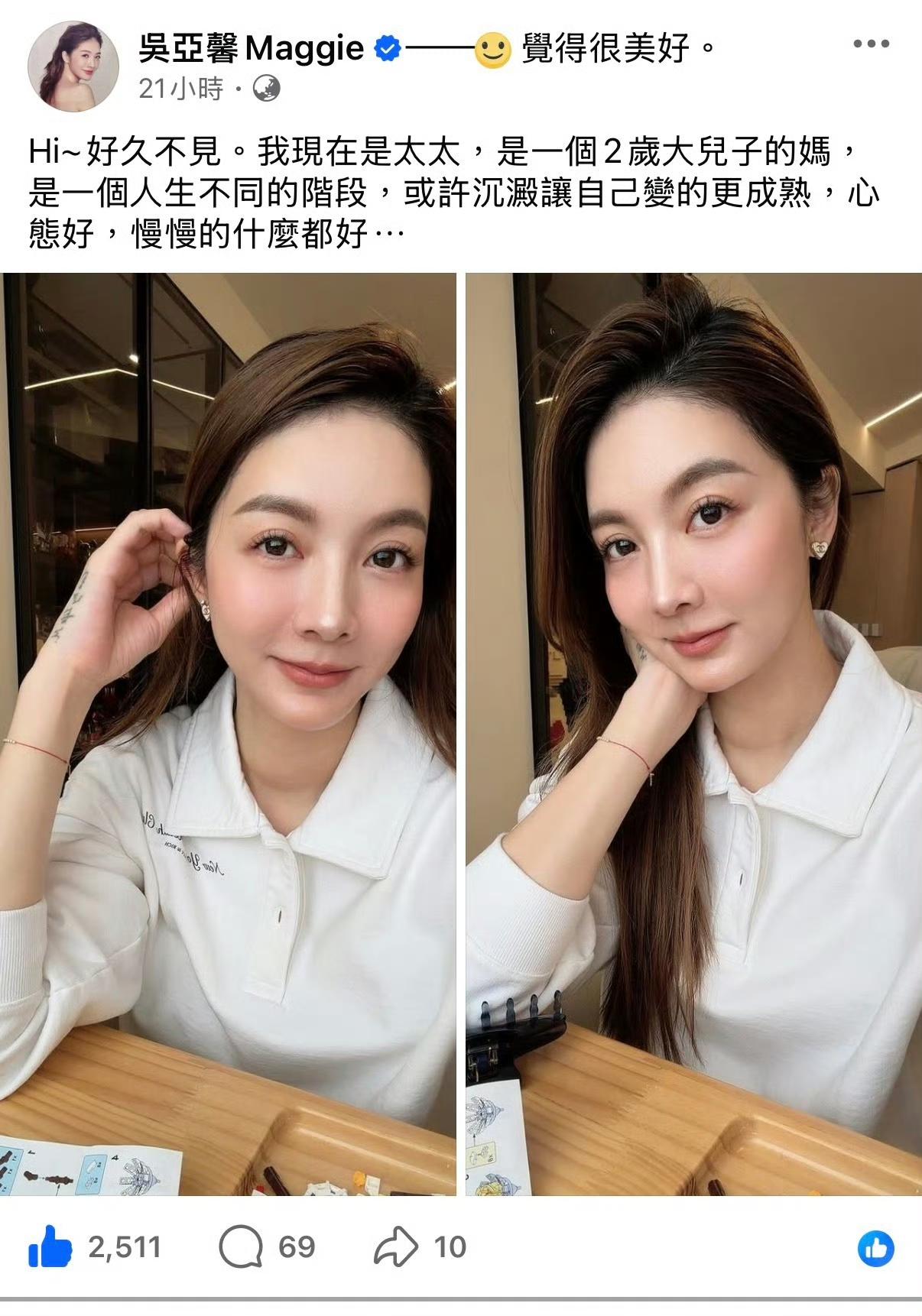 42岁的吴亚馨近日分享近况,透露已有一个2岁的孩子,并谈及中年育儿的经验。她表示