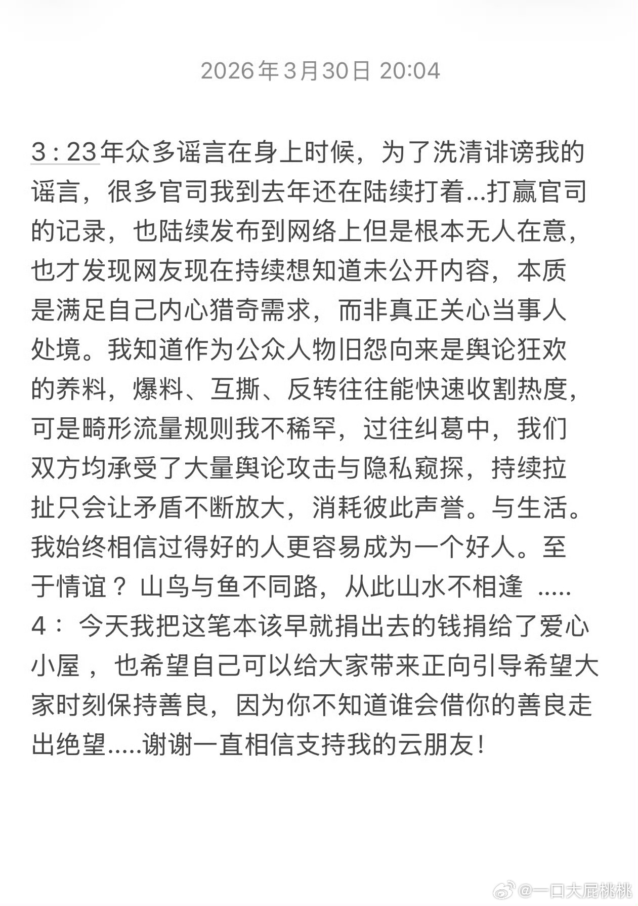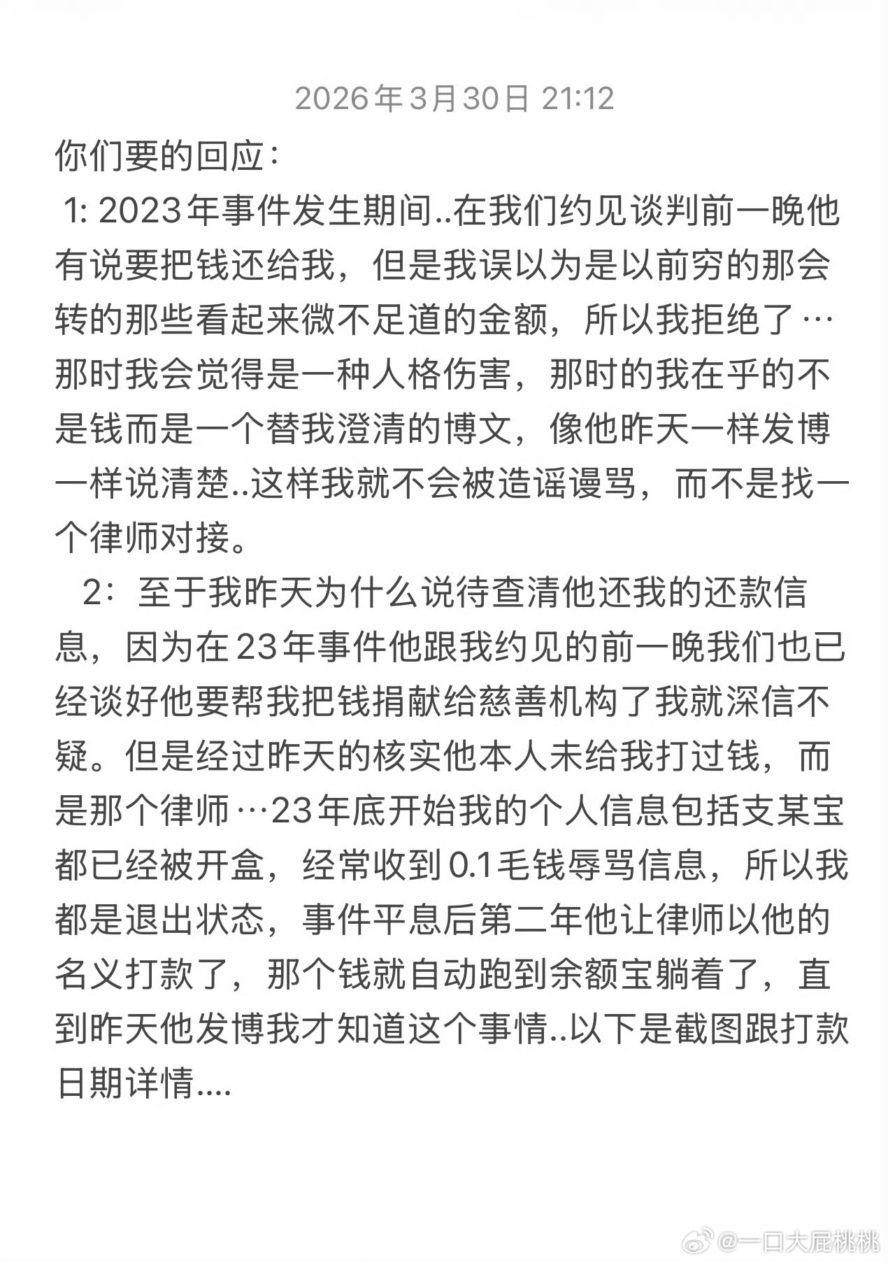 吴楚一回应陈牧驰了~省流版总结:1. 陈提出还钱,吴诉求是澄清谣言而非💰,拒绝了还💰。2. 陈委托律师向吴楚一转合计63392.8元。3. 吴因个人信息泄露、账耗长期未登录,直到2026年3月才知道💰到了;4. 吴将💰捐了