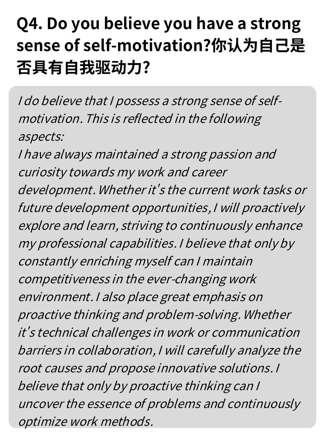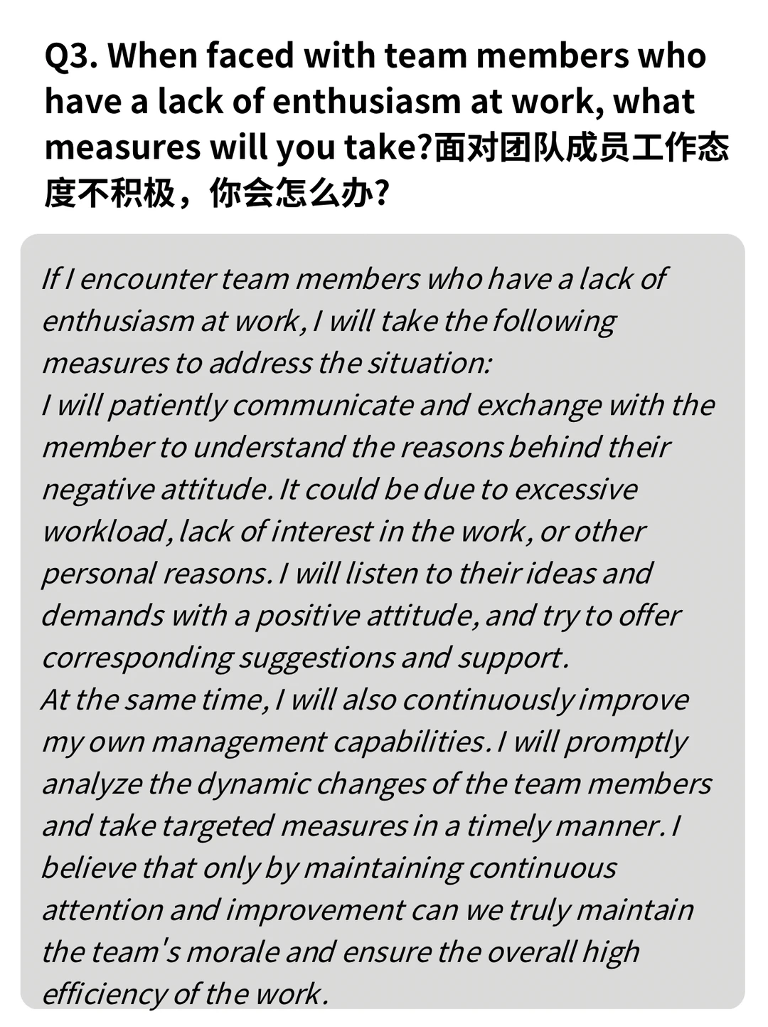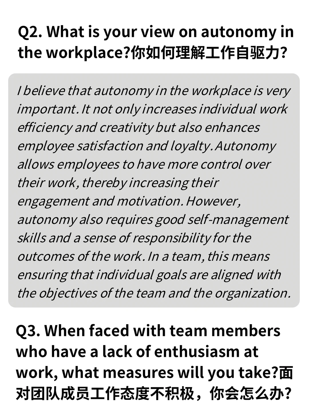 外企英文面试并没有想象中那么难,只要你做好充分的准备,自信地表达自己,就一定能顺利通过 · 今天和大家分享一些常见外企面试问题+应对思路,英文回答放在了图中 · 🔵 Q1. How would you assess your work style?你的工作风格是什么样的? - 先从对工作的规划来说,比如如何通过设定目标、制定计划和优先级排序安排工作 - 再从你团队合作中风格,比如团队中角色,如何支持团队成员以及如何处理冲突 - 如果你的工作经常是独立完成的,可以从你解决问题的方法入手 ✅ 外企面试的英文回答话术,👀看上图‼️ · 🔵 Q2. What is your view on autonomy in the workplace?你如何看待工作中的自主性? - 先说出自主性在工作中的重要性,如提高工作满意度、激发创造力 - 给出你的具体case,体现工作中的自主性 - 这个case需要体现利用自主性来提高工作效率和质量 - 例如通过自我管理项目或优化工作流程 ✅ 外企面试的英文回答话术,👀看上图‼️ · 🔵 Q3. 面对团队成员工作态度不积极,你会采取什么措施? - 描述你如何通过观察和反馈来识别团队成员缺乏热情的迹象 - 了解他们缺乏热情的原因,从一个原因入手给出对策就ok - 说明你如何跟踪进展,展现你有始有终的态度 ✅ 外企面试的英文回答话术,👀看上图‼️ · 🔵 Q4. 你认为自己是否具有自我驱动力? - 描述你对自我驱动力的理解 - 如何影响你的工作表现和职业发展(这个要说积极正向的case) - case中具体说出你如何通过持续学习和成长保持motivation ✅ 外企面试的英文回答话术,👀看上图‼️ · 🙋‍♂️(求职版) 💙我是瑞池,分享外企求职的方方面面 -