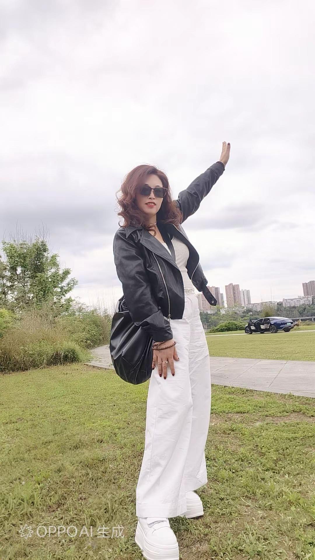 ☀️今日份公园ootd来啦~ 🌿黑色皮衣配白裤也太酷了吧!😎坐在折叠椅上晒太