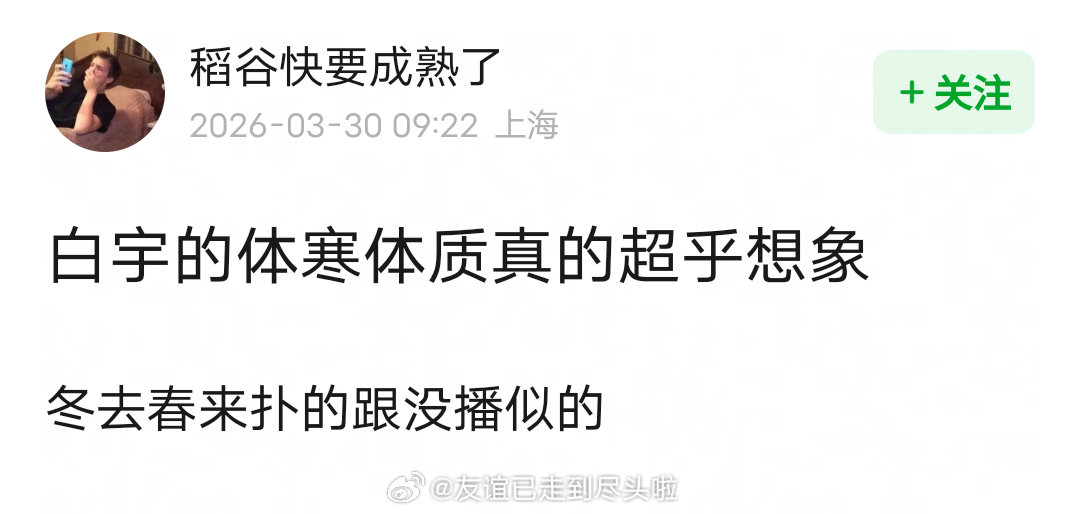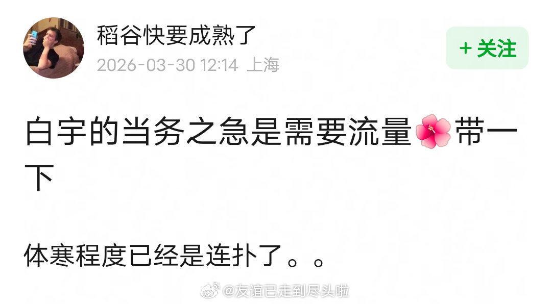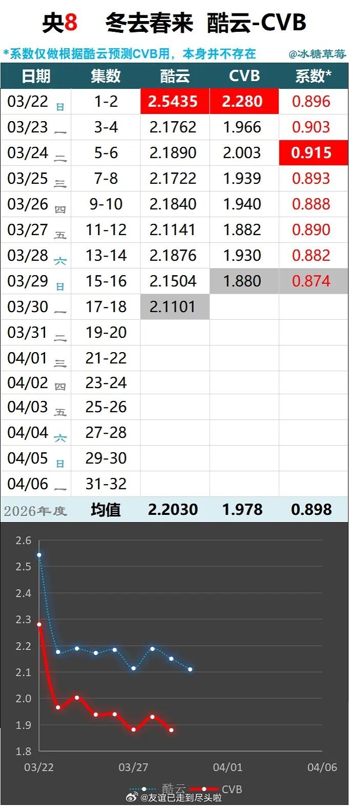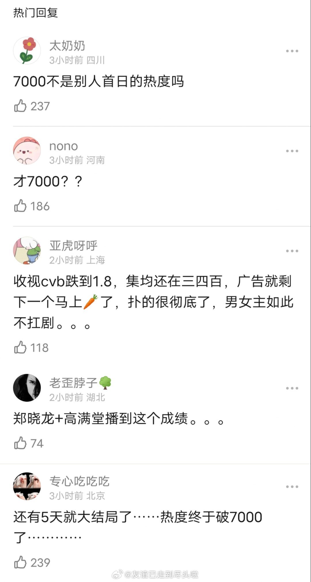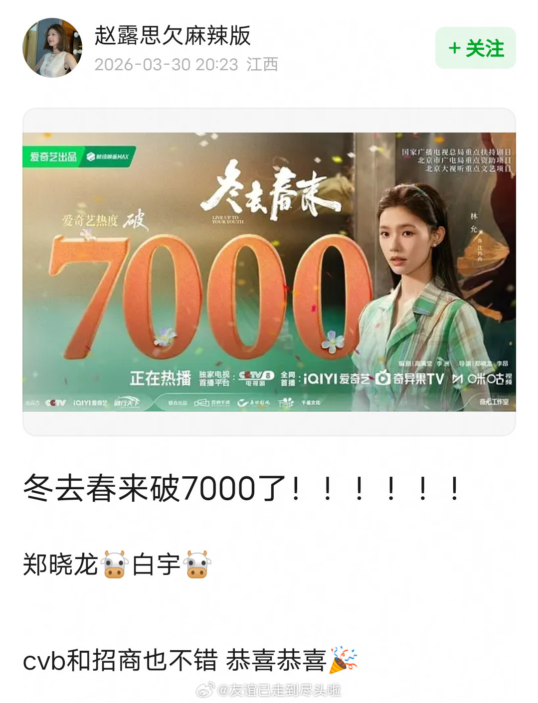 《冬去春来》播了一半,爱奇艺站内热度刚刚破7000,云合集均386万,cvb一直在降,首播即巅峰。郑晓龙+高满堂,同班底同为年代剧的《南来北往》,白敬亭网播和上星成绩都不错,而白宇只能打1000保卫战。白宇是真的太体寒了,感觉他需要流量花带一带,不然再多大剧资源砸下来也照样没水花。。。