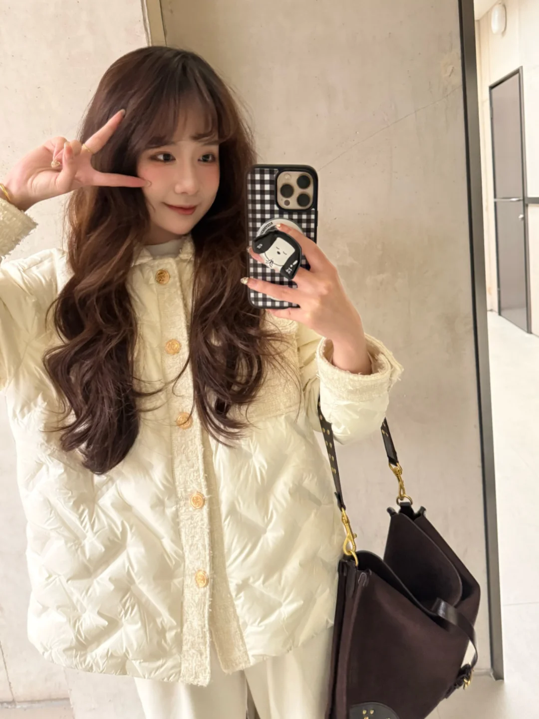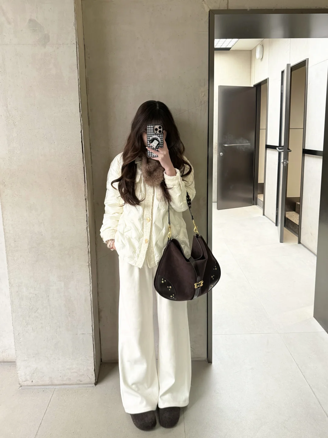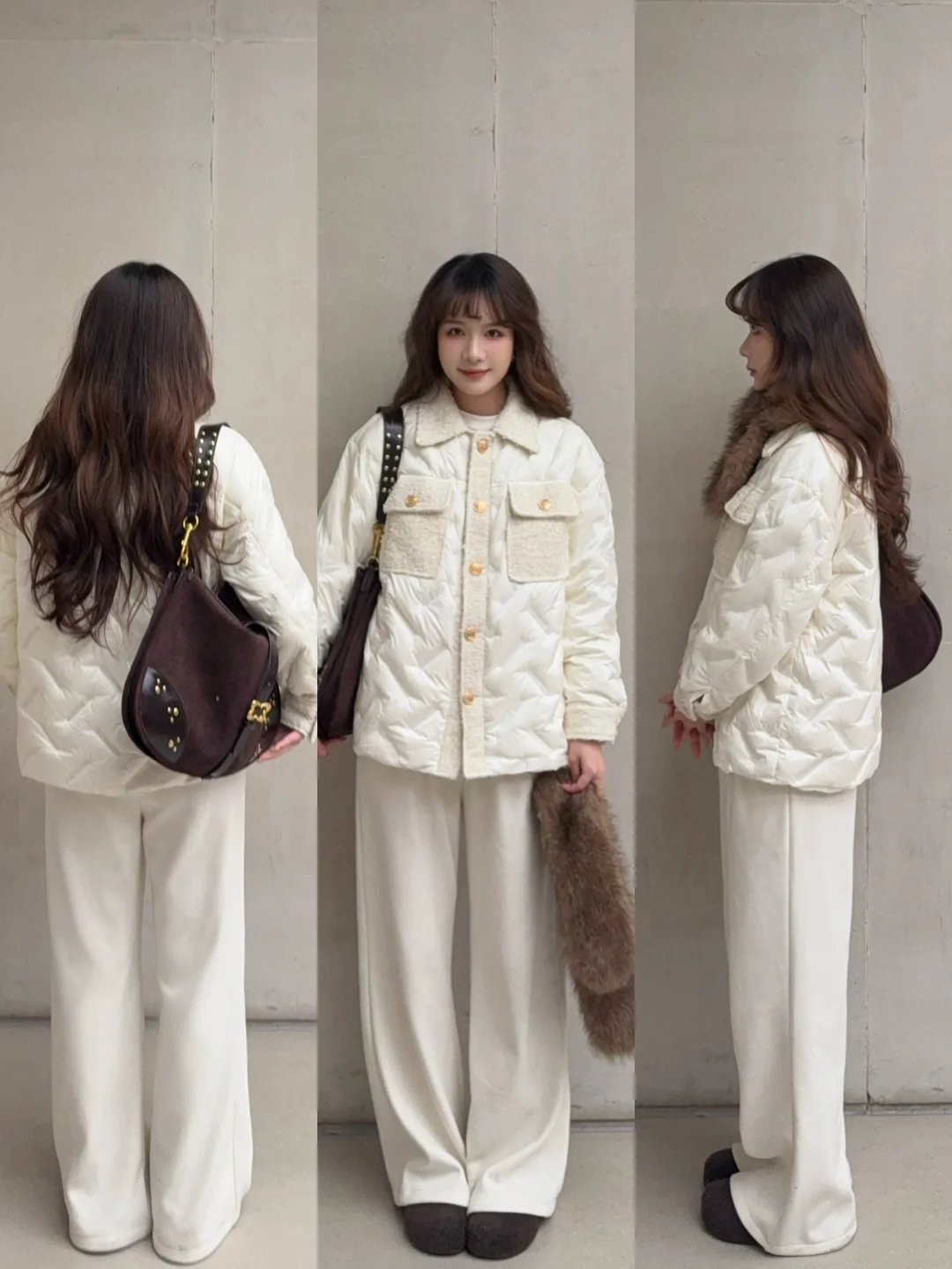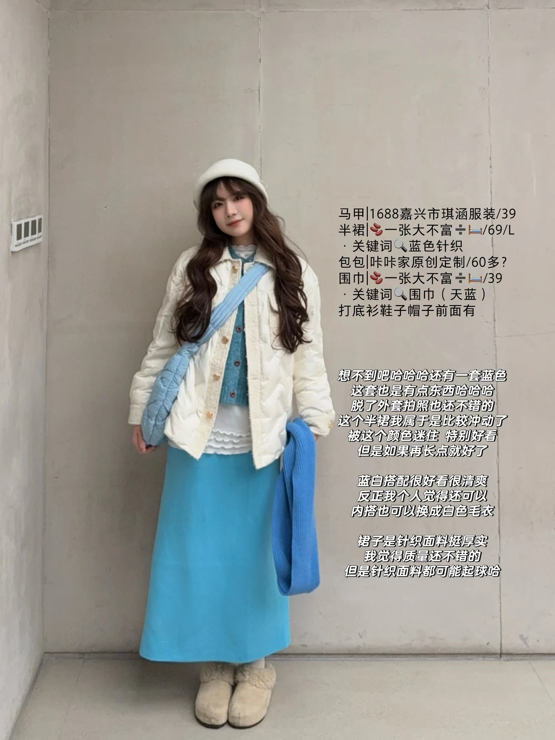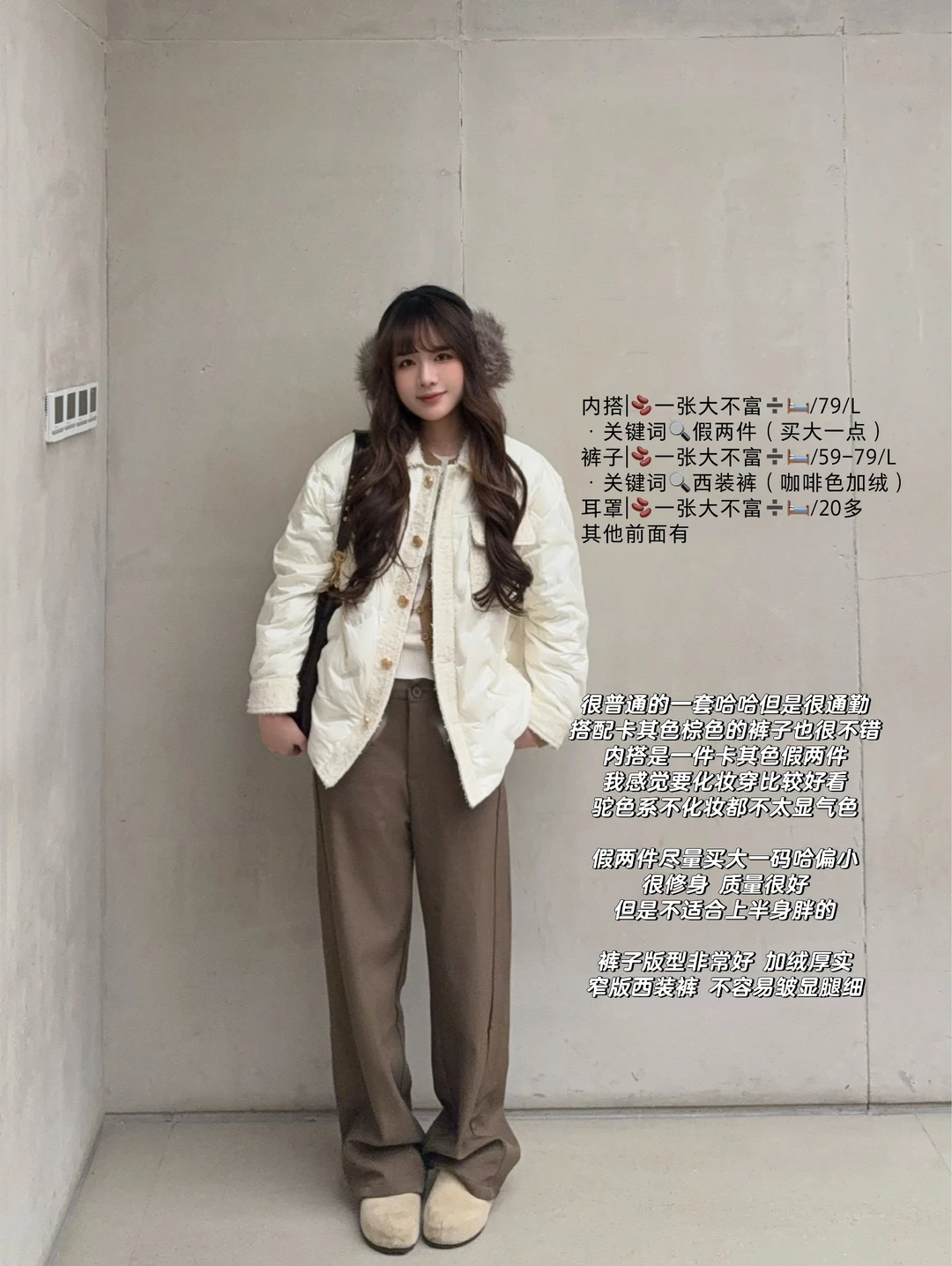 也可以搭配米色短裙短裤➕浅色打底裤➕袜套雪地靴