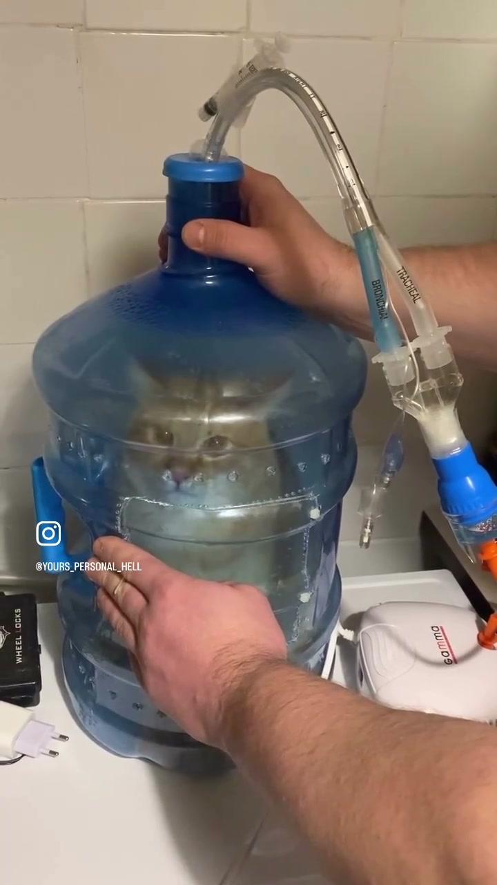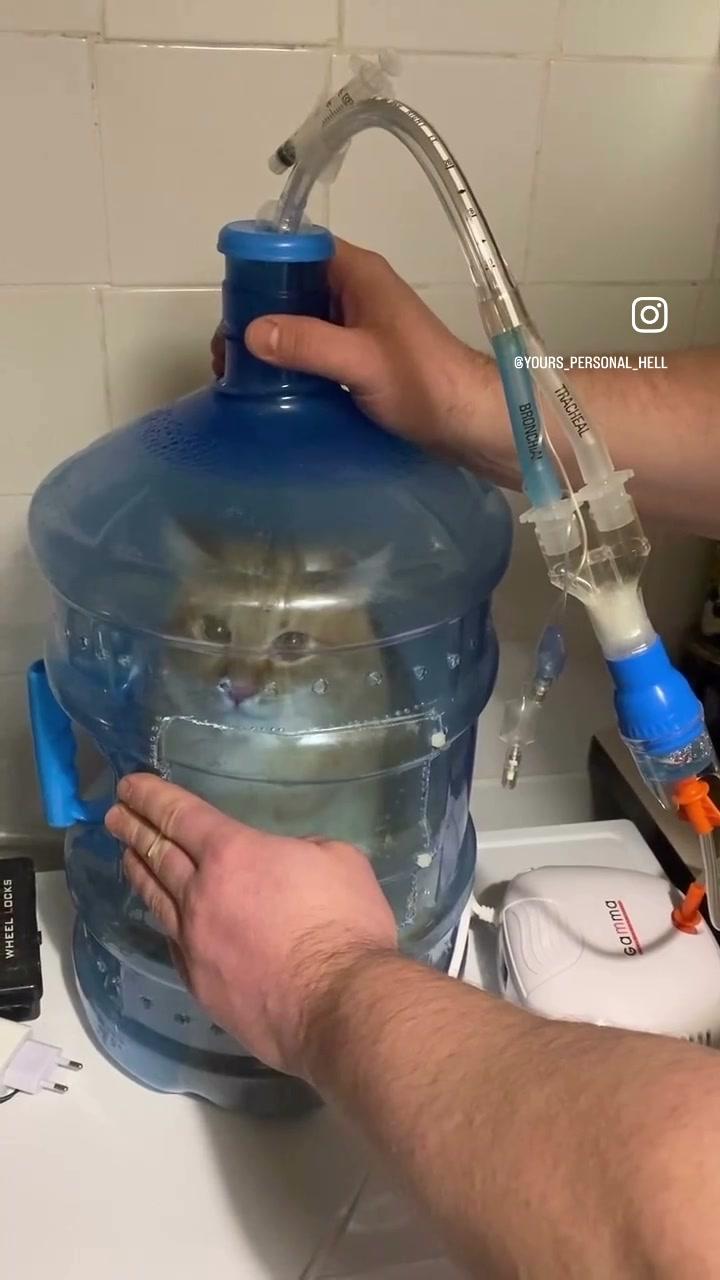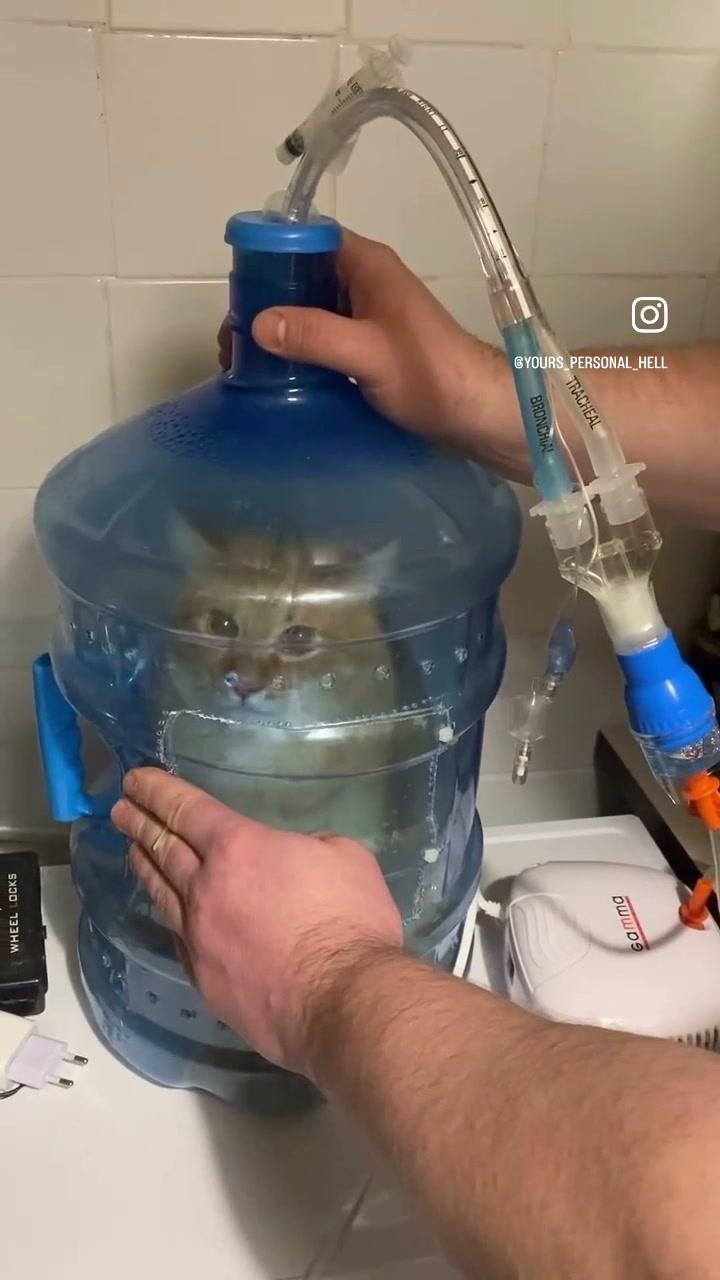 一只猫被放进塑料瓶里接受哮喘治疗,它眨着眼睛配合。