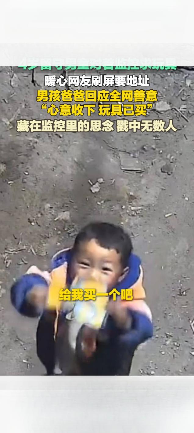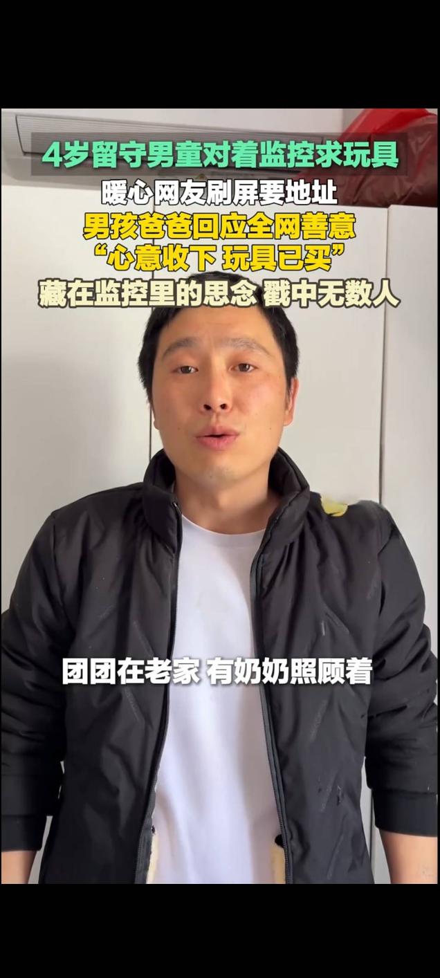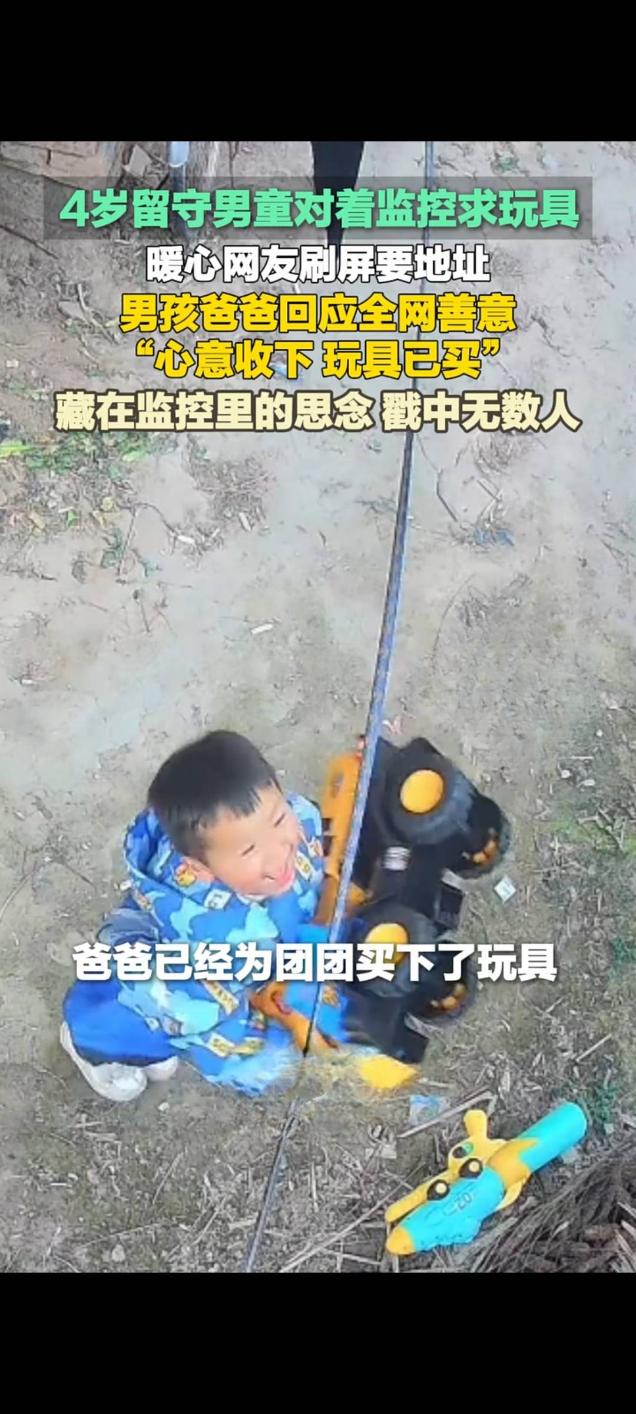 4岁留守男童隔监控求玩具 全网暖心接力 父亲婉拒好意已购玩具 近日,一段4岁留守男童对着家中监控轻声求玩具的短视频在快手等平台传播,播放量迅速破万,戳中众多网友内心,不少人留言刷屏索要地址,想为孩子送上关爱。孩子父亲随后公开回应,婉拒网友馈赠,称心意已收下,玩具已为孩子购买。 视频中,4岁男孩团团因羡慕小伙伴的玩具,不敢过多打扰家人,便踮起脚尖,拿着玩具包装纸对着监控,小声向在外务工的爸爸许愿。孩子父母常年在外地工作,孩子由家中老人照料,监控成为父子隔空沟通的重要纽带。 视频走红后,大量热心网友被孩子的纯真与懂事打动,纷纷在评论区询问家庭住址,希望邮寄玩具表达心意,还有网友主动提出发红包,都被孩子父亲李先生婉言谢绝 。李先生表示,看到全网善意十分感动,大家在外打拼都不容易,不愿增添网友负担。 目前,李先生已为团团购买了心仪的玩具,孩子收到后十分开心。这段小事既展现出留守儿童对亲情的渴望,也汇聚了陌生人的温暖善意,传递出朴实而真挚的正能量 。四岁男童对着监控要玩具 网友意暖心相送