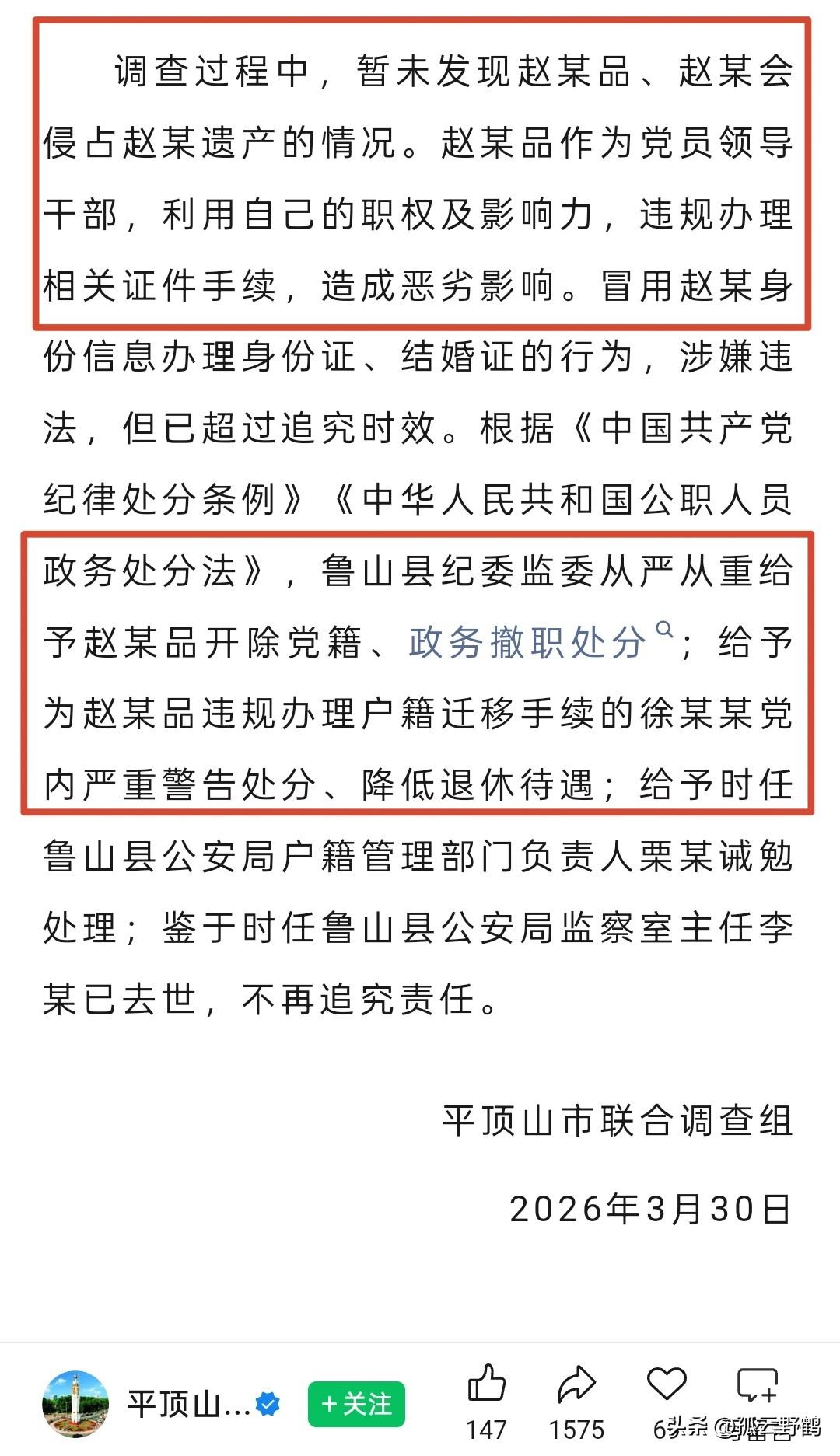 官方通报“鲁山舅舅娶亡姐”案疑点重重,不管怎么样,舅舅已被撤职,但孙某菲愿望落空,想要拿回遗产还得打官司。 经平顶山市联合调查组调查结果显示: 孙某菲母亲赵某与赵某品、赵某会系姐弟妹关系。2008年12月3日,赵某因病去世,彼时孙某菲年仅9岁。 在处置赵某遗留商品房时,因房屋中介要求将赵某及孙某菲的户口迁出,赵某品便利用身份之便,隐瞒赵某死亡事实,通过时任鲁山县公安局监察室主任李某,安排工作人员徐某某违规为二人办理了户籍准迁手续,将户口从河北石家庄迁至河南鲁山。 更离谱的是,2009年1月,赵某品为让女友马某艳顶替赵某续缴养老保险以便日后冒领养老金,安排马某艳使用本人照片、冒用赵某身份信息,再次通过徐某某违规办理了赵某的身份证。同年1月25日,赵某品与马某艳持相关证件,到民政部门办理了结婚登记手续,上演了一出已故姐姐“嫁给”亲弟弟的荒唐戏码。 不过,后续因担心事情败露涉嫌违法,二人未实施顶替续缴及冒领行为。2014年3月,赵某品办理了赵某的户口注销手续,并提取赵某养老金账户余额11388.05元交给其父赵某勤。 调查结果公布后,相关责任人受到了应有的惩处。赵某品利用职权违规办理户籍、身份证、结婚登记等手续,已被开除党籍、政务撤职;另有1名相关工作人员被给予党内严重警告处分、降低退休待遇。不过,经调查组全面核查,暂未发现赵某品及赵某会侵占逝者赵某遗产的情况。 对于举报女子孙某菲来说,虽然其舅舅受到了纪律和行政处分,但她所怀疑的遗产被侵占情况并不属实,或许这与她最初的预期存在差异,某种程度上可谓“愿望落空”。 相信大家也看到这其中的疑点重重,当初赵某品可是正科级干部等职,并不差钱。而且也有40多岁了,有必要为了相处不久的女朋友去骗取亡姐养老金? 甚至为了那1万养老金走了很多关系,费了好大的劲才让女友顶替亡姐身份跟他结婚,结果怕事情败露就轻易放弃了顶替续缴及冒领养老金行为? 第二就是孙某菲小姨这边,赵某的商品房卖了35万,门面房收了4.48万租金,扣除房贷10.17万、银行欠款2.55万、住院费2.44万后,剩下的约24万,由小姨赵某会代管,全部用于抚养孙某菲,包括日常开销、重疾险和平安险。 但是官方通报中却没有提到最重要的一点那就大量的珠宝去哪儿了? 孙某菲说过,她小时候经常陪妈妈去进货,生前有大量的珠宝,现在只剩下一个铺子其他的都不见踪影,而且仅有的铺子她也不能继承,原因还是亡母被舅妈顶替,名下不止一个子女。 而且,小姨对她也不好,经常被打,常常吃不饱穿不暖的,终于等到成年了,能拿回妈妈遗产过的好一点,结果现实给她一棒槌,让她走投无路。 所以,这样的结果对于孙某菲来说,愿望落空,她想要拿回遗产还得打官司。 看到最后,令人唏嘘不已!