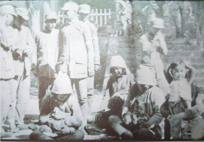 1938年,徐州会战暨台儿庄战役期间,虽然最终取得了战役胜利,但在拉锯战中,部分军官家眷不幸落入日军手中,照片是战后被俘获国军第68师军官家眷被解救。 几位国军女眷带着孩子席地而坐。她们穿着单薄的旧衣,头戴白布帽,神情麻木、垂头向地,尽显绝望与无助,其中一位约四岁的小女孩,面对镜头露出天真的神情。