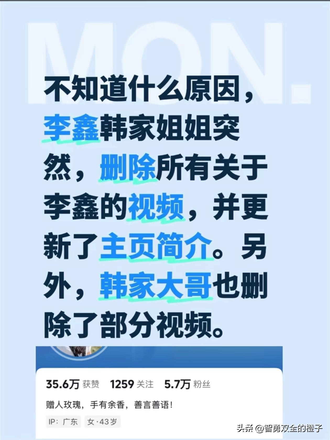 李鑫姐弟俩这是闹掰了? 自从李鑫回到汕头后,姐弟俩的关系就不太对,姐姐去医院没告诉李鑫,网友把消息告诉李鑫后,李鑫说他给姐姐打电话发消息,姐姐也都没回他。 今天李鑫和韩家姐姐,突然同时清空了账号所有的视频,韩家哥哥也把关于李鑫的视频删除了,不知道是什么原因! 据知情人透露,似乎和韩家“收养”李鑫这事有关,有可能是不合法的收养,知名记者李达森也发视频暗指这事。 姐姐李林并没有对这事进行回应,她发了个视频,说她已经出院了,后面可能会直播带货,也没有解释她为啥不回弟弟的消息。 找到亲人本应该是值得高兴的事情,但这后续真的让人难评,姐弟俩除了刚见面比较和谐,后面不断的出现矛盾。 有什么想法,一家人私下好好沟通,不必诉诸网络,本来可能是个小问题,到网上就会被无限放大。 按这个情况,估计真要像李鑫说的那样,他们姐弟没法做了,大家怎么看呢!