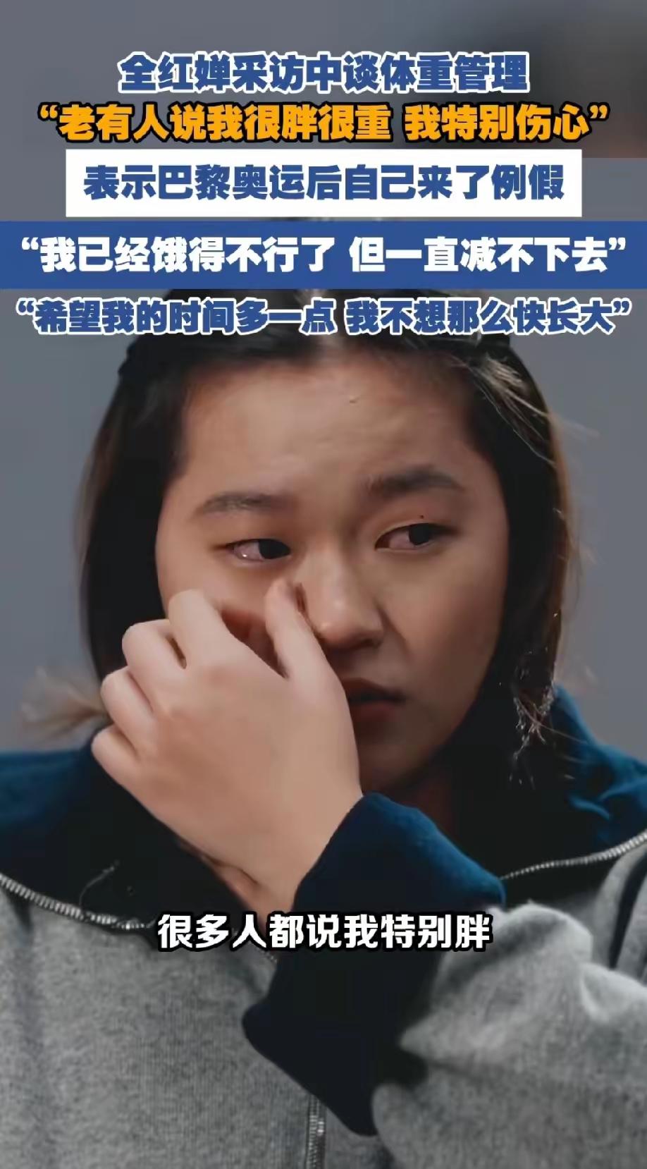 太心疼了!全红婵采访落泪,句句都戳心。 被网友说胖说重,她难过到偷偷减肥,每天只吃一顿,饿到浑身发软,体重还是下不去。巴黎奥运后她迎来生理期,从小女孩慢慢长成少女,身体自然发育,这本就是最正常的成长规律,却让她背负了巨大压力。 她已经拼尽全力,不该被恶意评判。少女的成长从来不是错,不必迎合所有人的眼光,健康快乐比什么都重要。 希望全妹放下焦虑,做好自己就够了,外界的杂音不必放在心上。 你们愿意给全红婵一句鼓励吗?