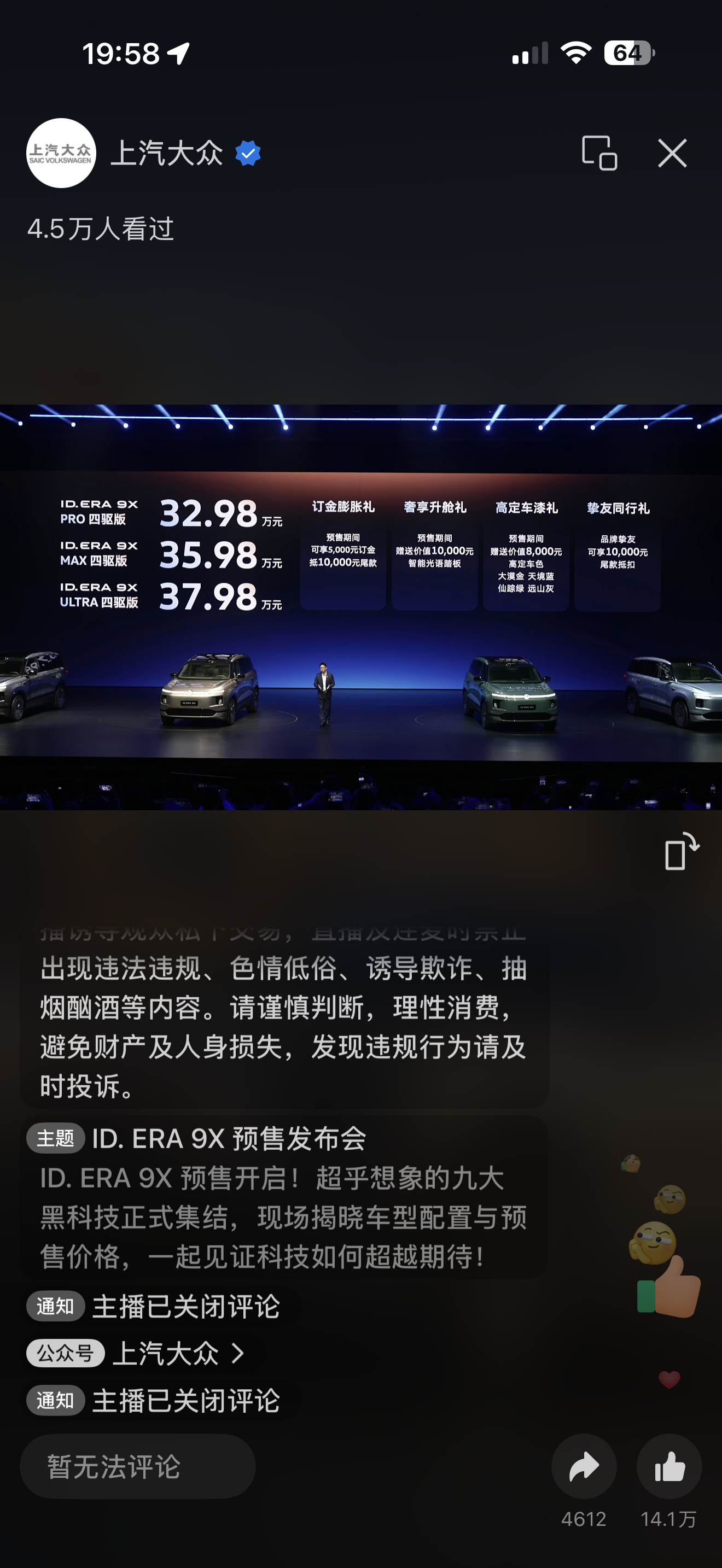 大众ID.ERA9X终于开启预售了,这车预热也挺长一时间了,目前来看配置还是挺