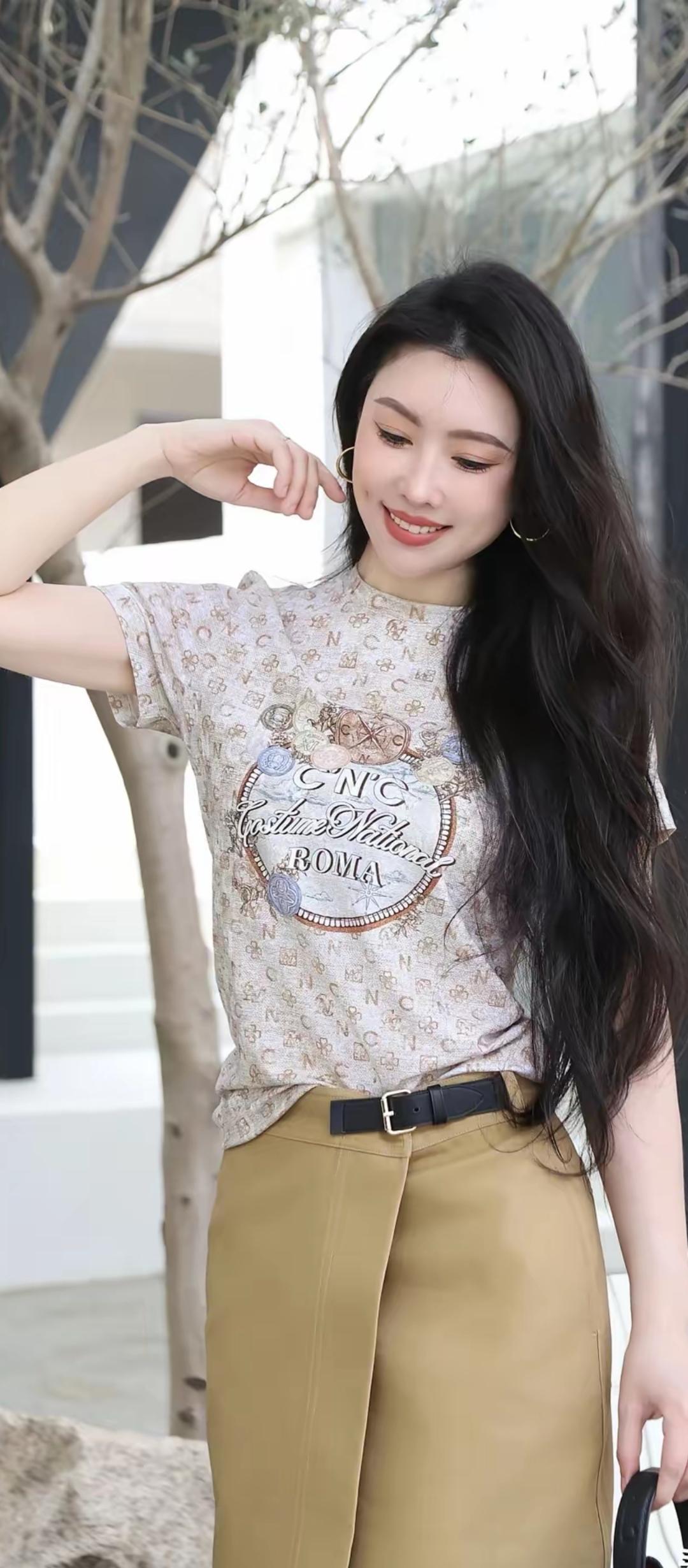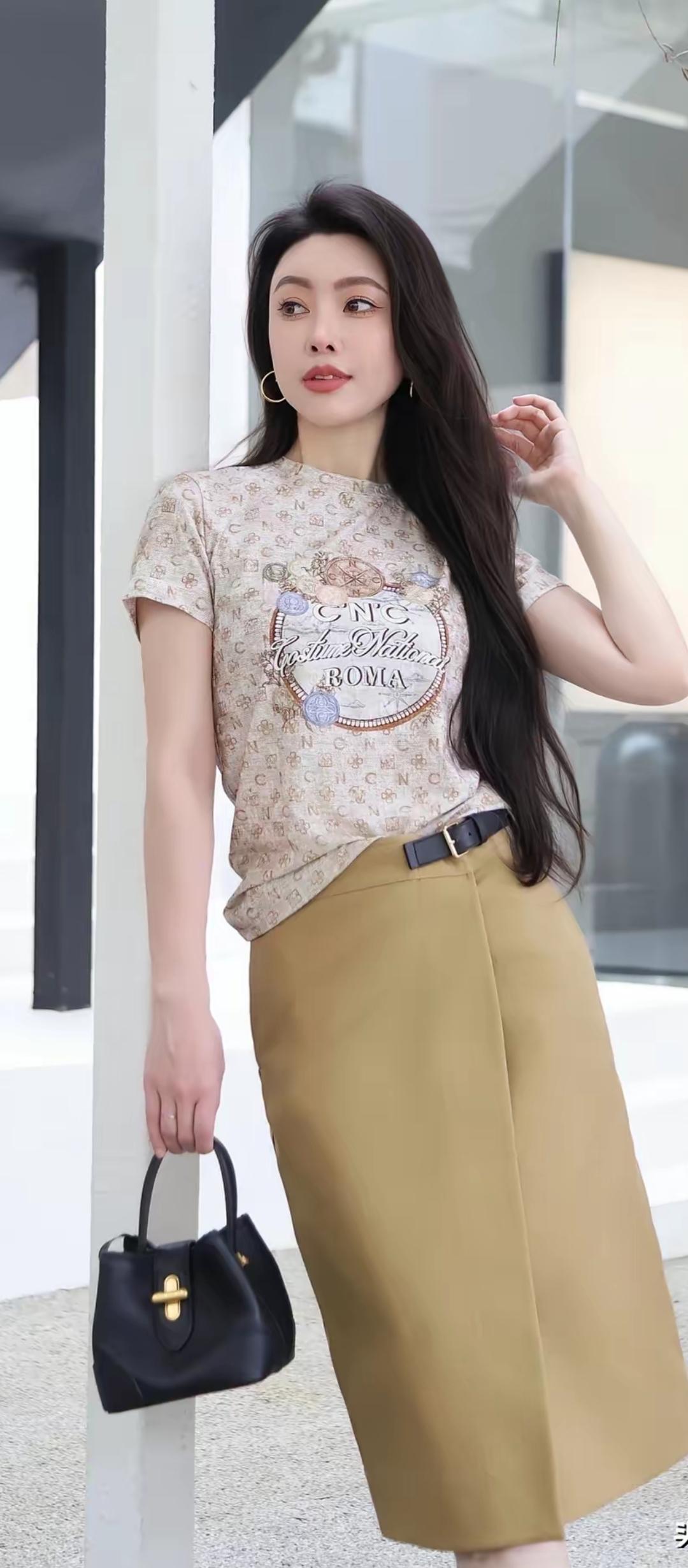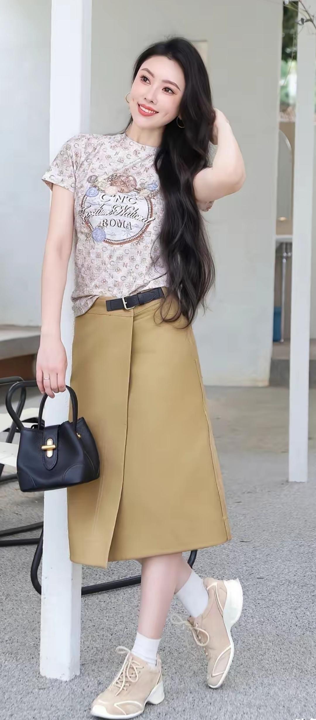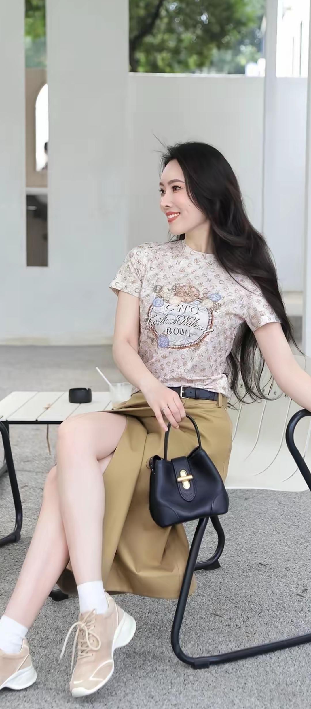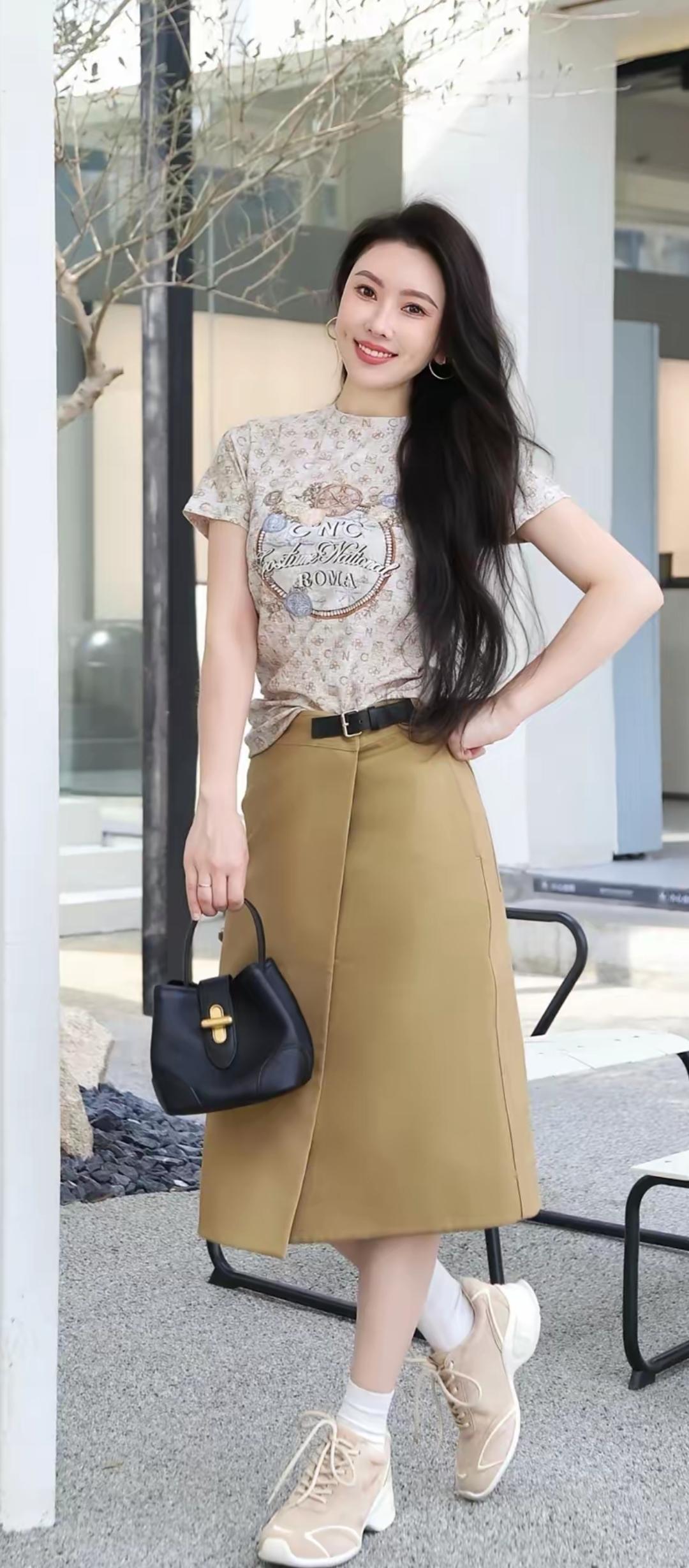 优雅穿搭指南:复古印花T恤+米色半身裙,手提包点缀,完美出街!👗👠👜