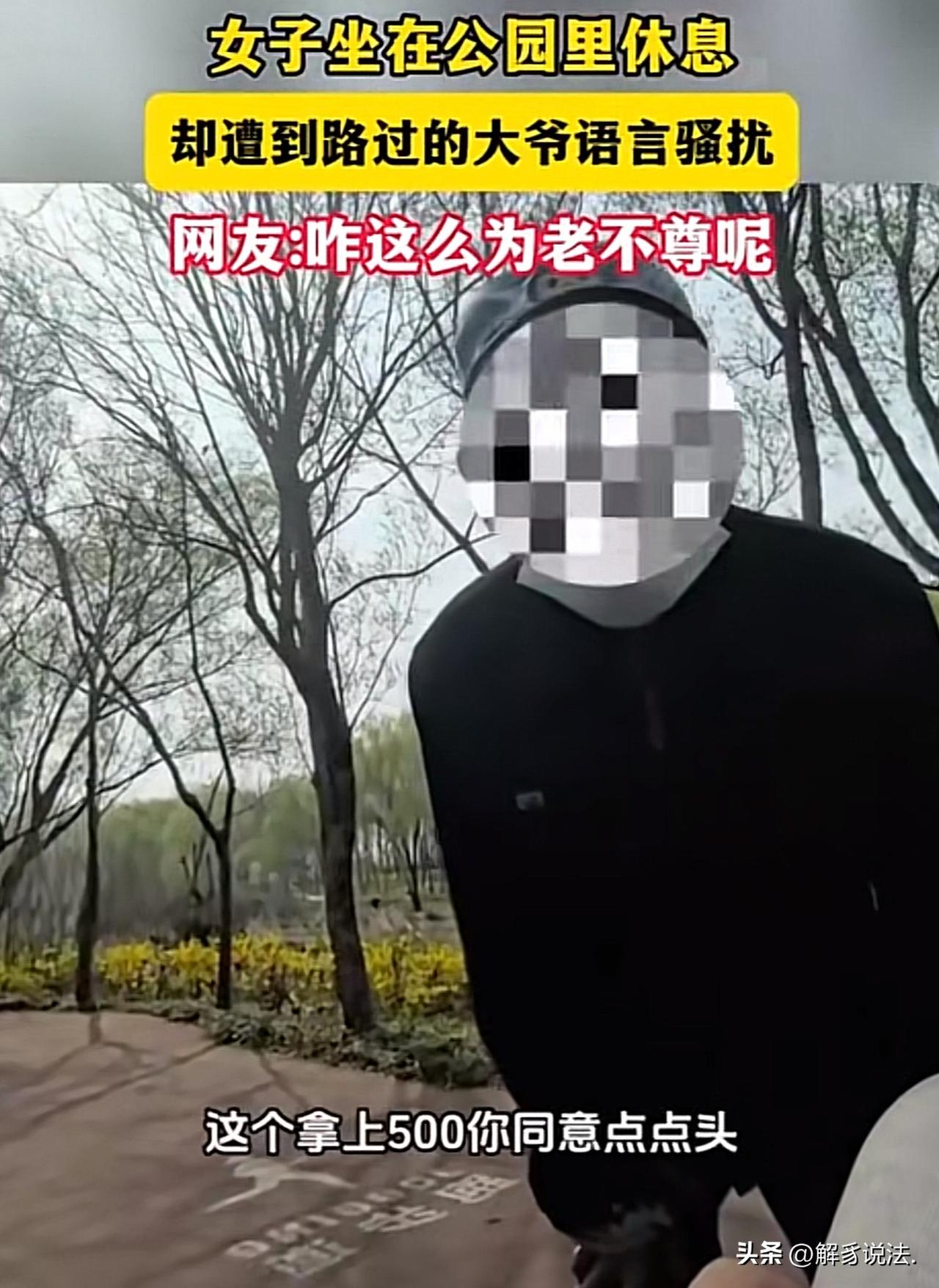 女子独自在公园歇脚,一大爷东张西望的走了过来,探头探脑的询问:给你500块,咱俩耍耍,同意就点点头,不同意就摆摆手!女子听后,又羞又怒,呵斥老人离开。事后,女子将视频发布到了网上,让网友给评评理。网友:怪你自己坐错地方了! 那天天气晴得透亮,风里都带着青草香,女子想着一个人去公园逛逛,松松快节奏的日子,吸两口新鲜空气。 走累了,她寻到公园角落一处僻静长椅,坐下歇脚,看着眼前抽芽的树、冒绿的草,心里软乎乎的,掏出手机想把这股子生机拍下来存着。 没等她按快门,一个佝偻着背的大爷慢慢挪了过来。 他穿黑上衣,帽子口罩捂得严实,腿脚看着不太利索,明显是上了年纪的人。 这角落本就没几个人,大爷一路东张西望,眼神飘来飘去,女子心里先犯了嘀咕,却也没往坏处想,只当是老人找地方歇脚。 可大爷没往别处坐,反倒弯着腰把脸凑得极近,压低声音支支吾吾:给你500块,咱俩耍耍。 这话像块烧红的烙铁,“啪”地烫在姑娘耳朵上。 她脑子“嗡”的一声,差点没把手机扔出去,又气又臊,脸瞬间涨得通红。 她盯着眼前这个垂垂老矣的男人,怎么也想不通,光天化日之下,一个陌生老人能对她说出这么不要脸的话。 她攥着手机的指节都泛白了,想骂,话到嘴边又卡壳,对着个老人人,她实在拉不下脸破口大骂。 大爷像是看穿了她的犹豫,慢悠悠补了句:同意就点点头,不同意就摆摆手。 女子压着火,假装没听懂:你说啥?干嘛啊? 大爷梗着脖子,又重复了一遍:耍耍! 这两个字彻底点燃了姑娘的火气。什么尊老爱幼,那是给值得尊重的老人的,眼前这人分明是揣着坏心思来骚扰的。 她猛地抬高声音,指着大爷鼻子,怒斥:你离我远点!赶紧走! 可这大爷脸皮比城墙还厚,被骂了也不臊,反倒凑得更近,翻来覆去念叨那套混账话,赖在旁边不肯挪步。 女子的嗓门越来越大,终于引来了不远处散步的路人,大爷才收敛了些,往后退了两步,嘴里还嘟囔着“我不怪你”,那副“我大度包容你”的姿态,看得女子胃里翻江倒海,明明是他耍流 氓骚扰人,倒好像自己受了多大委屈似的。 女子全程攥着手机,把这糟心的一幕都录了下来。 回到家后,她越想越气,把视频发到了网上,想让网友给评评理,怎么会有这样的老人。 这事传到网上,网友炸锅了: 有人说,年纪大不是耍流 氓的挡箭牌,这种骚扰行为跟街头混混没区别。 也有人气愤的说:换我早扇上去了! 也有人感慨:现在有些老人仗着年纪大就肆意妄为,把公共场合当成了自己撒野的地方,败坏了整个老年群体的名声。 当然,也有人认为女子的做法不对:直接一开始就明确拒绝让大爷离远点!别这种诱导式聊天,还发网上,大爷不懂套路! 《治安管理处罚法》第42条第五项规定:多次发送淫秽、侮辱、恐吓或者其他信息,干扰他人正常生活的,处五日以下拘留或者五百元以下罚款;情节较重的,处五日以上十日以下拘留,可以并处五百元以下罚款。 同时,该法也明确将违背他人意愿的语言骚扰、肢体骚扰等行为纳入处罚范畴。 本案中,大爷在公共场合对陌生女子提出“给你500块,咱俩耍耍”等带有性 暗示的冒犯性语言,反复纠缠且被拒后仍不离开,属于典型的违背他人意愿的语言骚扰行为,已干扰了女子的正常生活与心理安宁。 女子有权当场报警,公安机关可依法对大爷作出拘留或罚款的处罚。 这一规定打破了“年纪大可免责”的误区,明确了骚扰行为无论年龄大小,都要承担相应法律责任,为公民在公共场合的人身安全与人格尊严提供了明确法律保障。