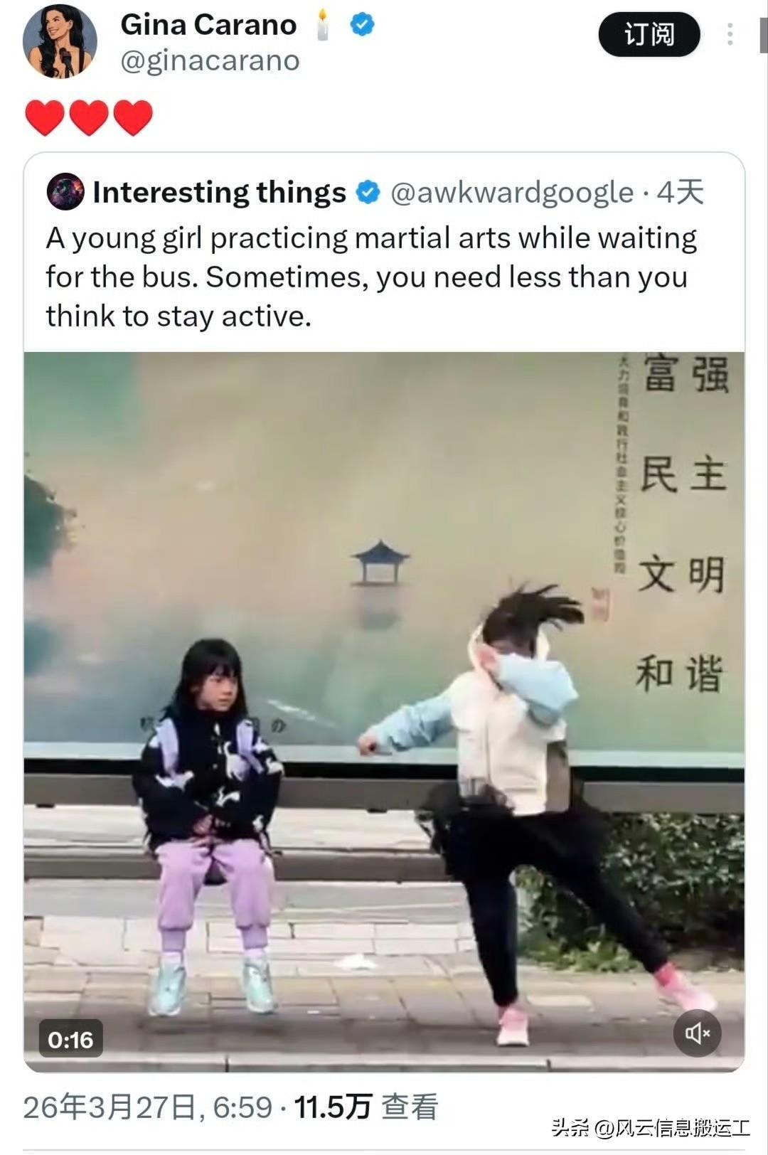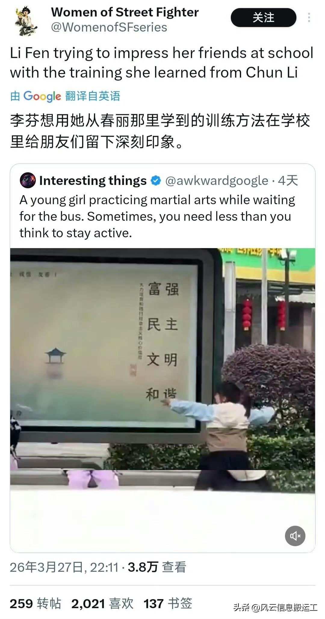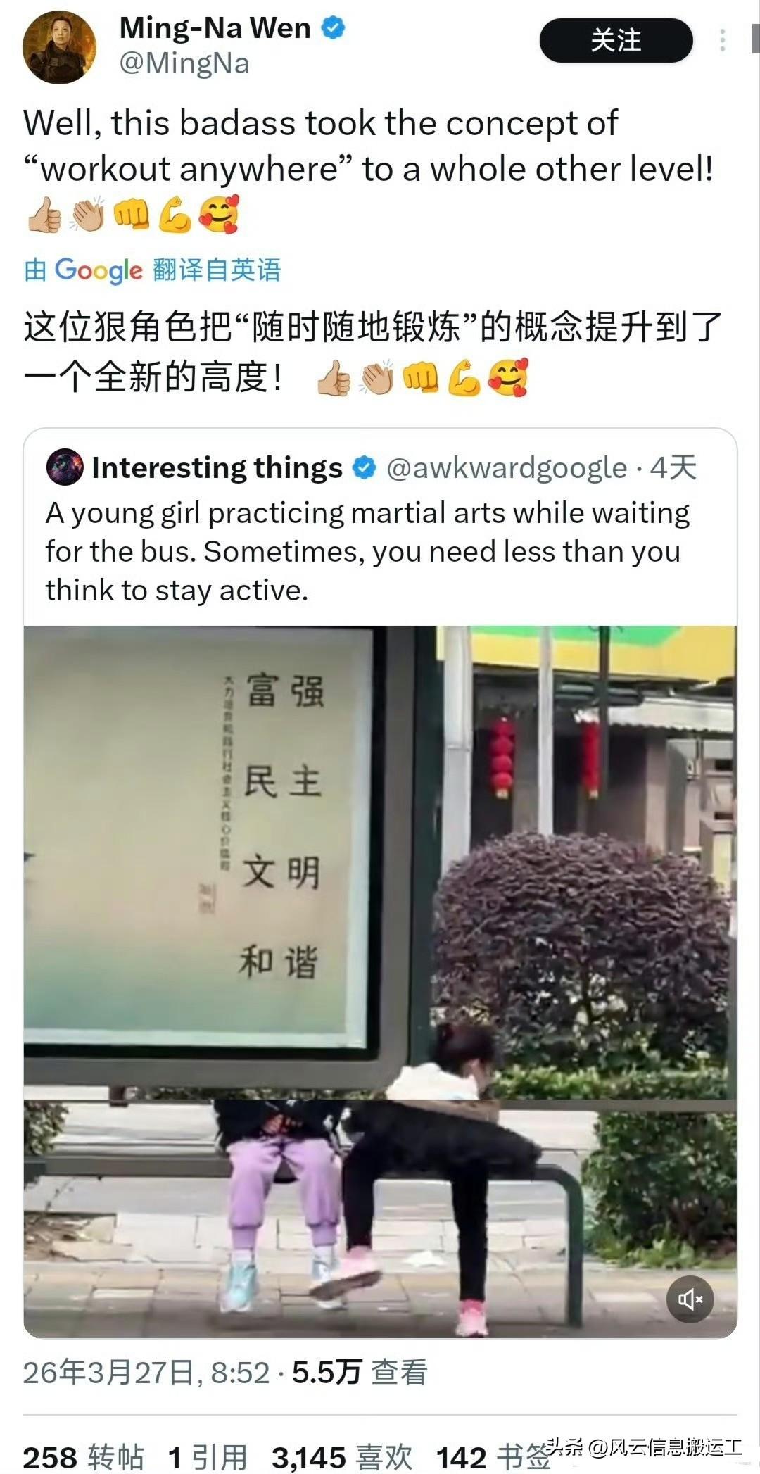 中国小女孩在公交车站练习武术的视频引起推特网友围观