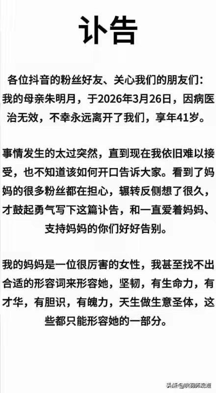 41岁美女老板朱明月去世,生前常熬夜,喜欢吃烧烤,身价几千万!网红“抗癌东东”病逝,生前是医生:别再透支生命了! 3月31日,41岁的抗癌网红“东东”因胃癌晚期离世。他曾是医生,却因长期高压和不良习惯,最终倒在了病魔之下。 核心警示: 1. 压力是“隐形杀手”:长期高压导致免疫功能下降,自然杀伤细胞活性降低30%,为癌细胞“开绿灯”。 2. “硬扛”最伤身:中年人要面子、扛责任,却忽略了情绪内耗的危害。学会求助和示弱,是成熟的智慧。 3. 历史警示:复旦女教师于娟也曾因熬夜、高压患癌离世,留下“此生未完成”的遗憾。 唤羽师观点: 健康是人生的1,其余都是0。别等到生命倒计时,才想起如何生活。从今晚开始,早点睡,放下焦虑,好好吃饭。请记住,没有什么工作,值得你拿命去拼。 今日互动: 你或你身边的人,有没有因为工作压力而忽略健康的经历?欢迎在评论区留言,让我们互相警醒,一起健康生活。 癌症女高管 朱明怡 山东小伙朱明远 患癌员工 抗癌女网红 癌症女高管 朱明怡 患癌员工