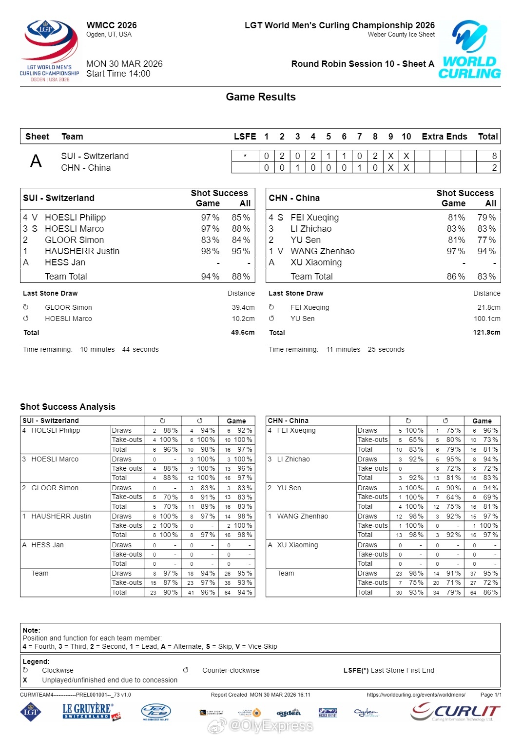 【男子冰壶世锦赛中国2-8惨败瑞士】2026男子冰壶世锦赛 3月30日美国奥格登