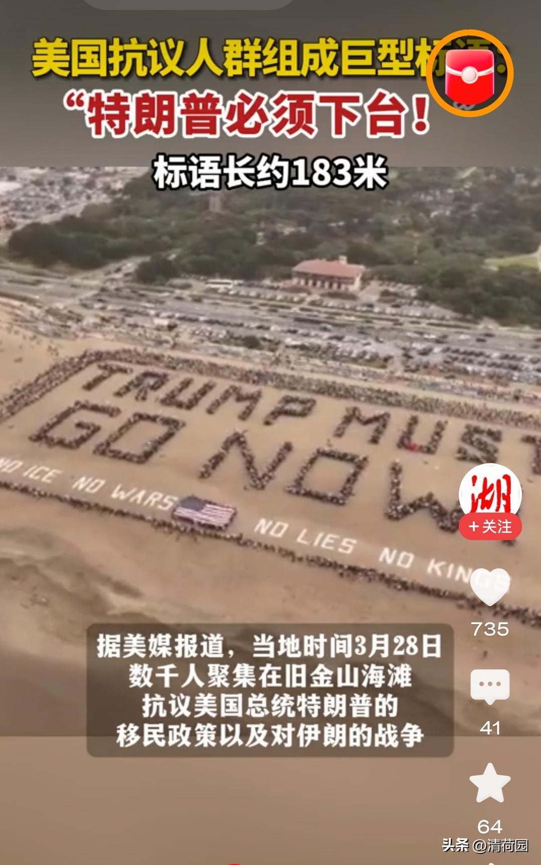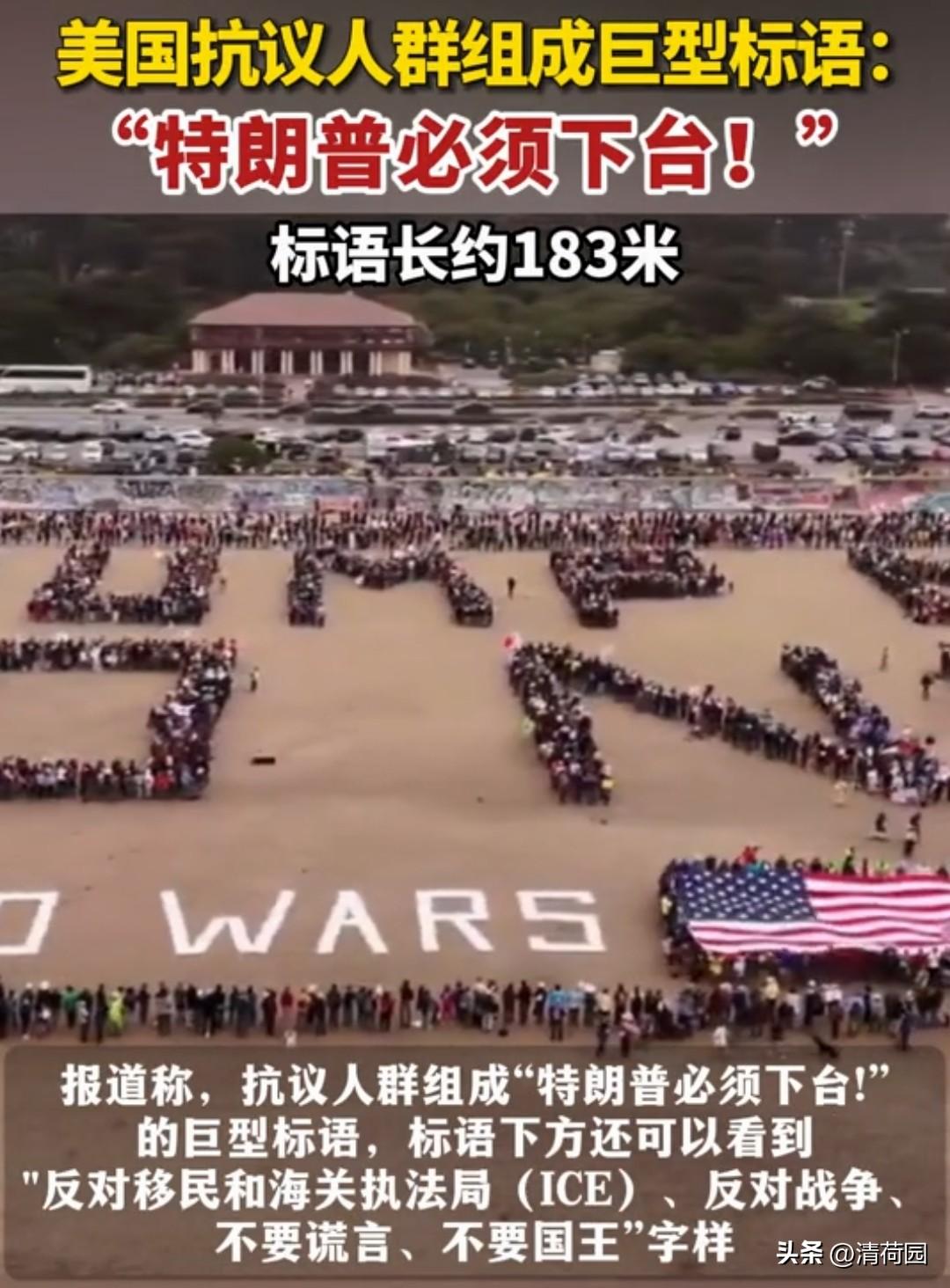 美抗议人群组成特朗普须下台巨型标语“当‘特朗普下台’的巨幅标语被各色面孔共同举起,美国这面‘民主镜子’里映出的,早已不是左右之争,而是被撕裂到底的信任危机。”
