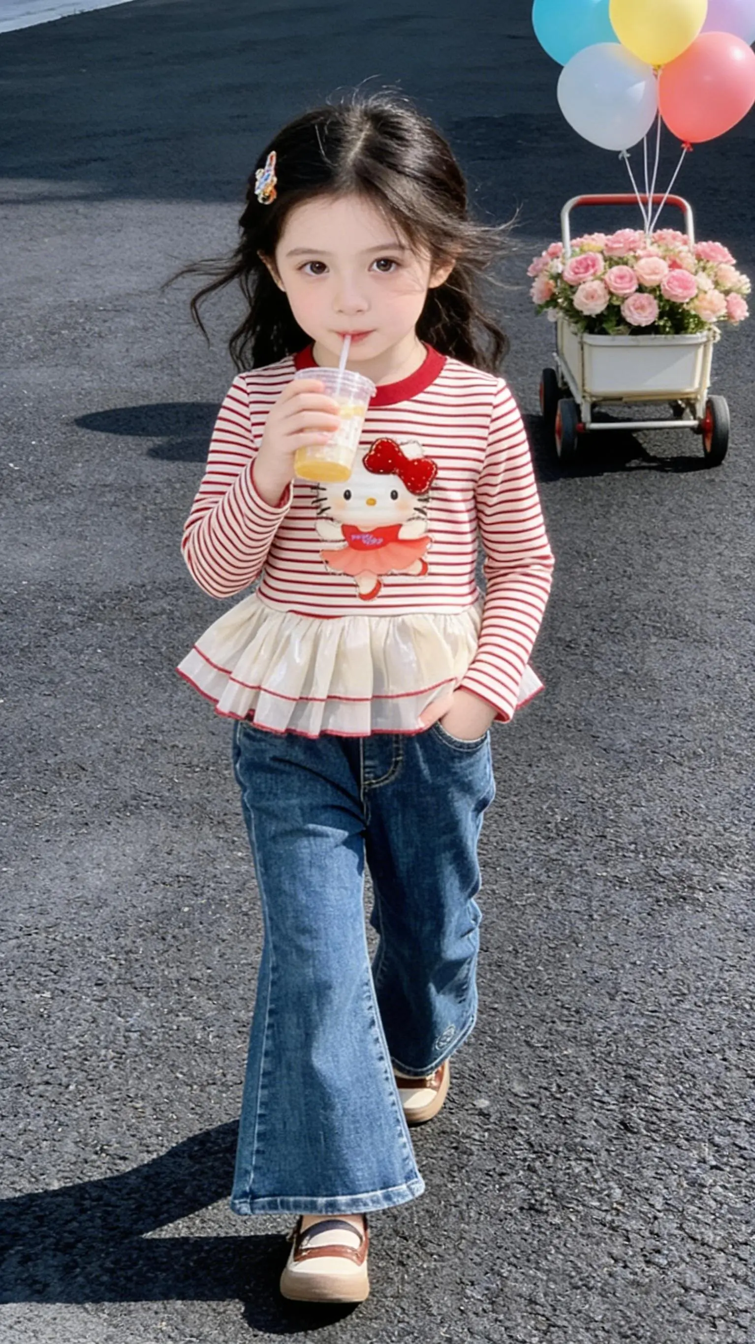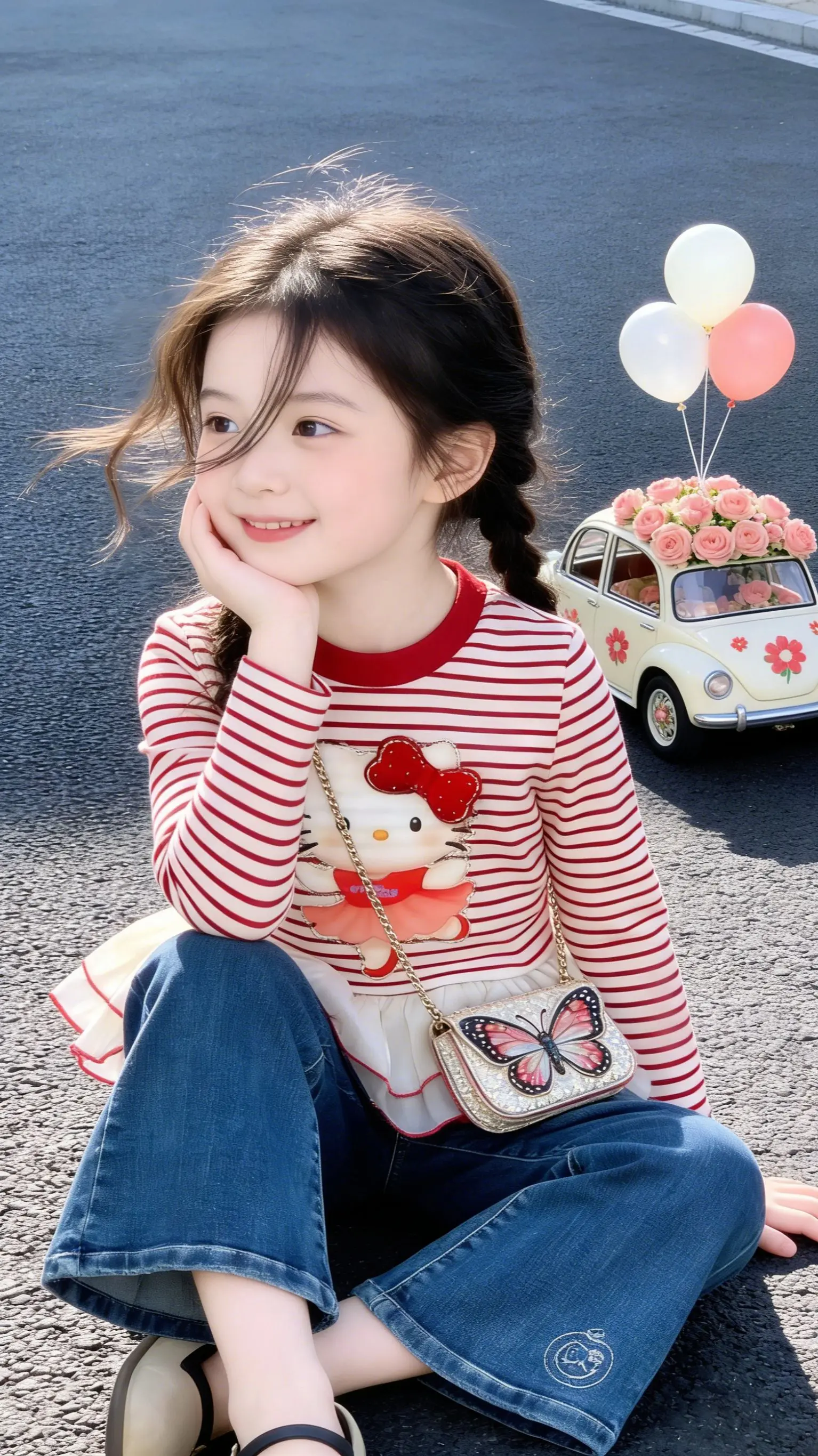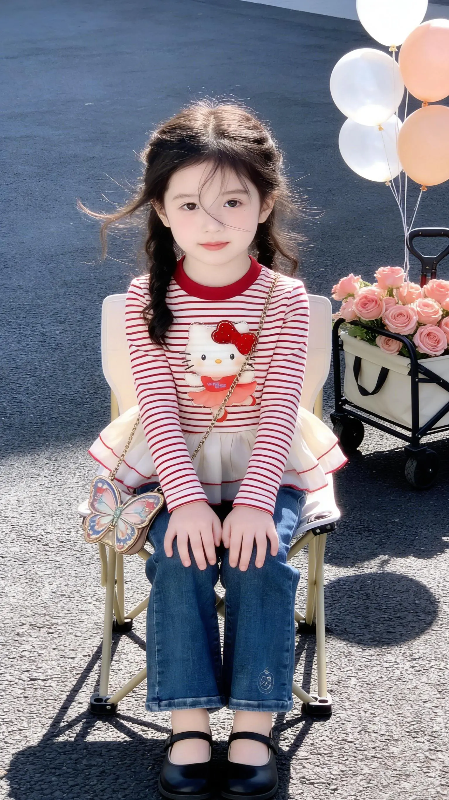 被问爆的女童套装。今日份甜妹已上线🍭 Hello Kitty条纹套装太戳我了! 软萌暴击💥 这套童装让女儿秒变韩剧小女主!