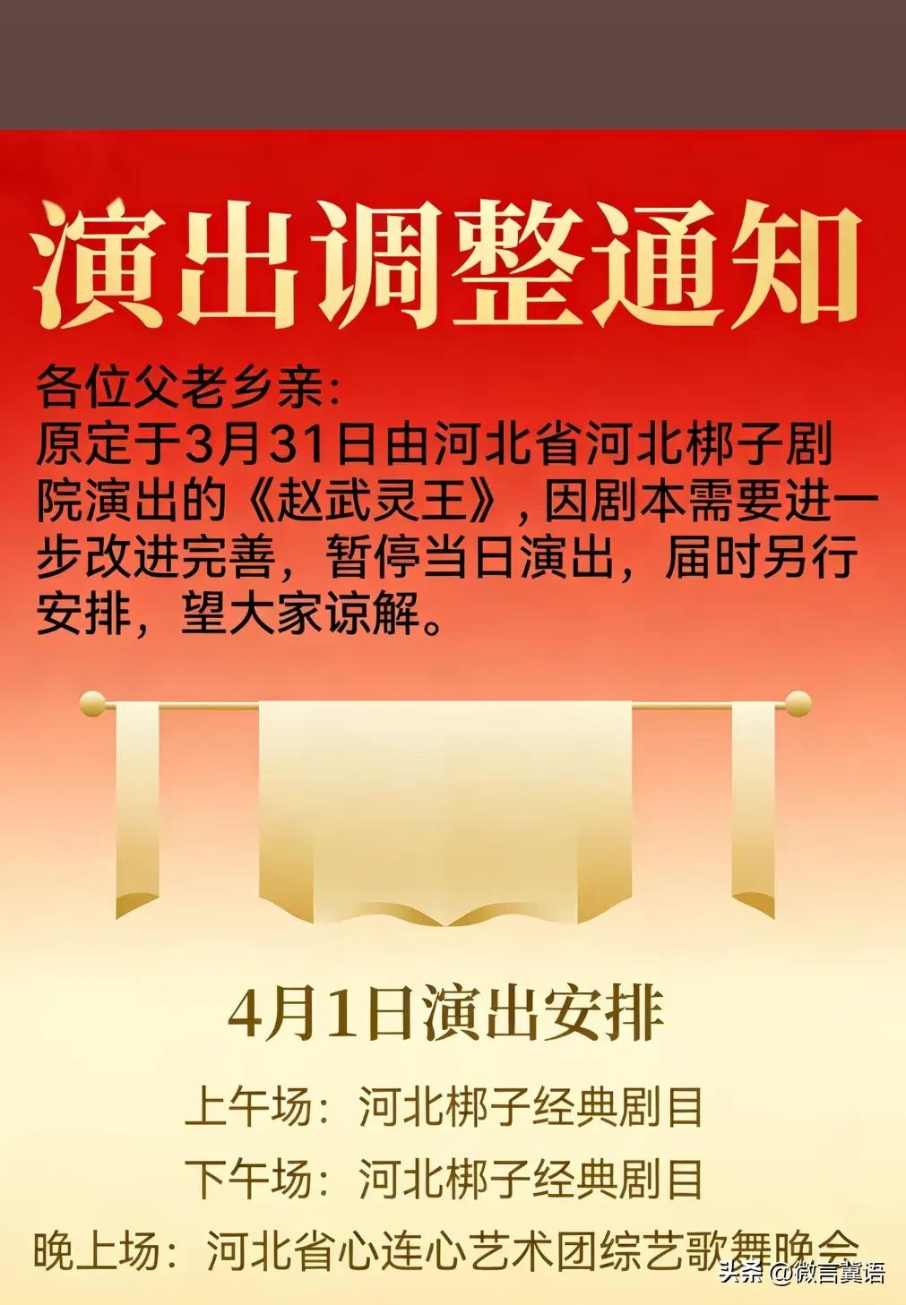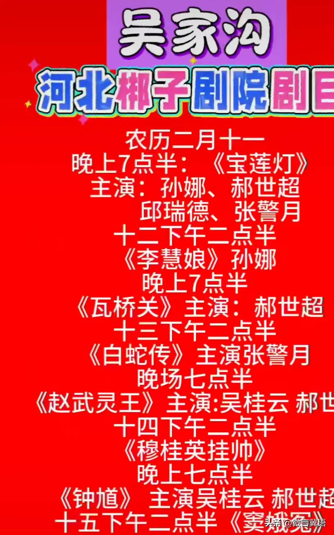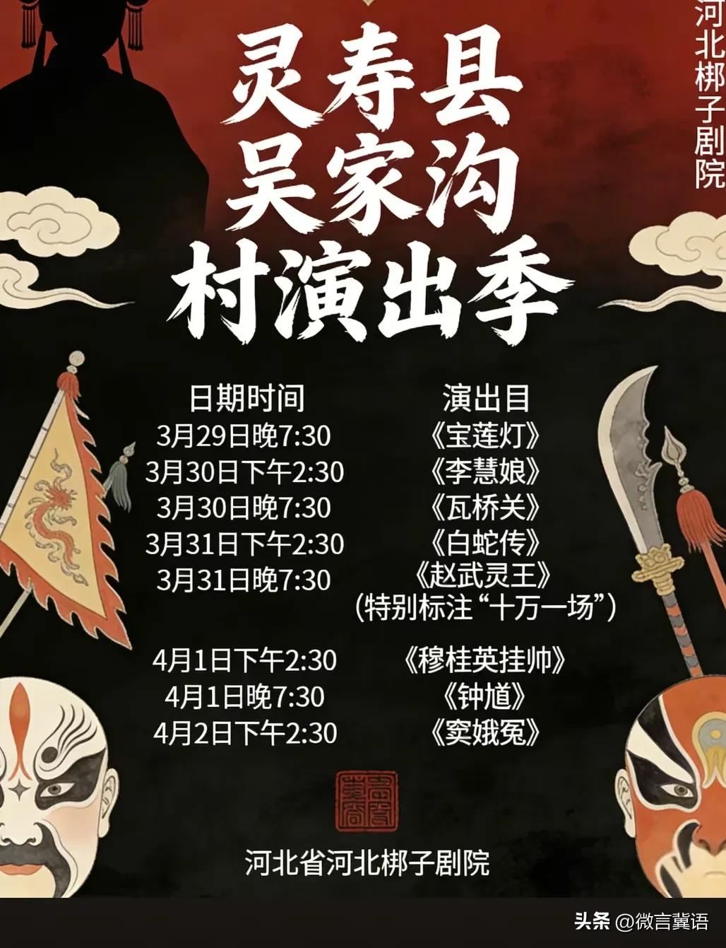 【10万太贵?《赵武灵王》不唱了?】石家庄灵寿县吴家沟唱大戏,演出剧目有调整了!原来10万元一场的《赵武灵王》由于剧本调整,暂停当日演出剧目!什么原因呢? 灵寿,战国时期此地乃中山国都城,后为赵国所灭,是这个原因调整的吗?既然是好几万一场的戏,一定是好戏,怎么马上演出了又需改进完善,估计是有原因的!咱就安排什么看什么吧! 看河北梆子的演出剧目,这应该是梆子剧院最强阵容了吧?昨天下午,看了李慧娘扮演者张警月表演动作,唱腔是真好! 河南有崔培军,河北有李海峰!大善人李海峰自2023年起,他已连续四年自费为乡亲们举办戏曲演出。2026年的演出从农历二月十一持续到二十三,邀请了河北省梆子剧院和漯河市豫剧团等,所有来看戏的人都可以免费吃饭。他每次会邀请河南省漯河市豫剧团等知名剧团,演出时长通常为十天左右,每场戏的费用高达三万元起步,每年的总花费可真不少啊。不过,今年捐赠的善款物品,还有许多志愿者自荐参加!灵寿是宝地,传递善良,传递爱心,大爱无疆! 带定位晒今日生活 信息图片来源网络侵权联删